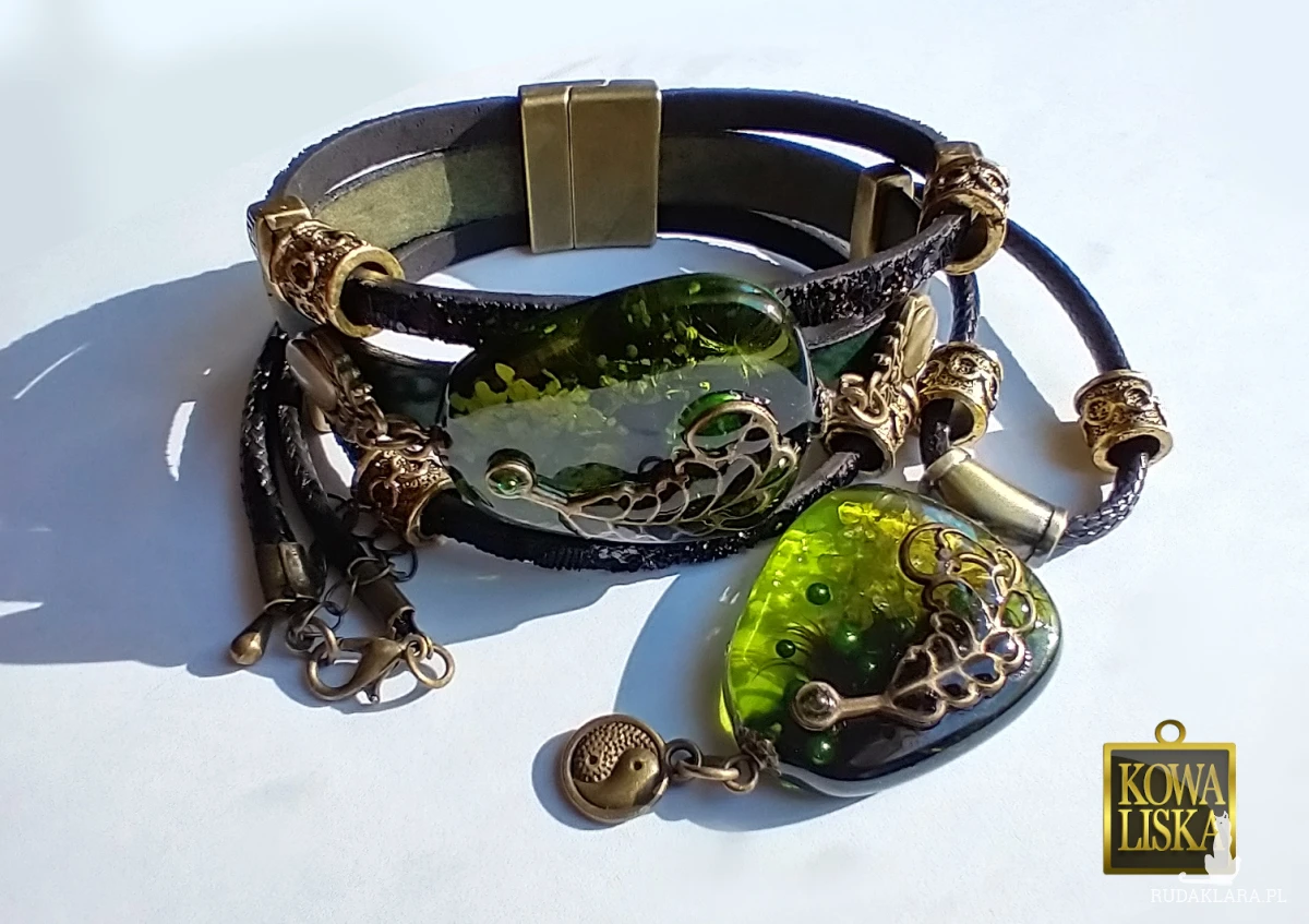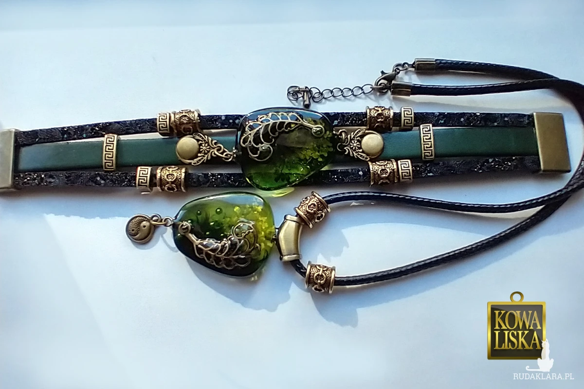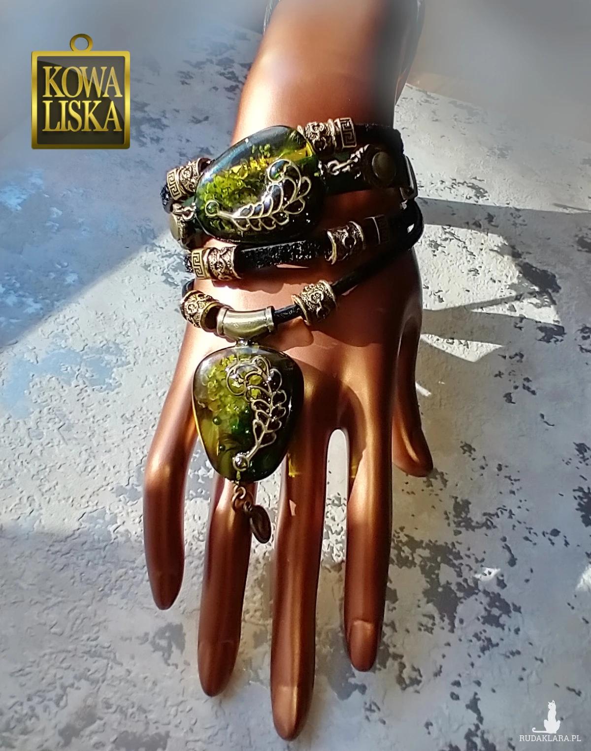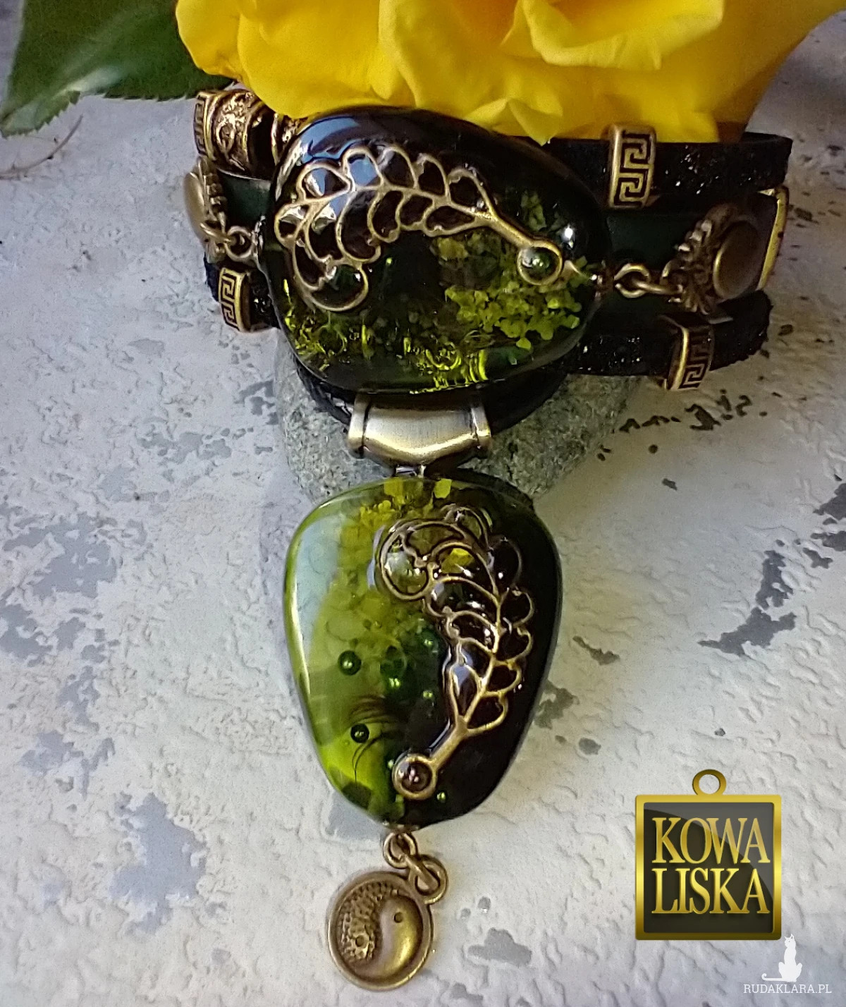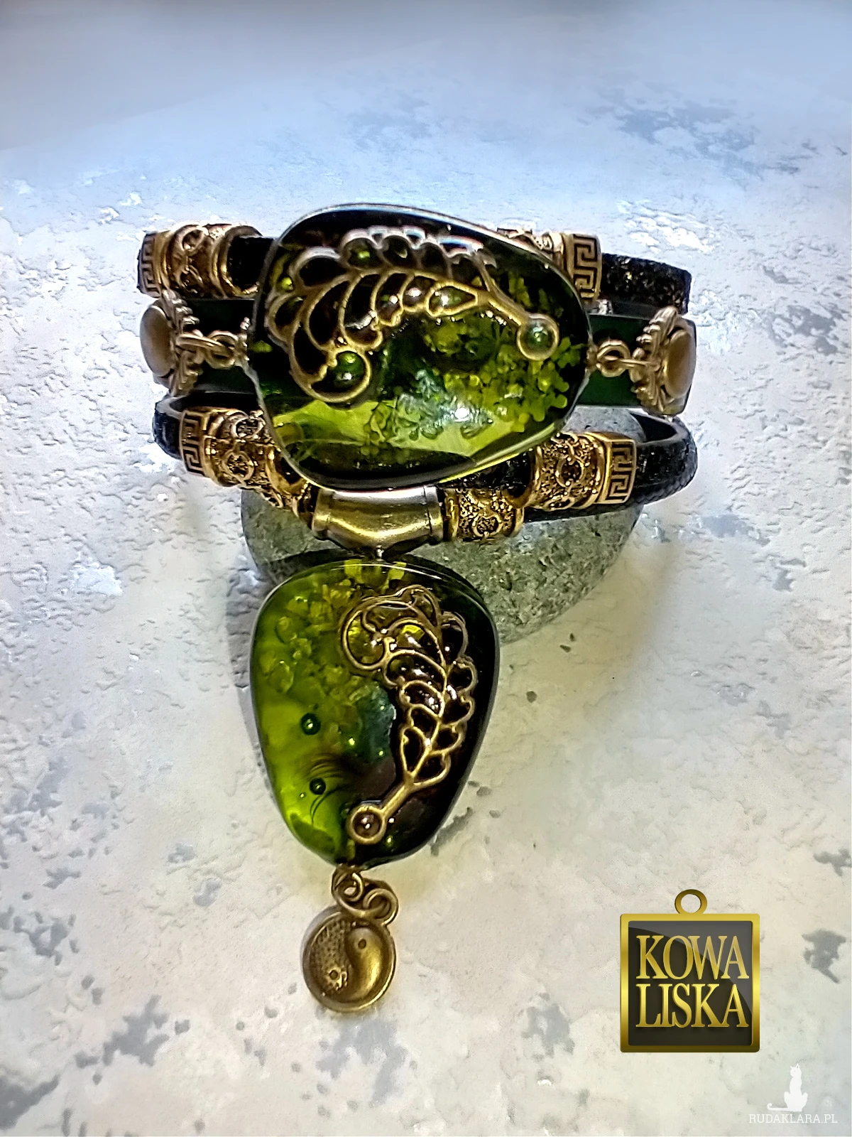 Głównymi elementami bransolety i naszyjnika są szkliste, obłe trapezy z kompozycją prawdziwych roślin, zatopioną w oliwkowej żywicy, ozdobione ornamentami. Metalowe ozdoby i okucia pięknie współgrają z ciepłą, świetlistą zielenią i krystalicznym blaskiem żywicy.