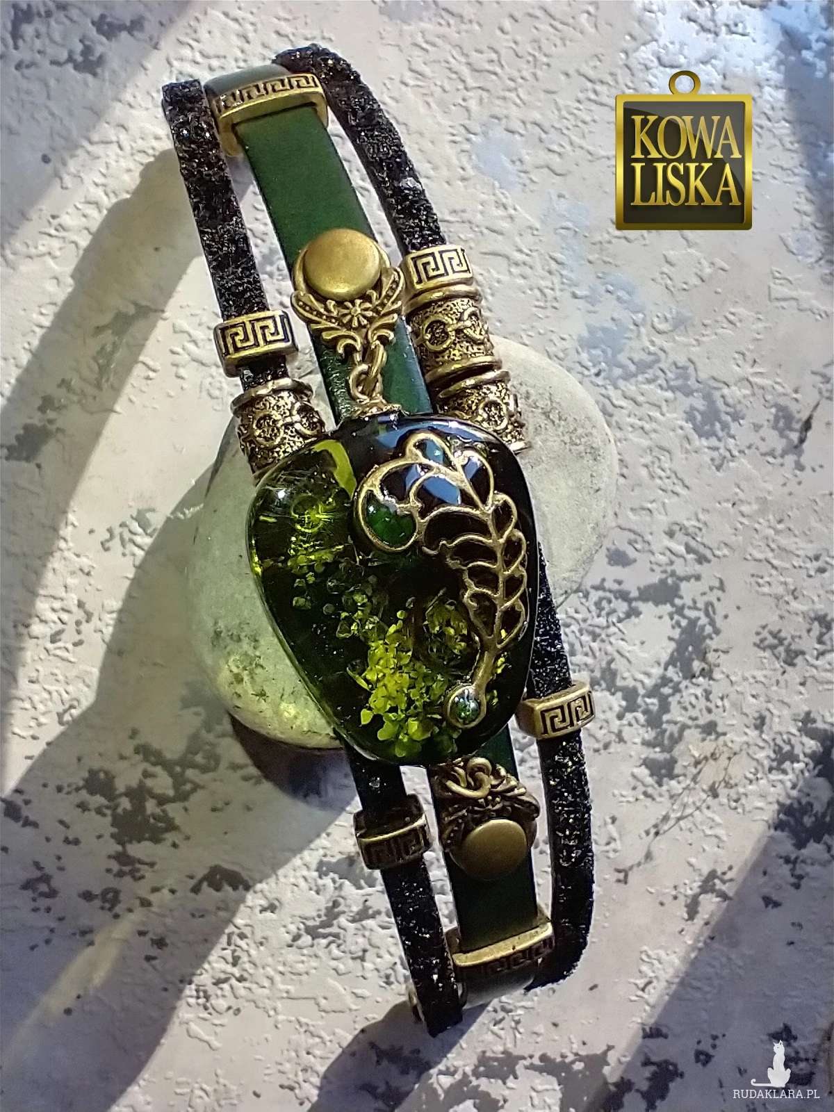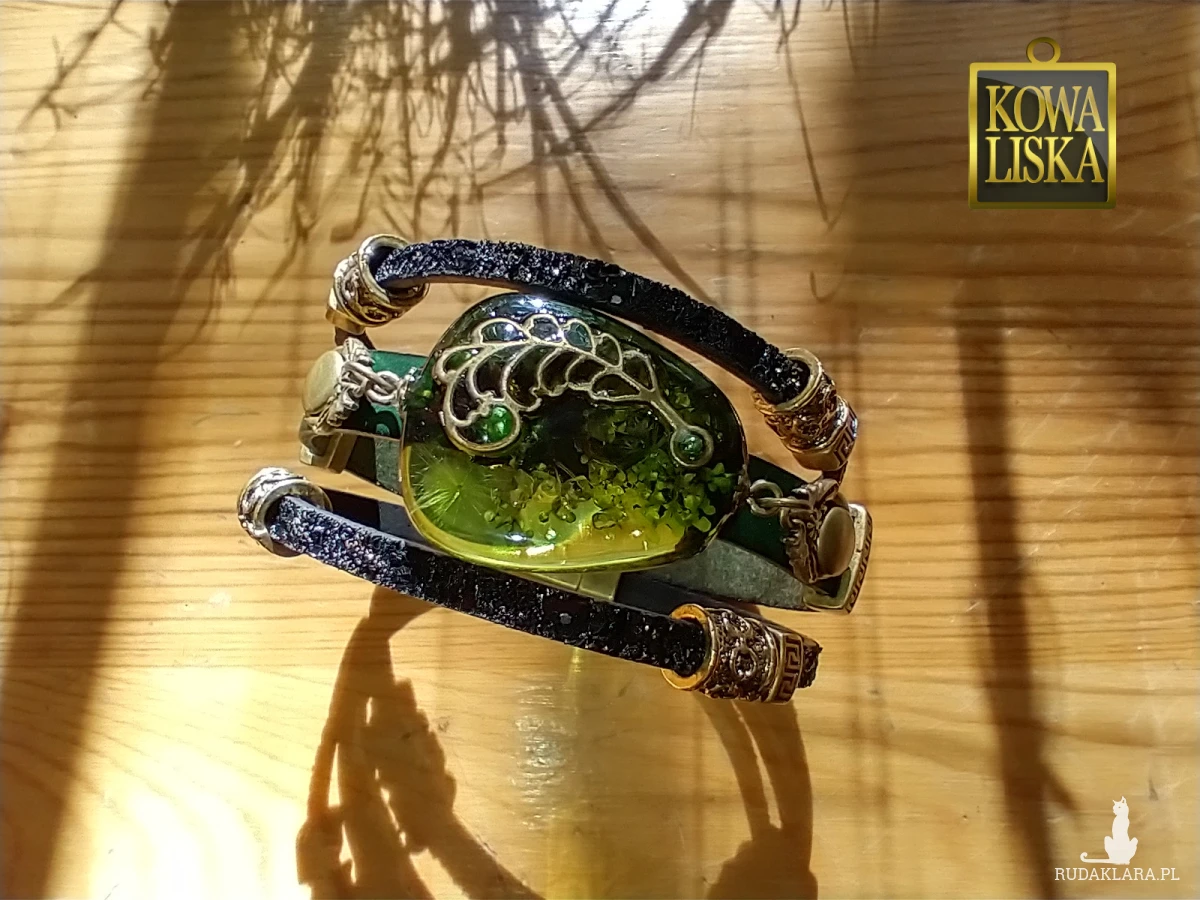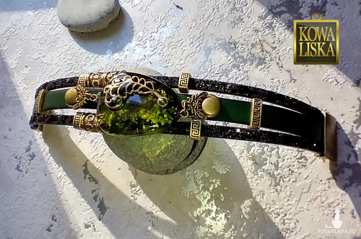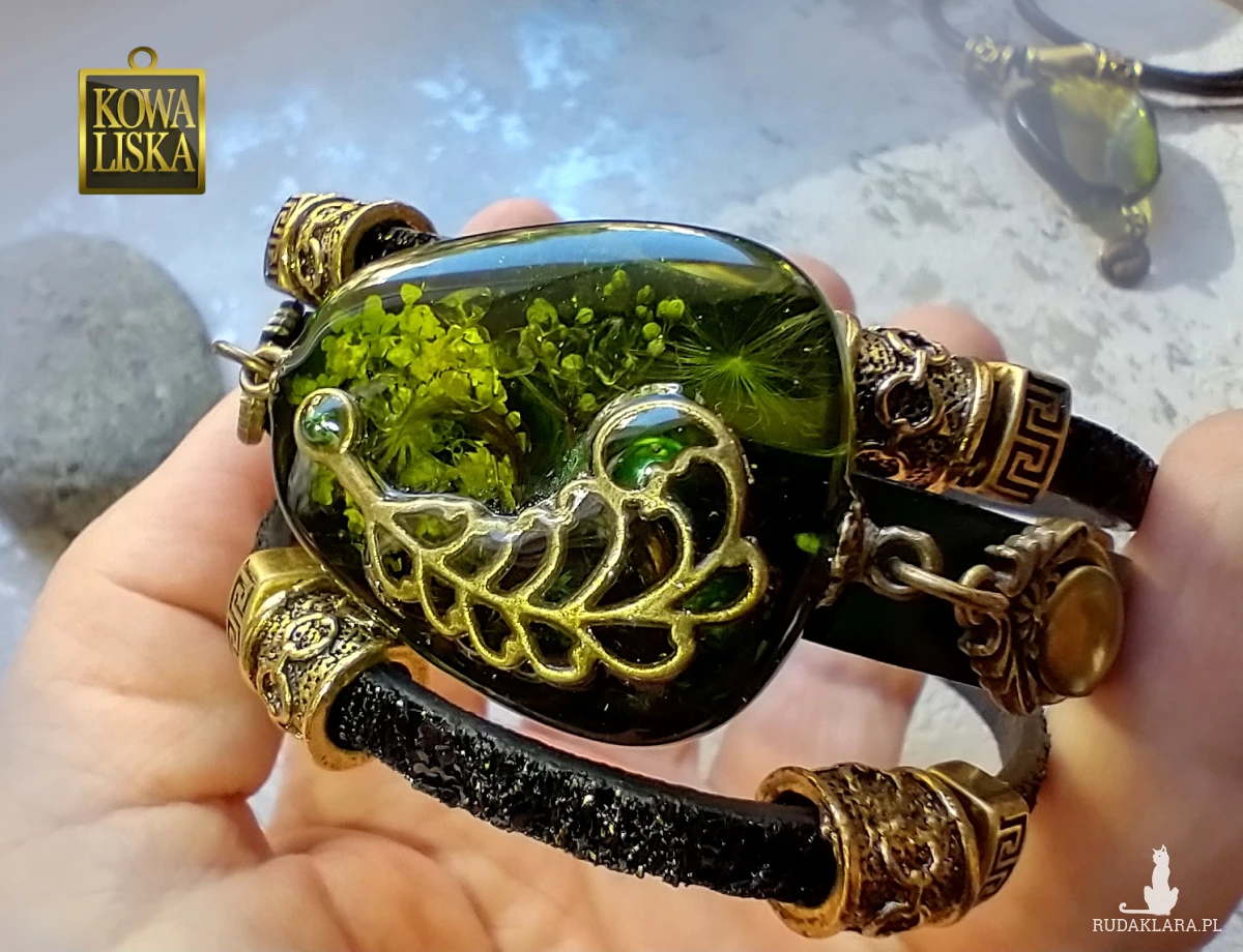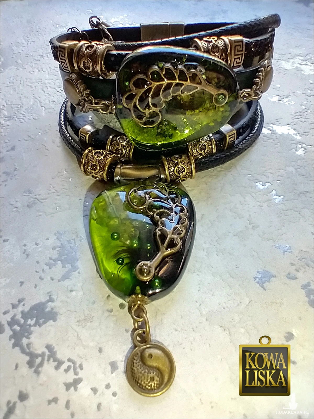 Głównymi elementami bransolety i naszyjnika są szkliste, obłe trapezy z kompozycją prawdziwych roślin, zatopioną w oliwkowej żywicy, ozdobione ornamentami. Metalowe ozdoby i okucia pięknie współgrają z ciepłą, świetlistą zielenią i krystalicznym blaskiem żywicy.
