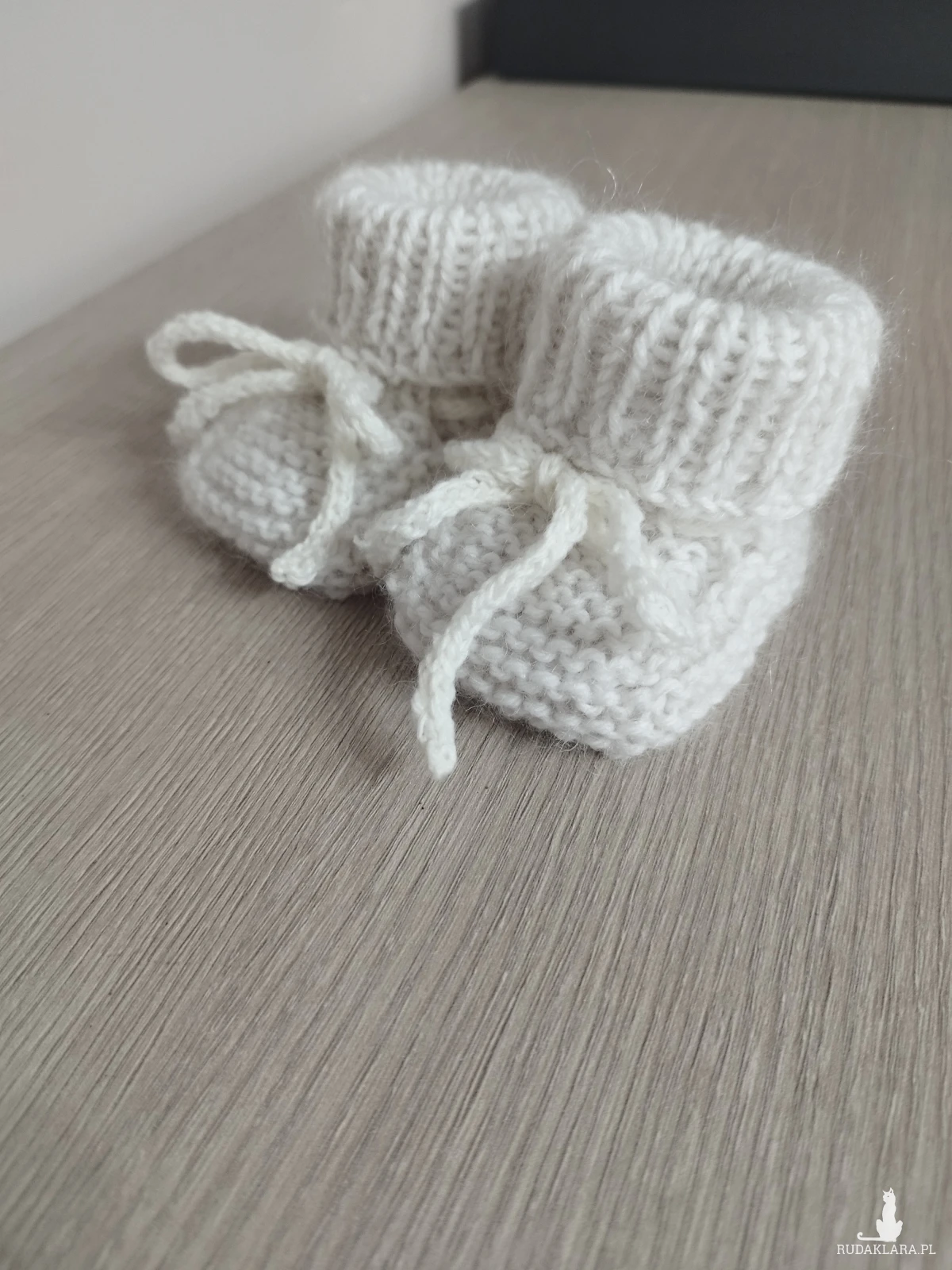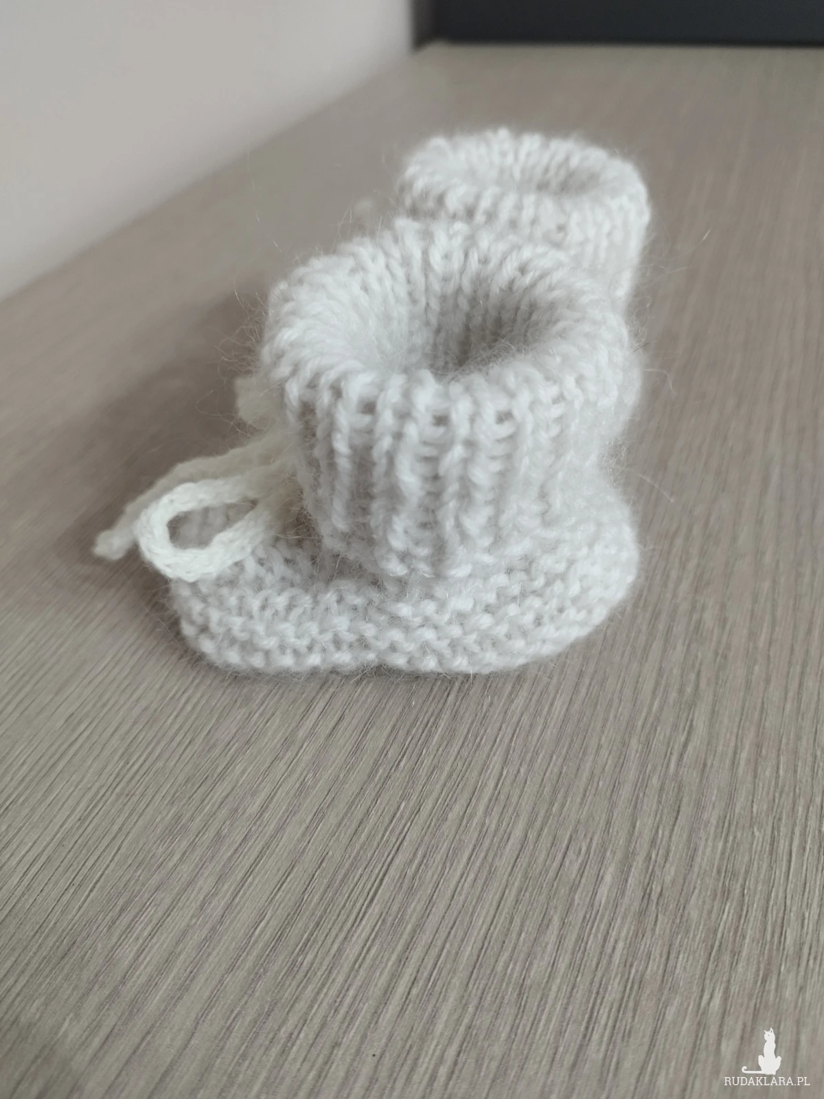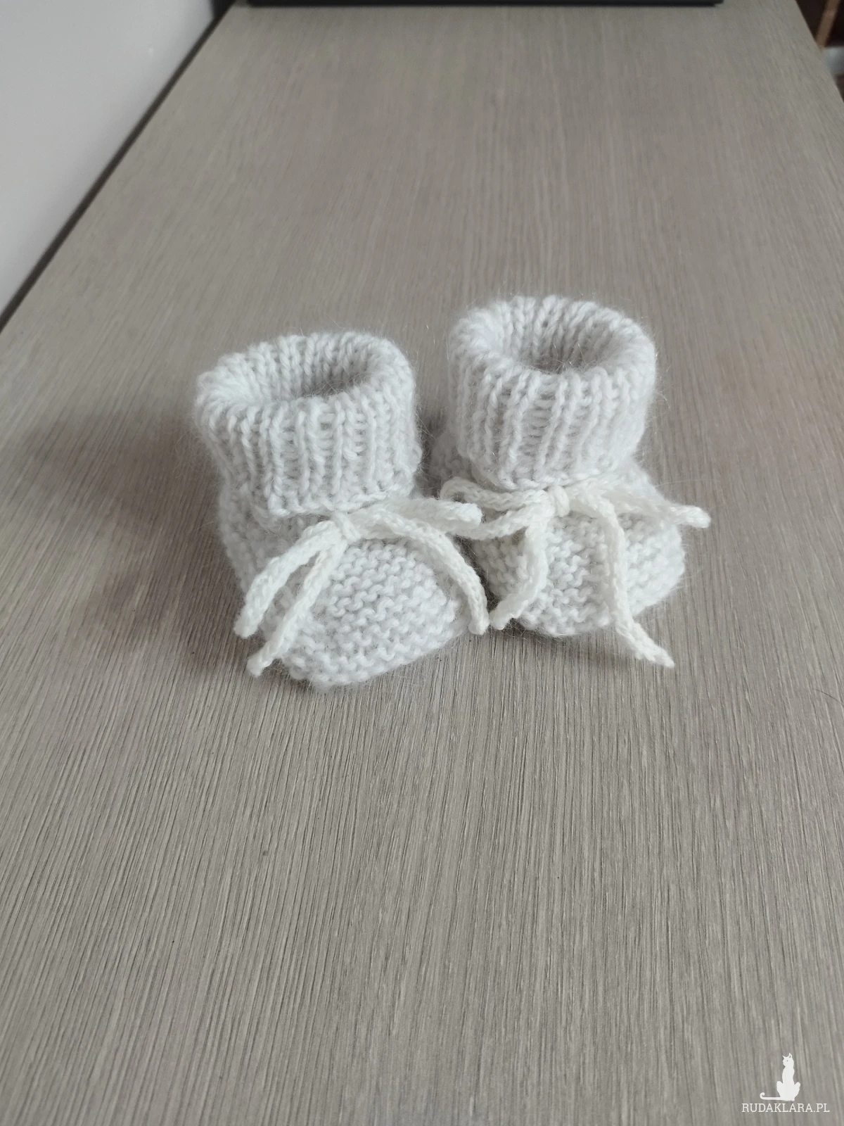 Buciki zrobione na drutach. Z przodu wiązane sznureczkiem. Skład wełna merino, moher i jedwab. Rozmiar 0-3mies