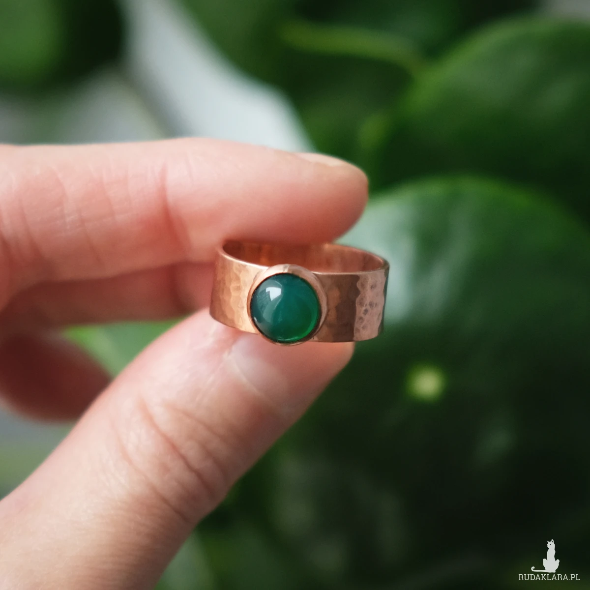 Pierścionek na szerokiej fakturowanej obrączce mieści w sobie kamień onyksu w zielonym kolorze. Pierścionek został wykonany ręcznie z miedzi, średnica kamienia 8 mm.