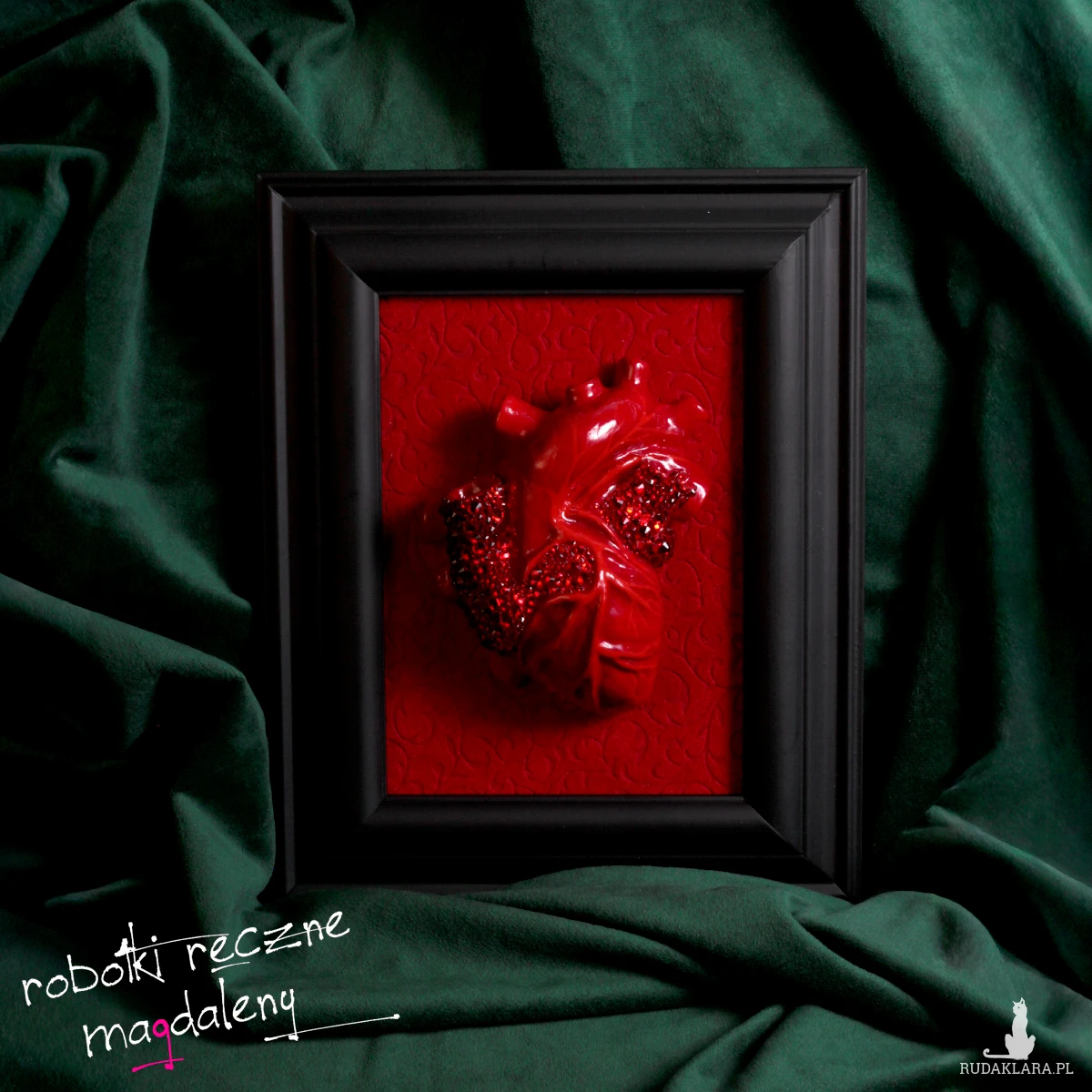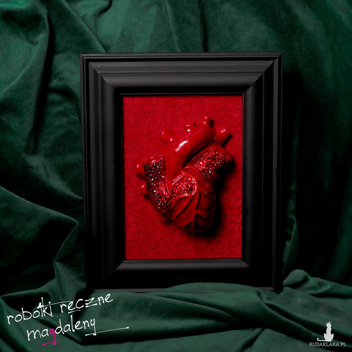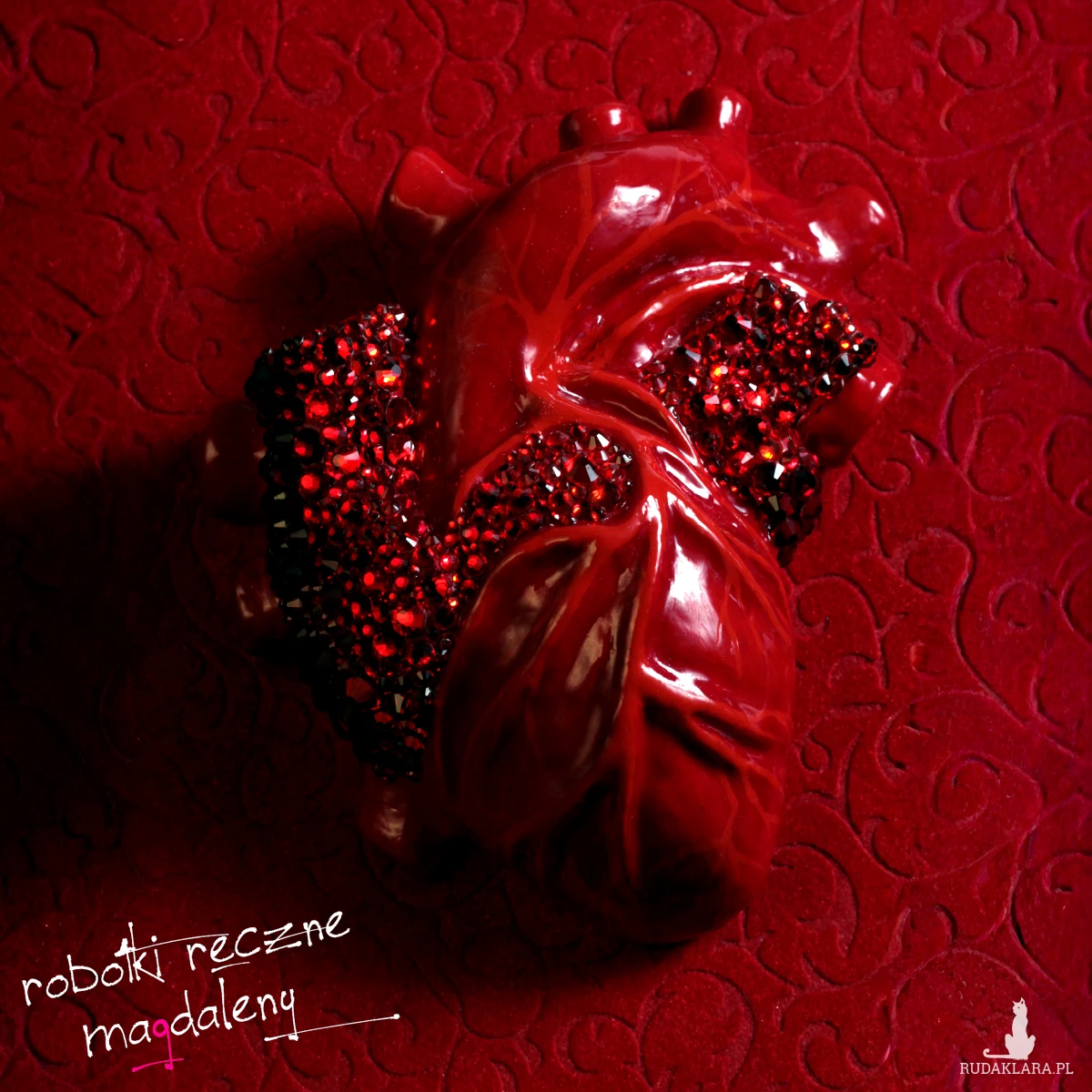 Odlew serca z gipsu polimerowego pomalowany farbami i zabezpieczony lakierem. Ozdobiony czerwonymi, szklanymi kryształkami.