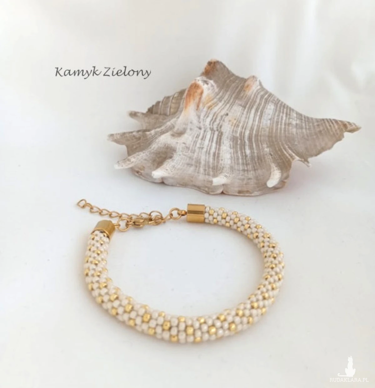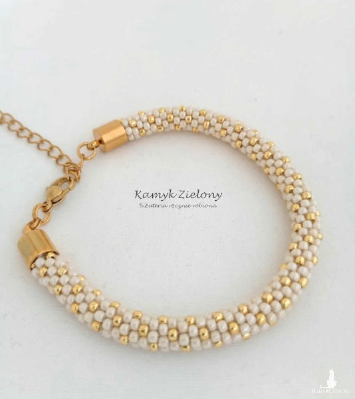 Do kompletu jest beżowa bransoletka w złote kropeczki, zapinana na karabińczyk.