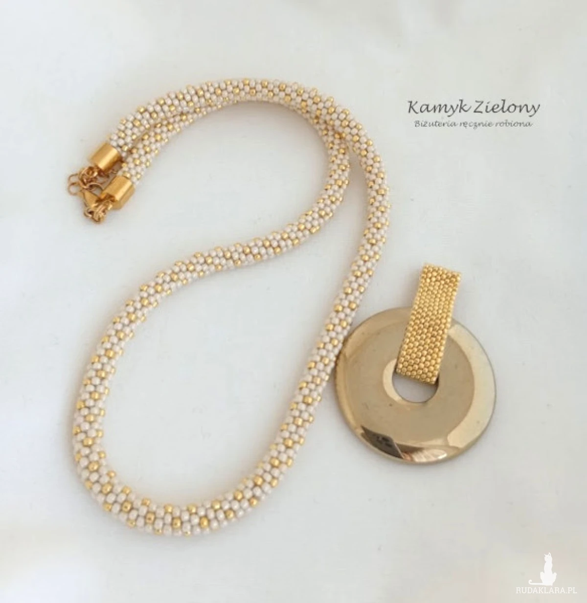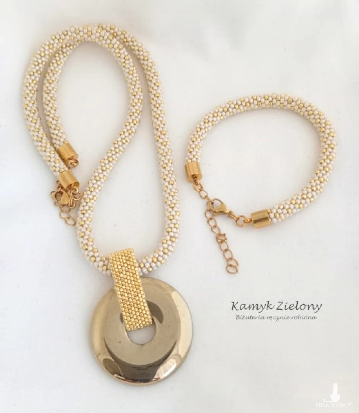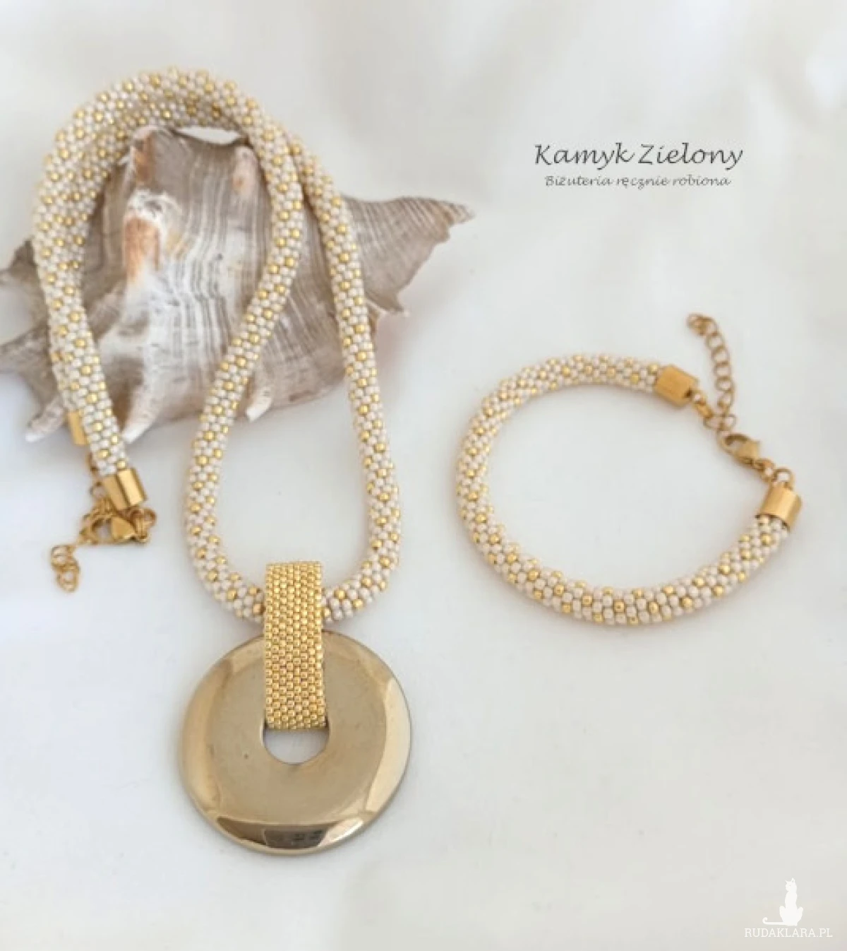 Komplet biżuterii składający się z naszyjnika i bransoletki, wykonany ręcznie z japońskich szklanych koralików Toho. Do jego zrobienia użyto koralików w błyszczącym beżowym kolorze oraz koralików złotych w odcieniu Starlight.