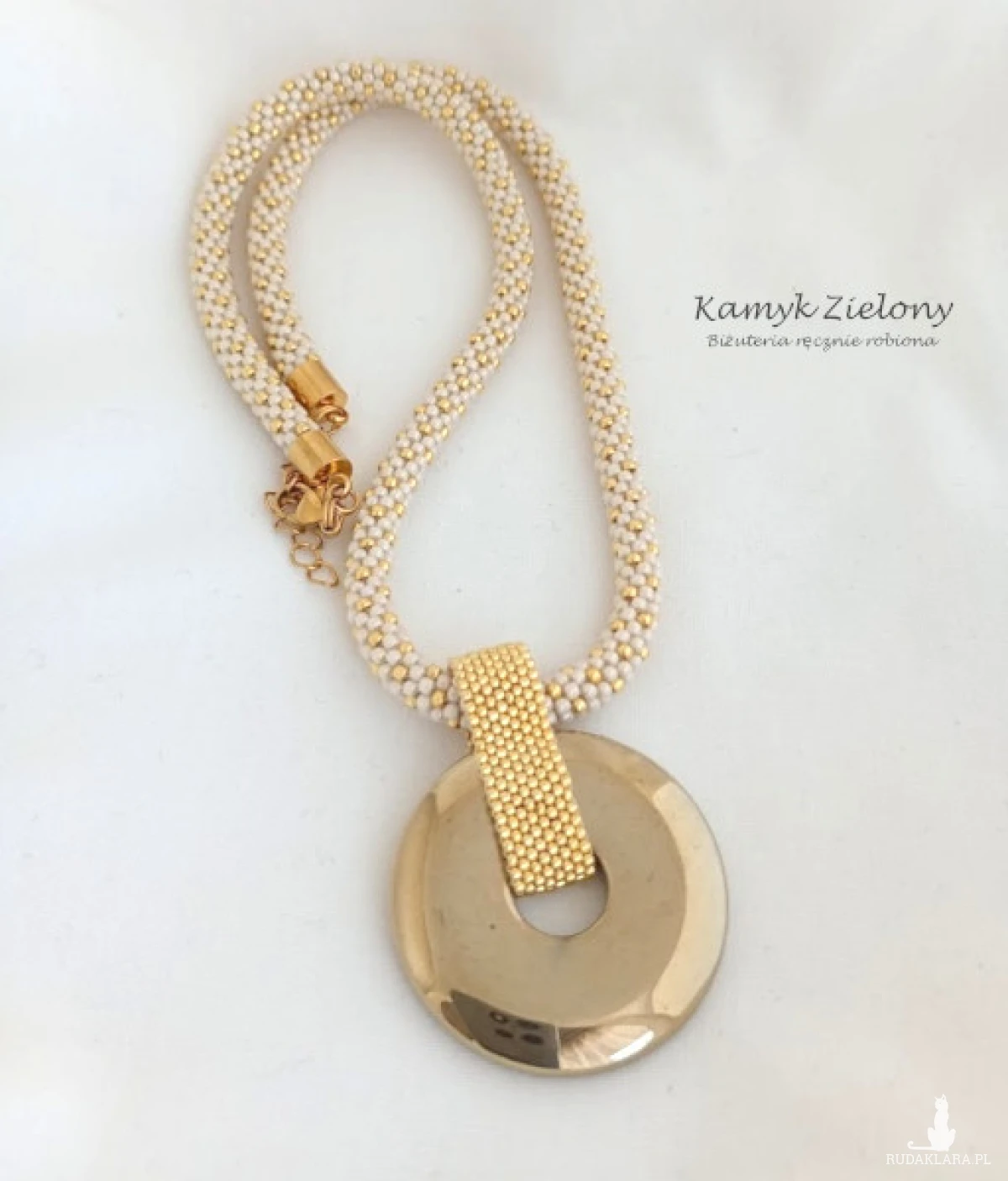 Naszyjnik ma formę cienkiego sznura koralikowego, na którym zawieszono dużą zawieszkę w kształcie oponki, wykonaną z hematytu w złotym kolorze.