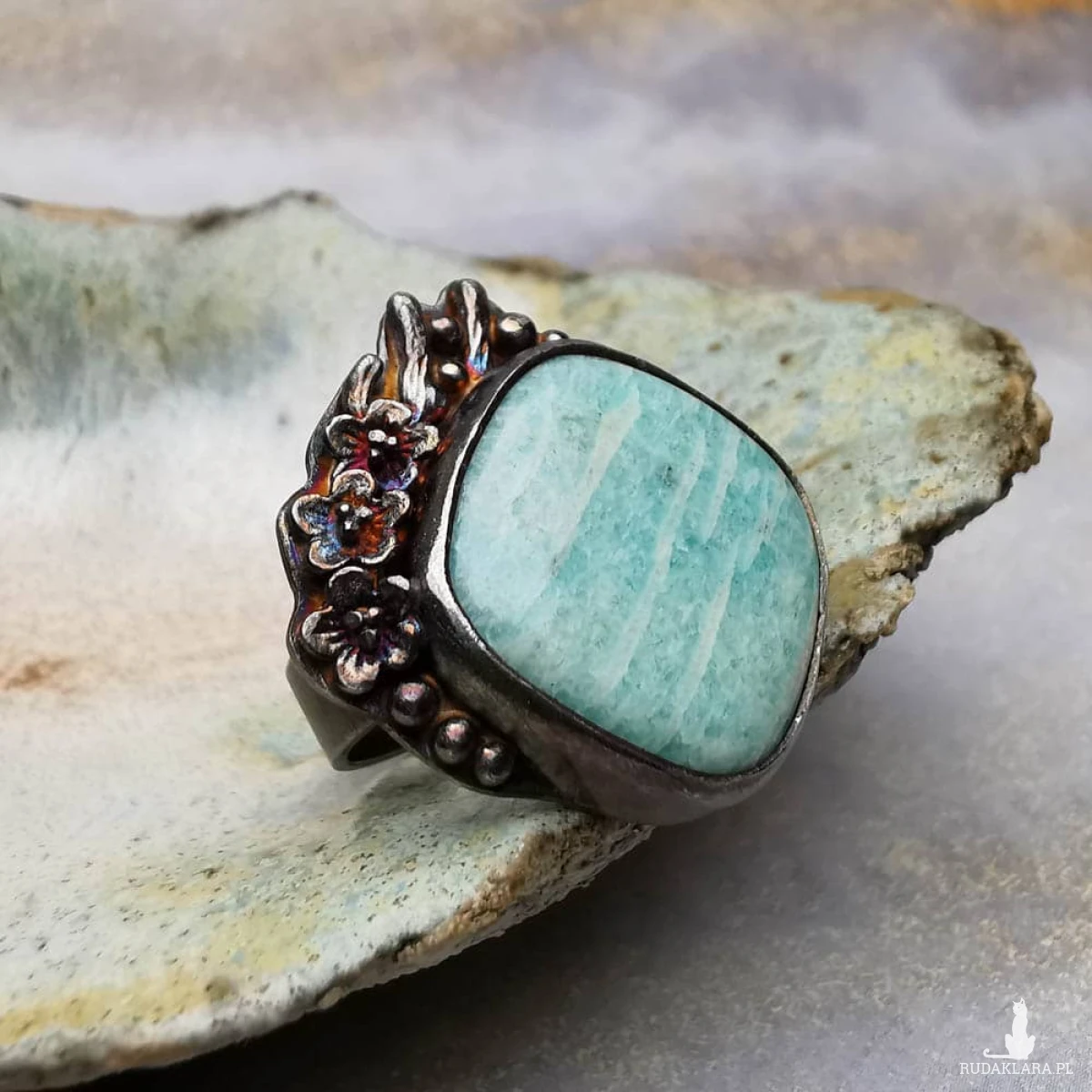 Srebrny pierścionek z amazonitem to wyjątkowa i oryginalna propozycja. Ręcznie robiona biżuteria zwraca uwaga nie tylko wielkością kamienia ale i wysoką jakością jej wykonania. Ciekawym dodatkiem jest kwiecista srebrna korona, która nadaje biżuterii romantycznego charakteru. Srebrny pierścionek z amazonitem to połączenie nowoczesności ze stylem retro. Jest świetnym dodatkiem; może być także niezapomnianym prezentem dla bliskiej osoby, która lubi otaczać się przedmiotami wykonanymi z najwyższą starannością.