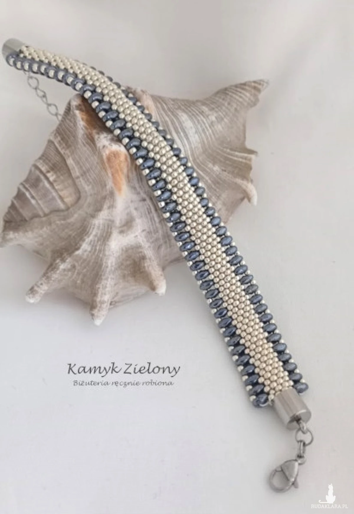 Bransoletka w formie dwustronnej gąsieniczki zrobiona została z doskonałej jakości koralików ze szkła japońskiej firmy Toho oraz czeskich koralików Preciosa (koraliki brzegowe). Dobrane w niej dwa kolory - hematytowy oraz srebrny pięknie ze sobą współgrają, tworząc wyjątkową i bardzo oryginalną ozdobę.