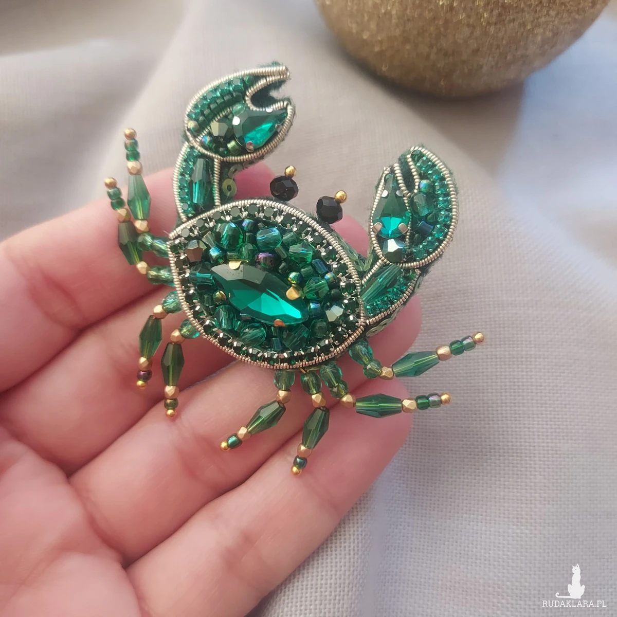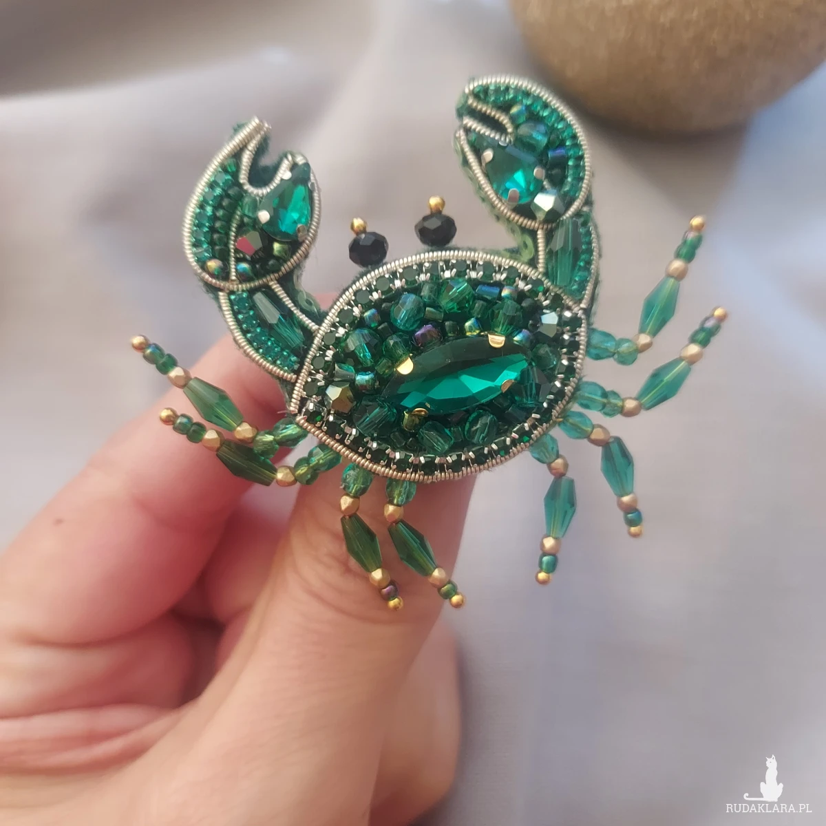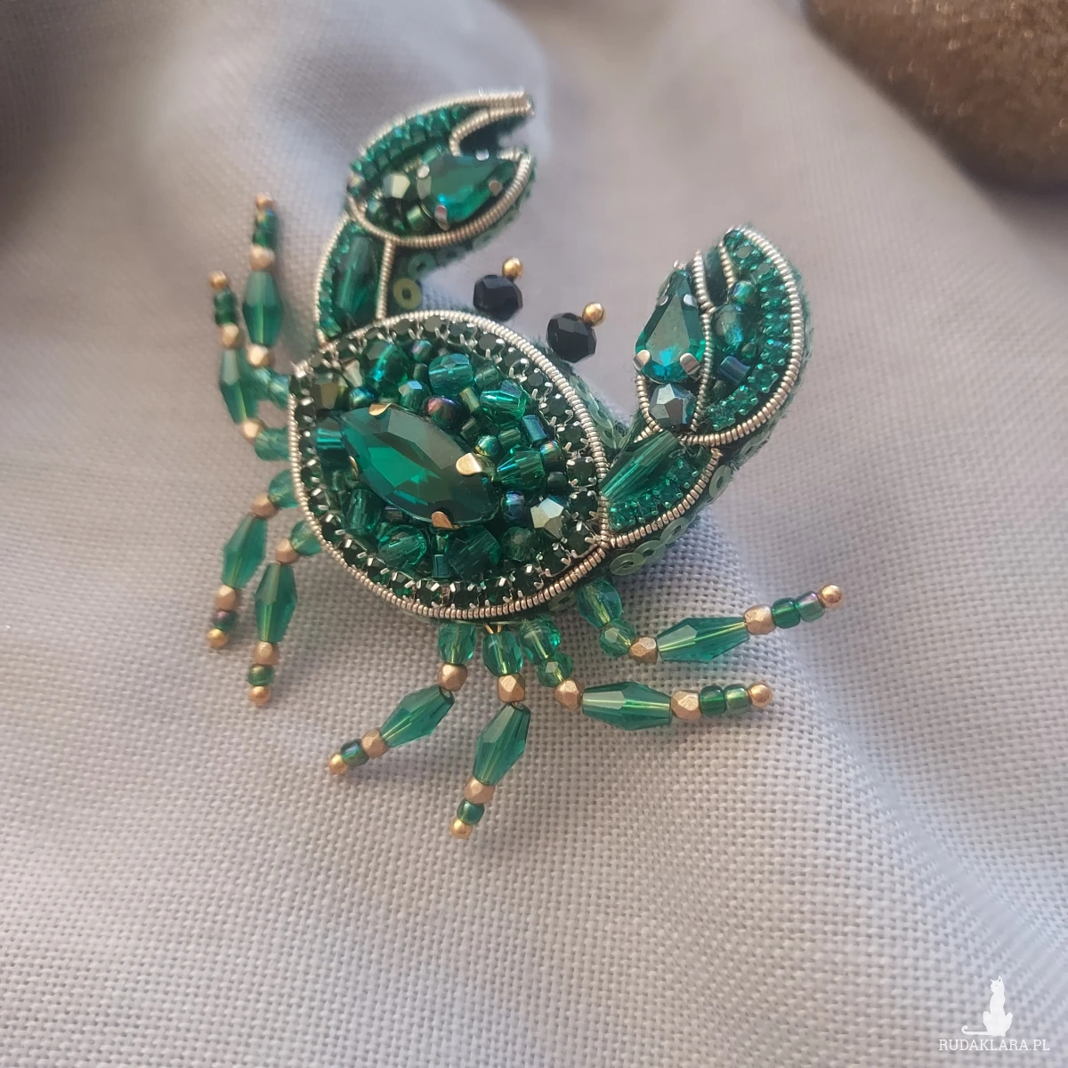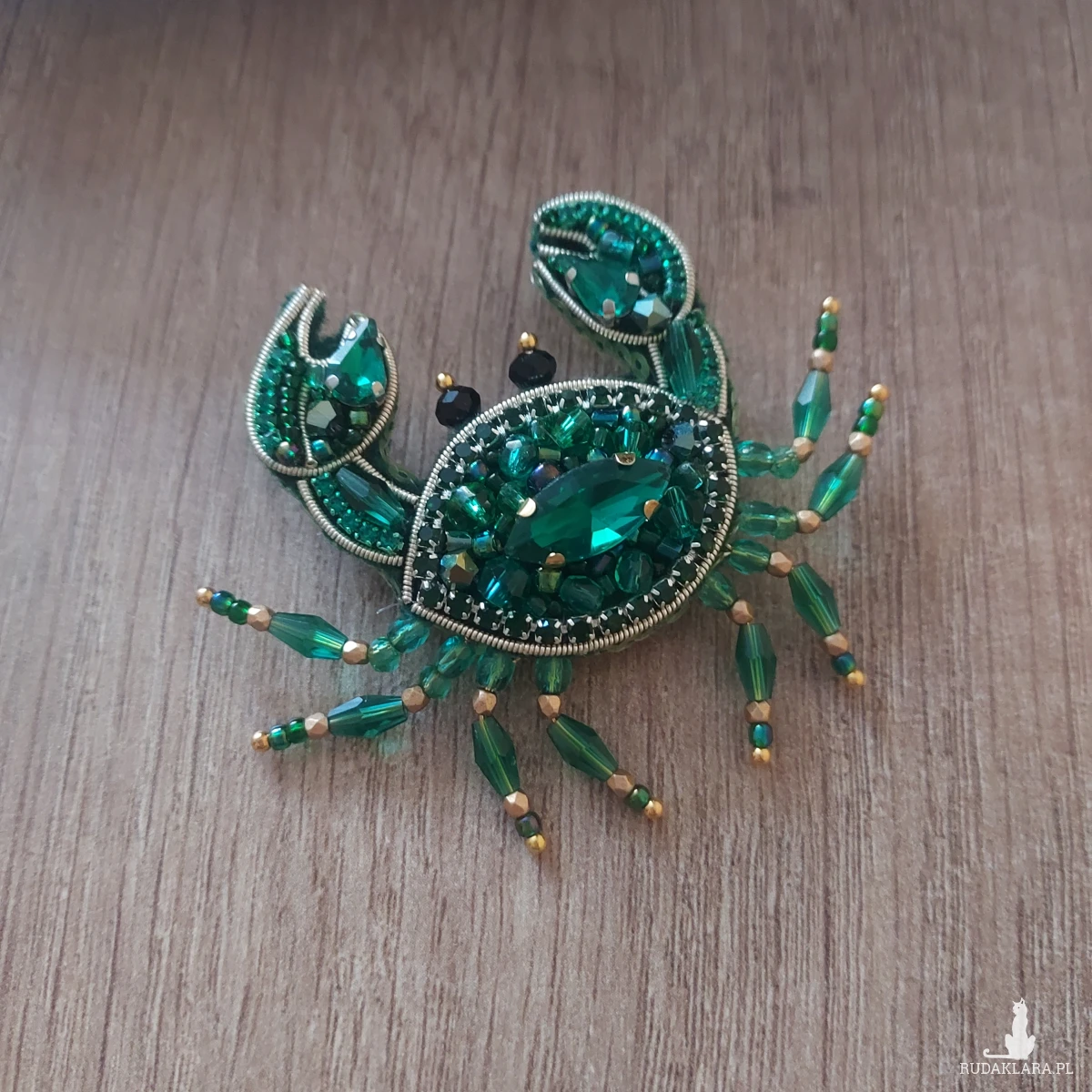 Zanurz się w świat morskich głębin z wyjątkową broszką KRABA w kolorze szmaragdowym. Powstała techniką haftu koralikowego.
