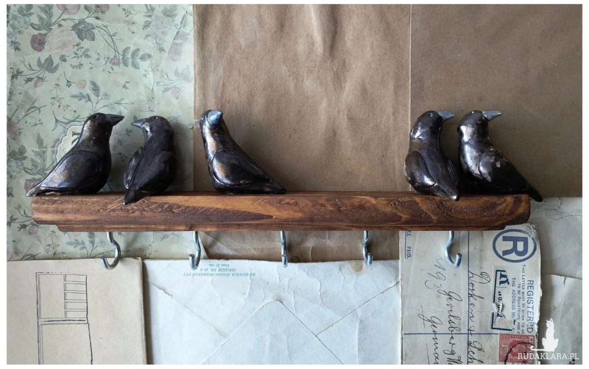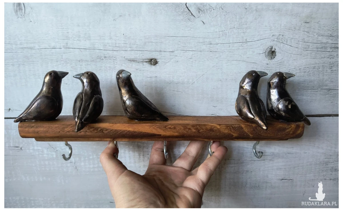 Stylizowany wieszak drewniany o długości 35 cm, z delikatnym frezem, na 4 haczyki, ozdobiony ceramicznymi ptaszkami wykonanymi z gliny ceramicznej. Dodatki wypalone zostały na biskwit, a następnie poszkliwione w temperaturze 1260 stopni C. Z tytułu wygodne mocowanie w postaci zawieszek. Serdecznie polecam!!!