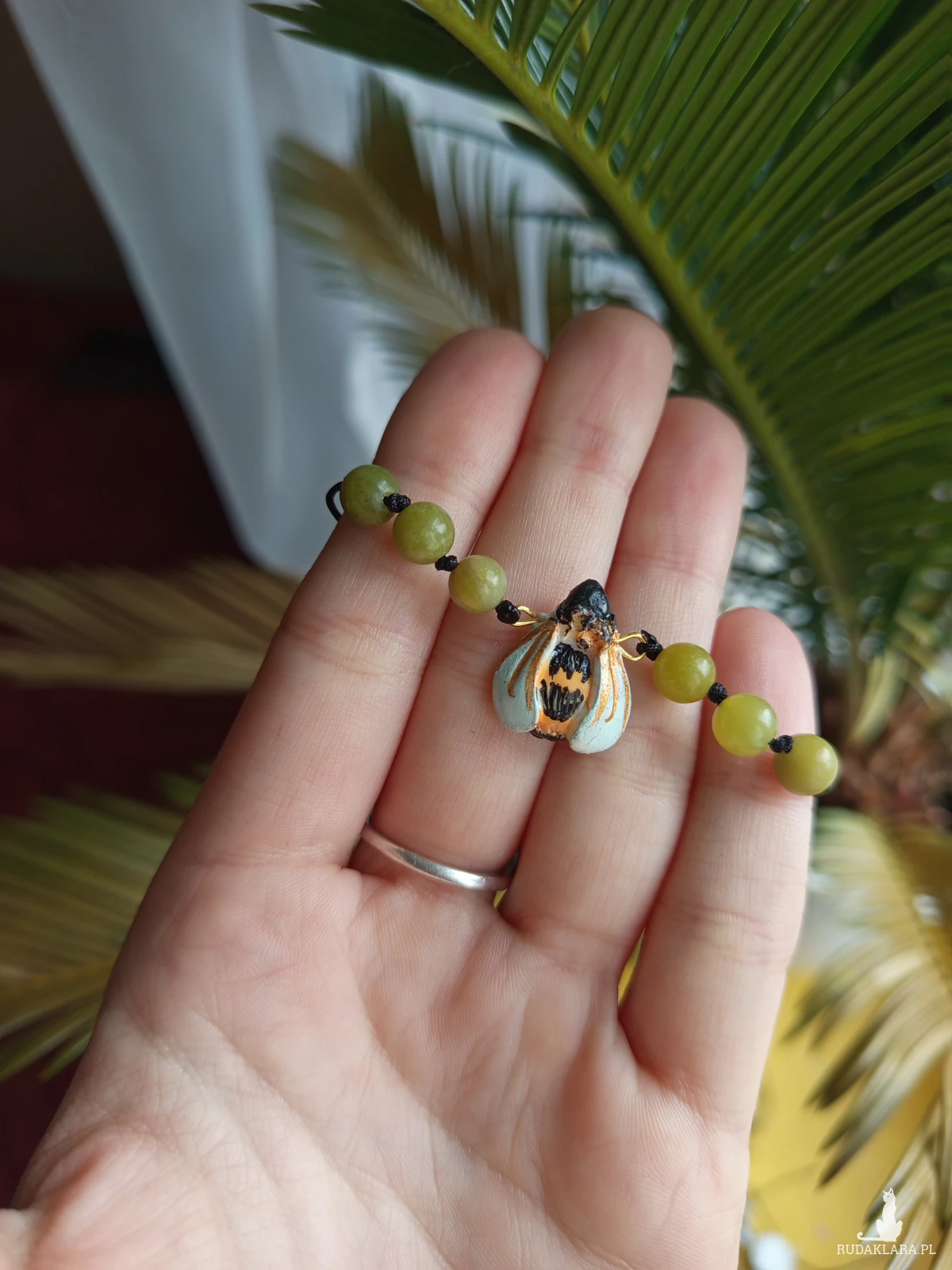 Symbol natury i energii zamknięty w unikalnej formie. Ta ręcznie wykonana bransoletka zdobiona jest uroczą pszczółką z glinki polimerowej, która przyciąga spojrzenia i dodaje radosnego, leśnego akcentu. Towarzyszą jej kamienie serpentynitu