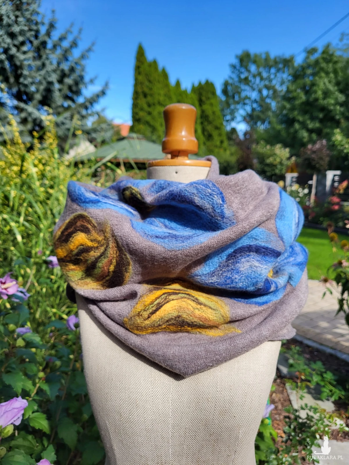 Super prezent na dzień mamy niebieski filcowany wełniany miły i ciepły komin handmade, zdjęcie trochę przekłamuje kolor ten granat jest bardziej podobny do jeansu tak jak na zdjęciu dołączonym przykładowym- tuba, owijany dwa razy, filcowany wełną merynosów, bardzo ciepły i miły, doskonały na prezent, fantastyczny na codzienne noszenie, zwraca uwagę, dodaje koloru, nie zginiesz w tym kominie na ulicy, pojedyncze egzemplarze, polecam bestseller- Ruda Klara czas oczekiwania półtora tygodnia
