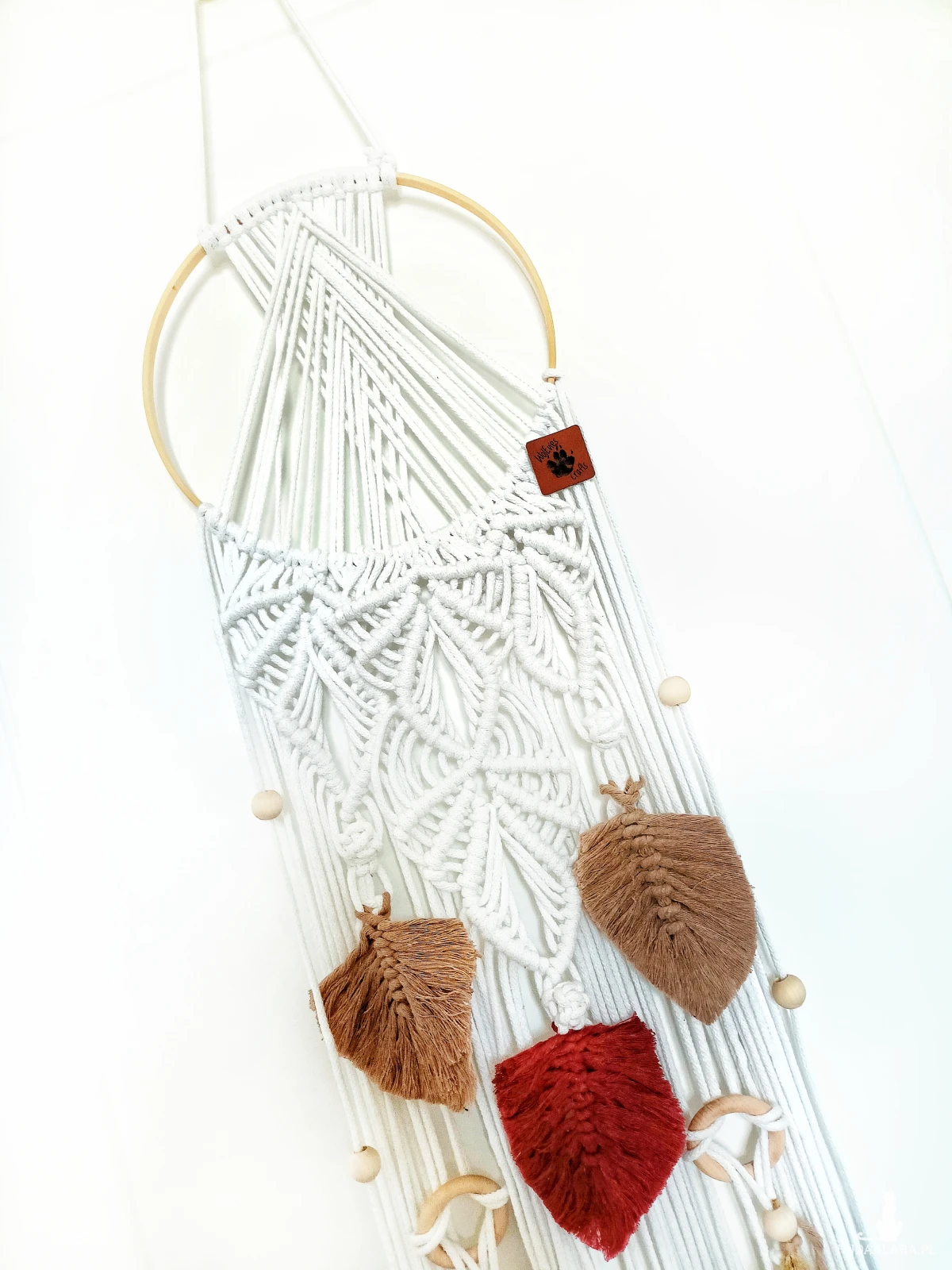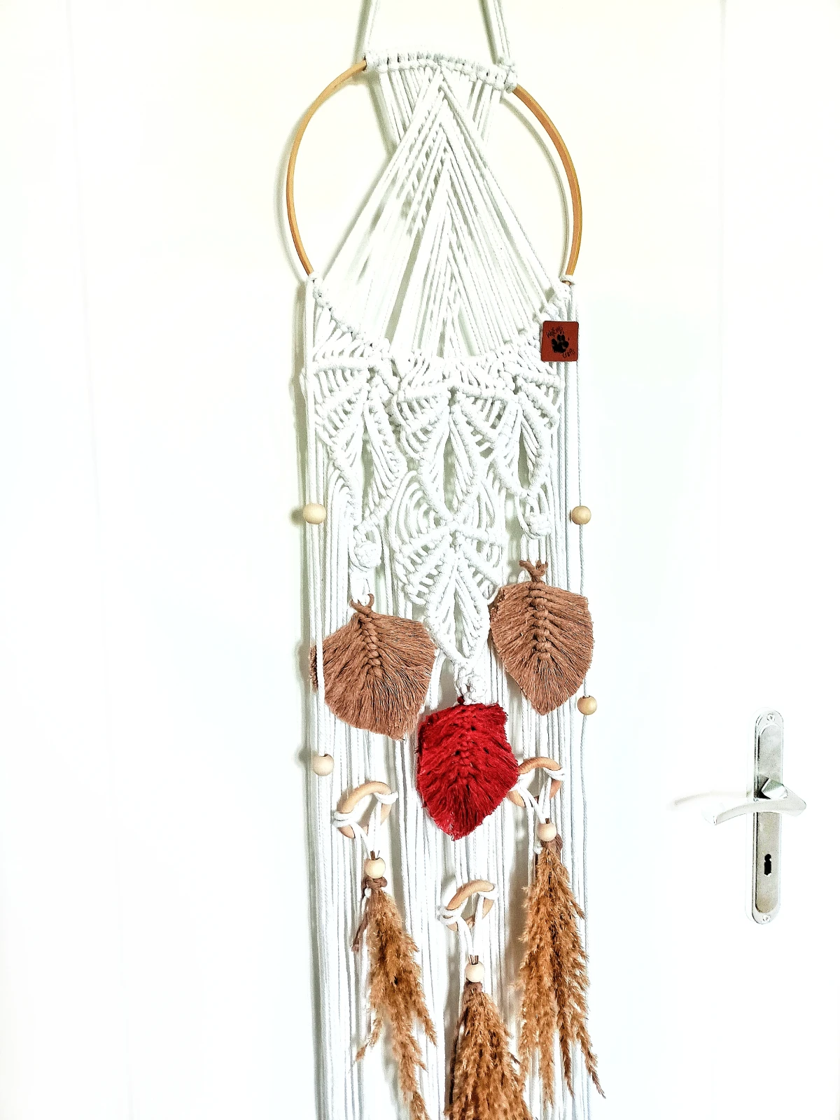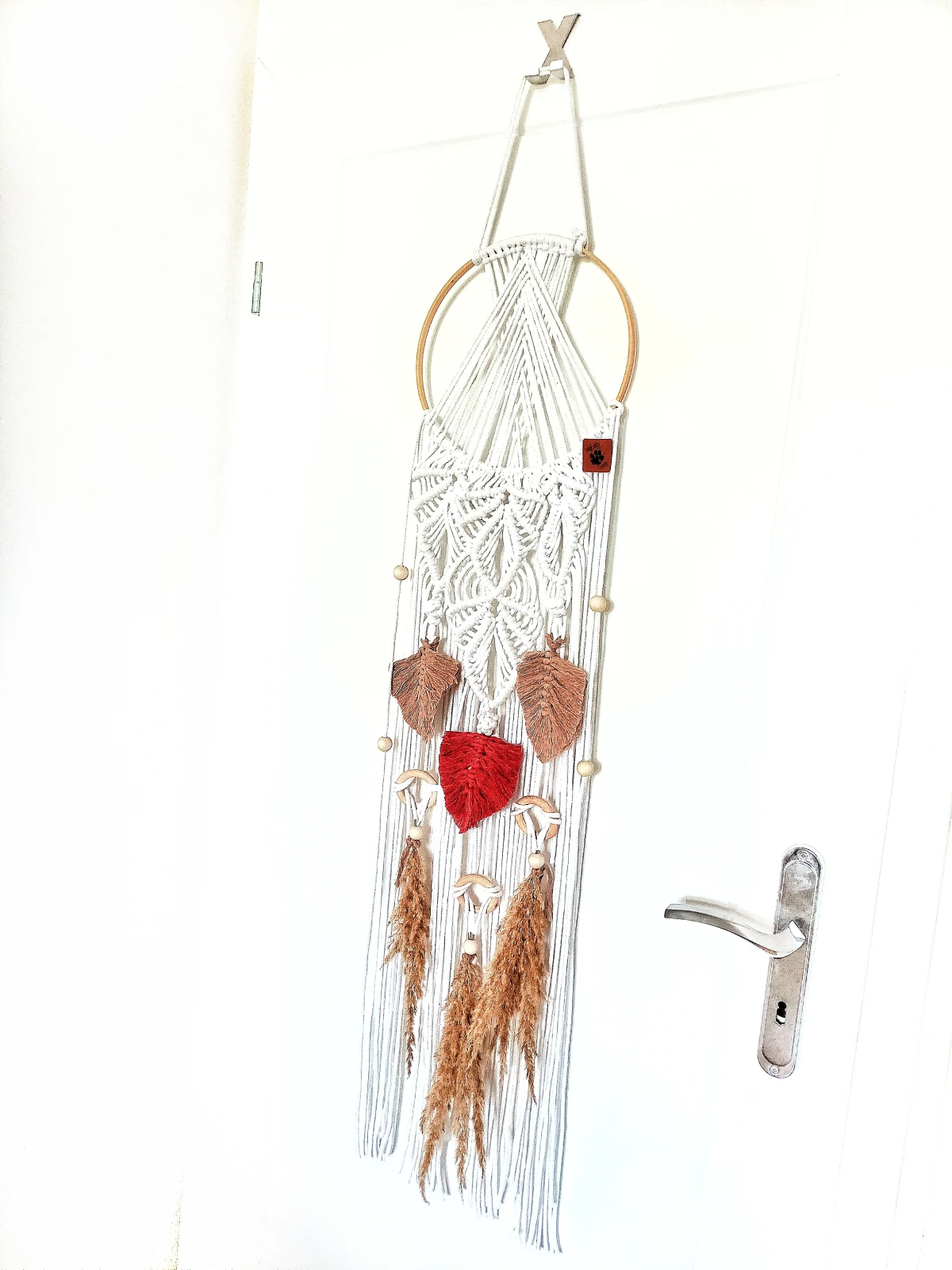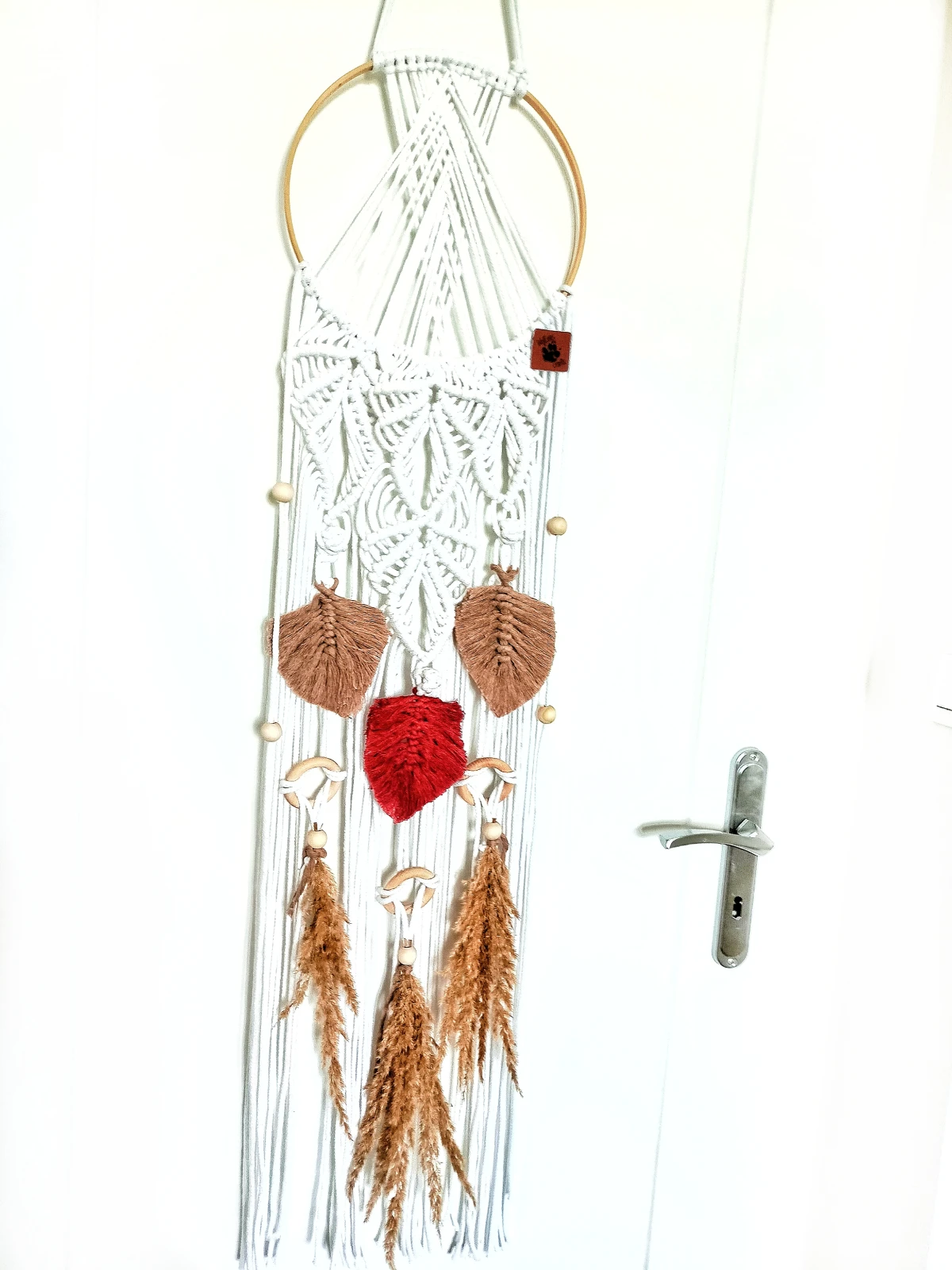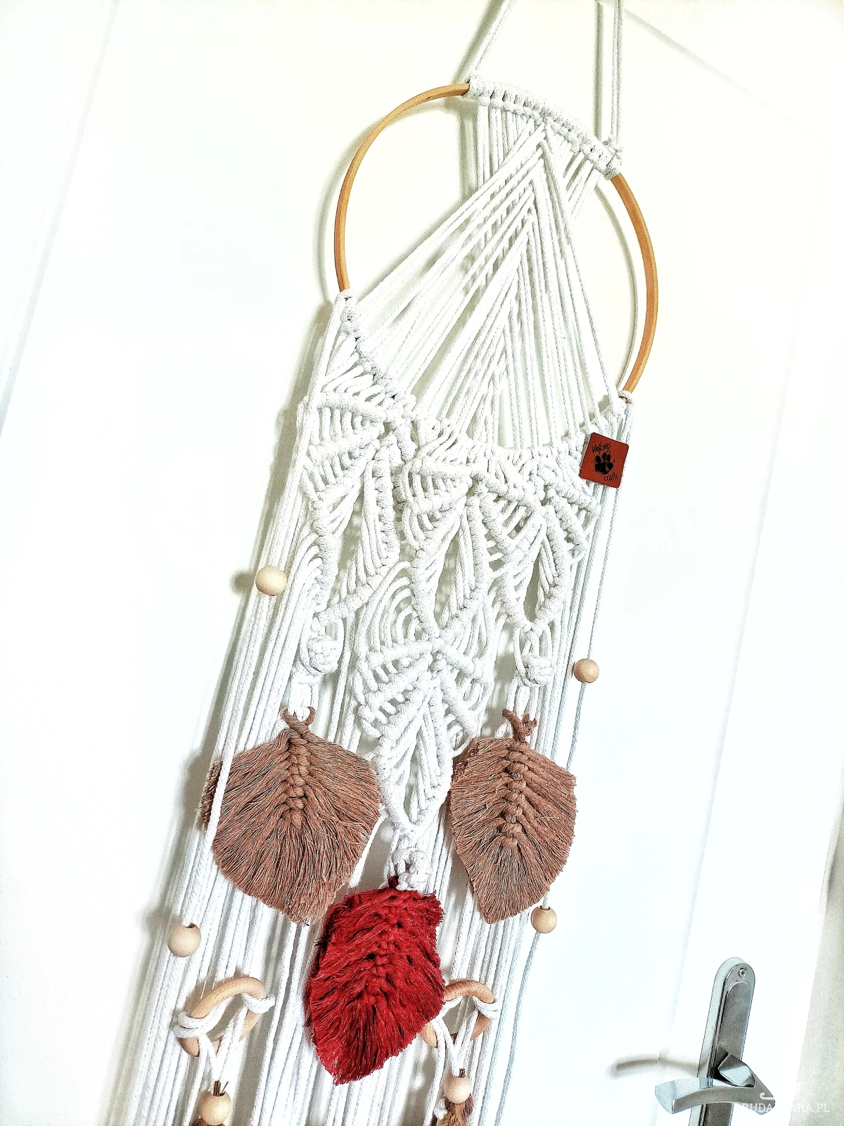 łapacz snów makrama handmade • dekoracja ścienna boho • łapacz snów biały • makrama z drewnianymi koralikami • łapacz snów boho do sypialni • makrama z listkami • łapacz snów z trawą pampasową • dekoracja ręcznie robiona • naturalna ozdoba na ścianę • łapacz snów prezent handmade