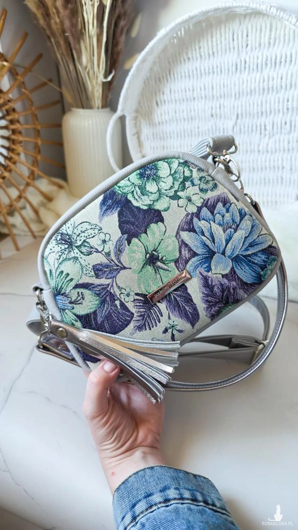 Torebka została uszyta z ekoskóry w kolorze szarym, krótki pasek i chwost to ekoskóra w kolorze srebrnym (błyszczącym), przedni panel to tkanina gobelinowa.
