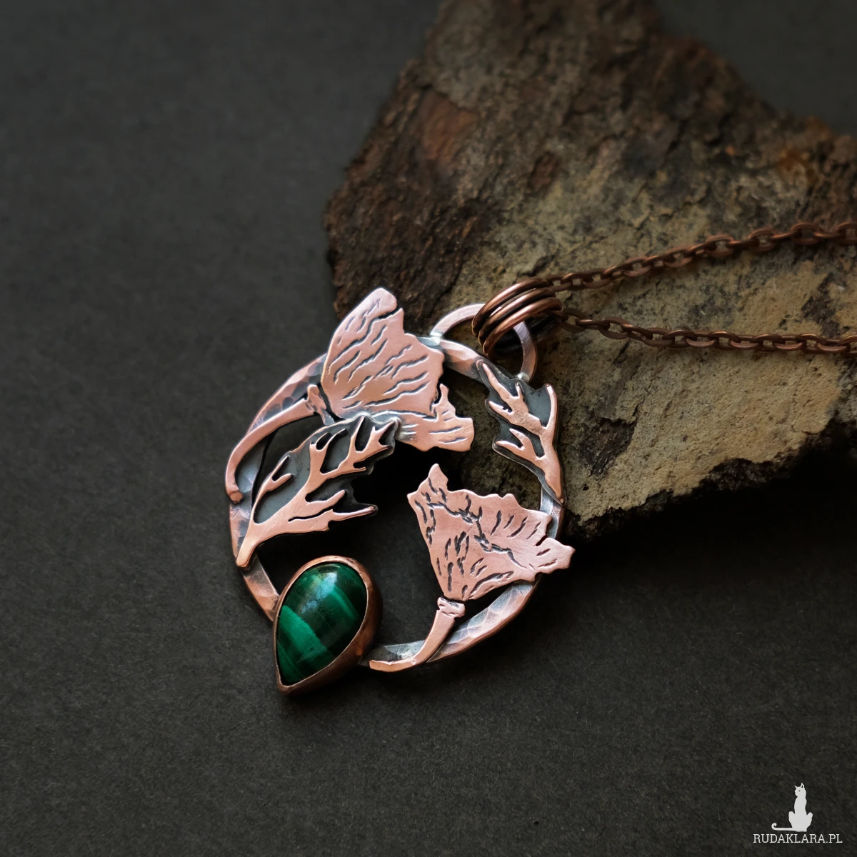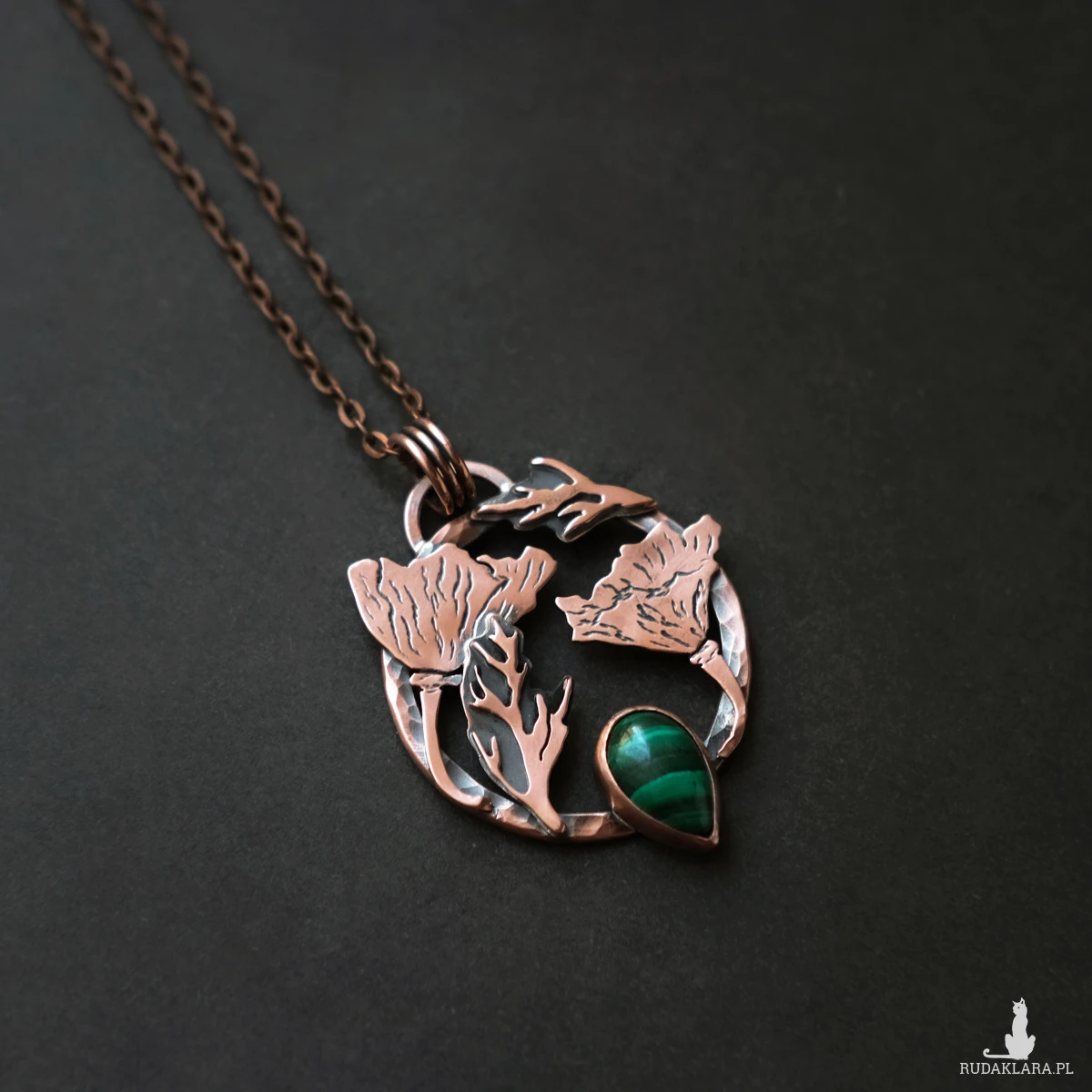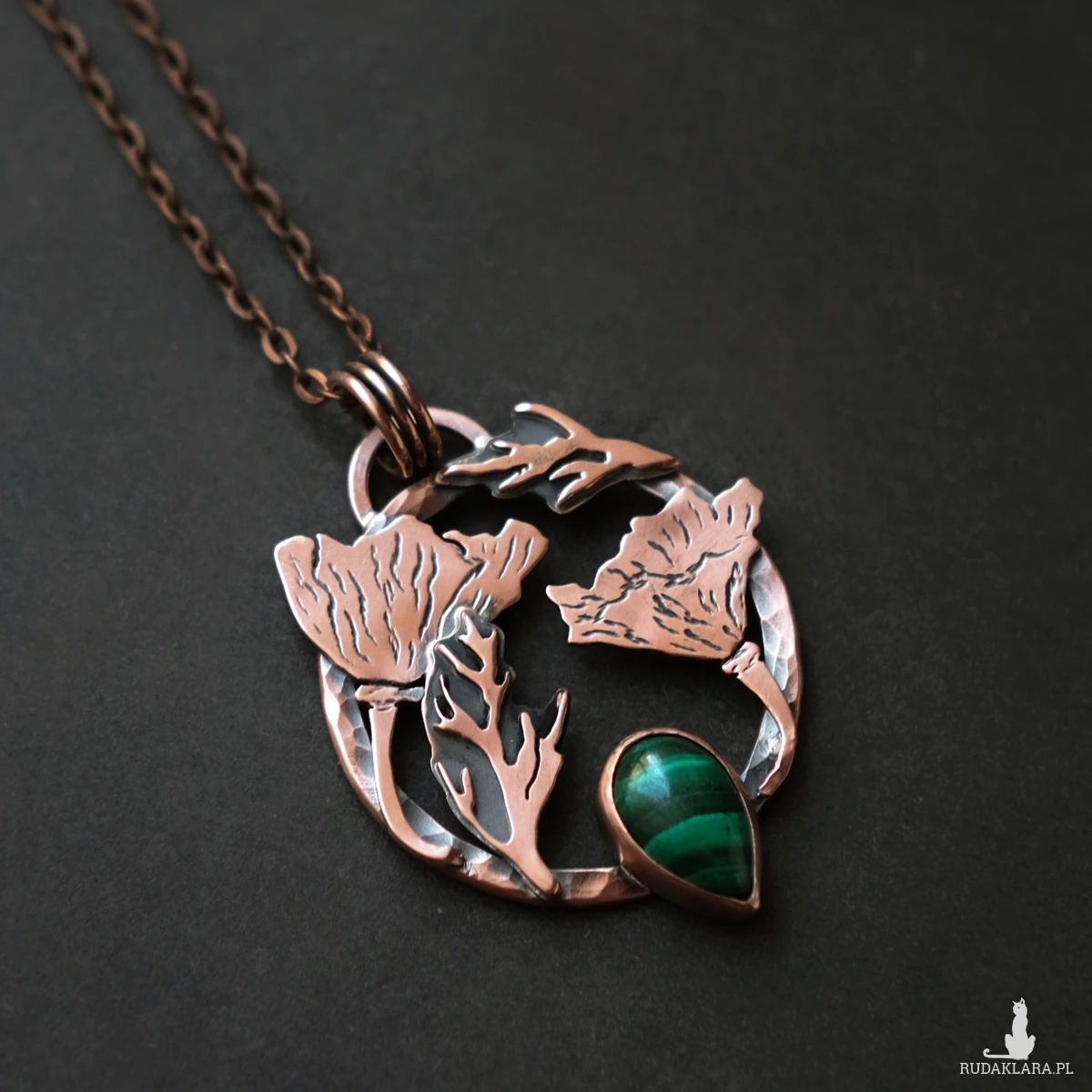 Unikatowy miedziany wisiorek z kwiatami pozłotki kalifornijskiej mieści w sobie kamień naturalnego malachitu. Wszystkie elementy zostały stworzone ręcznie na podstawie rysunku, co nadaje mu oryginalnego charakteru. Wisiorek ma naniesioną patynę, aby uwydatnić rysunek. Idealnie sprawdzi się na dekolcie miłośniczki natury, ceniącej wyroby rękodzielnicze.