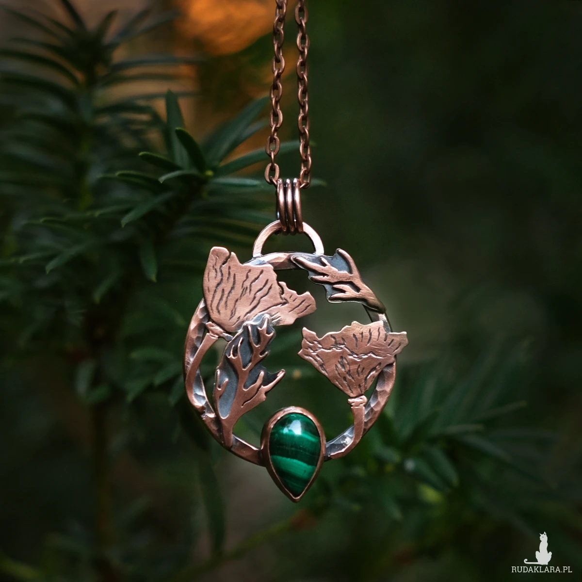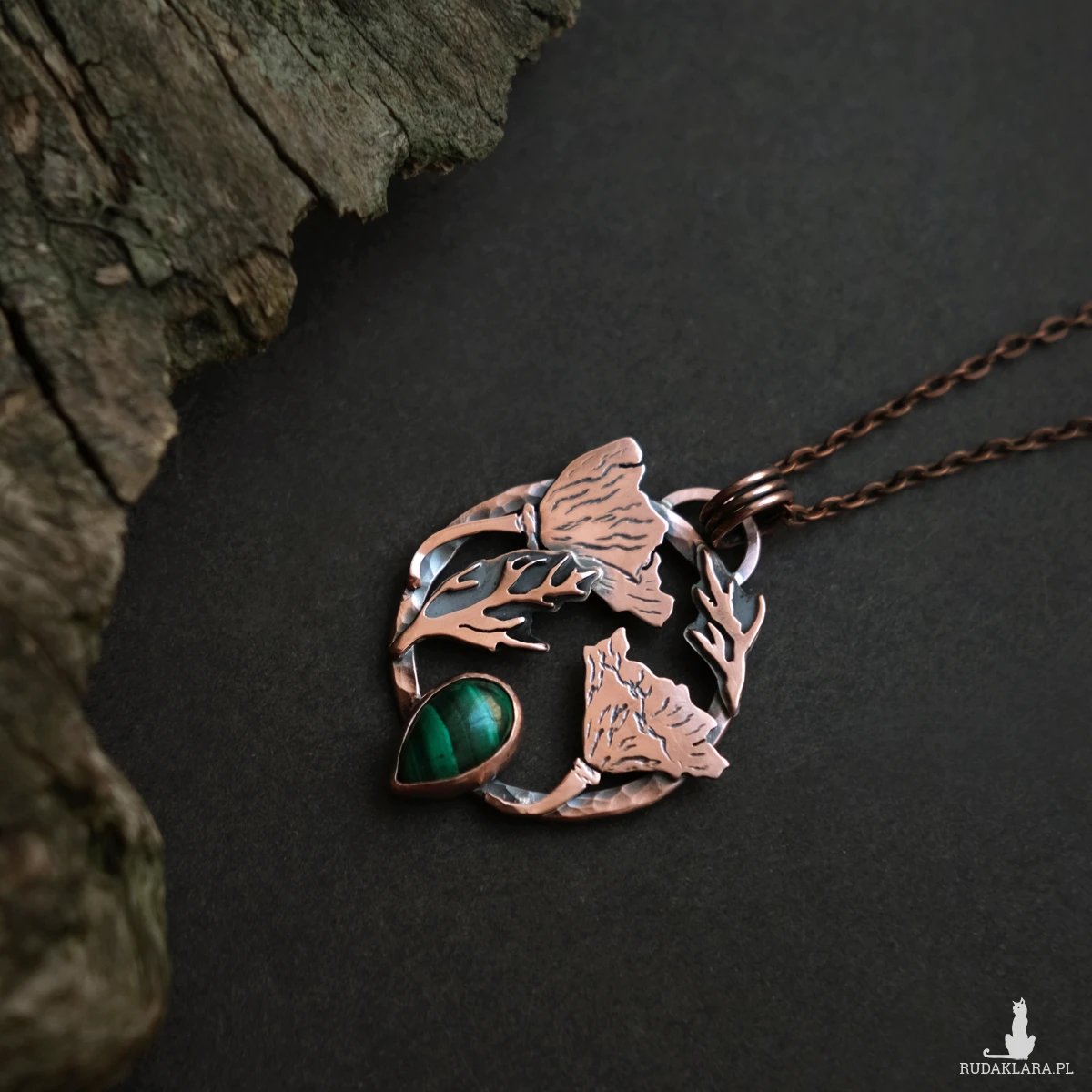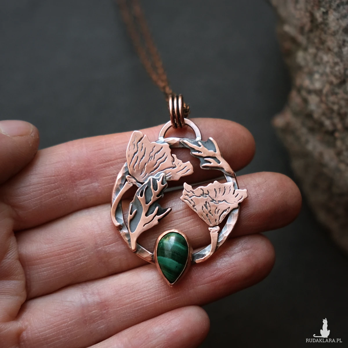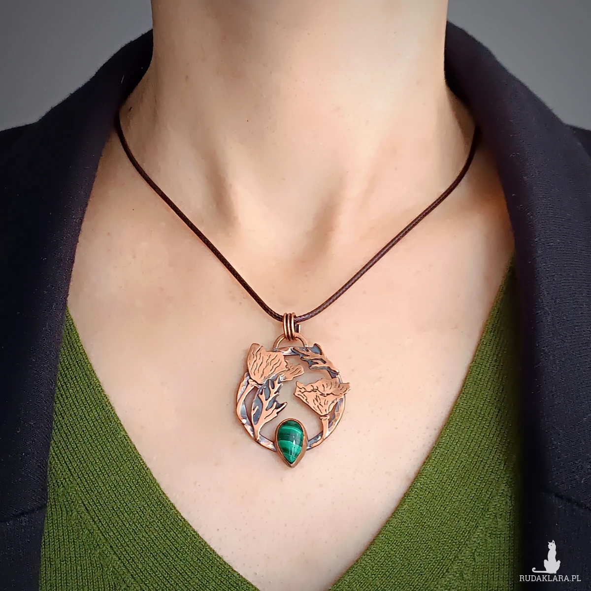 Unikatowy miedziany wisiorek z kwiatami pozłotki kalifornijskiej mieści w sobie kamień naturalnego malachitu. Wszystkie elementy zostały stworzone ręcznie na podstawie rysunku, co nadaje mu oryginalnego charakteru. Wisiorek ma naniesioną patynę, aby uwydatnić rysunek. Idealnie sprawdzi się na dekolcie miłośniczki natury, ceniącej wyroby rękodzielnicze.