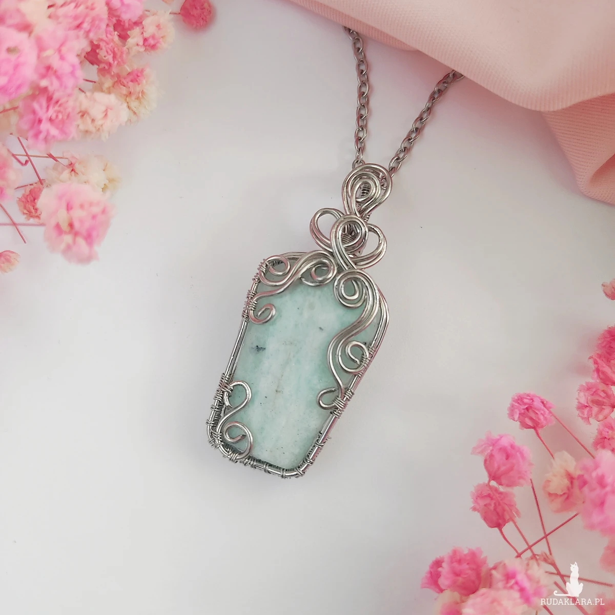 Naszyjnik Amazonit ręcznie robiony. Wykonany techniką wire wrapping z drutów ze stali chirurgicznej.