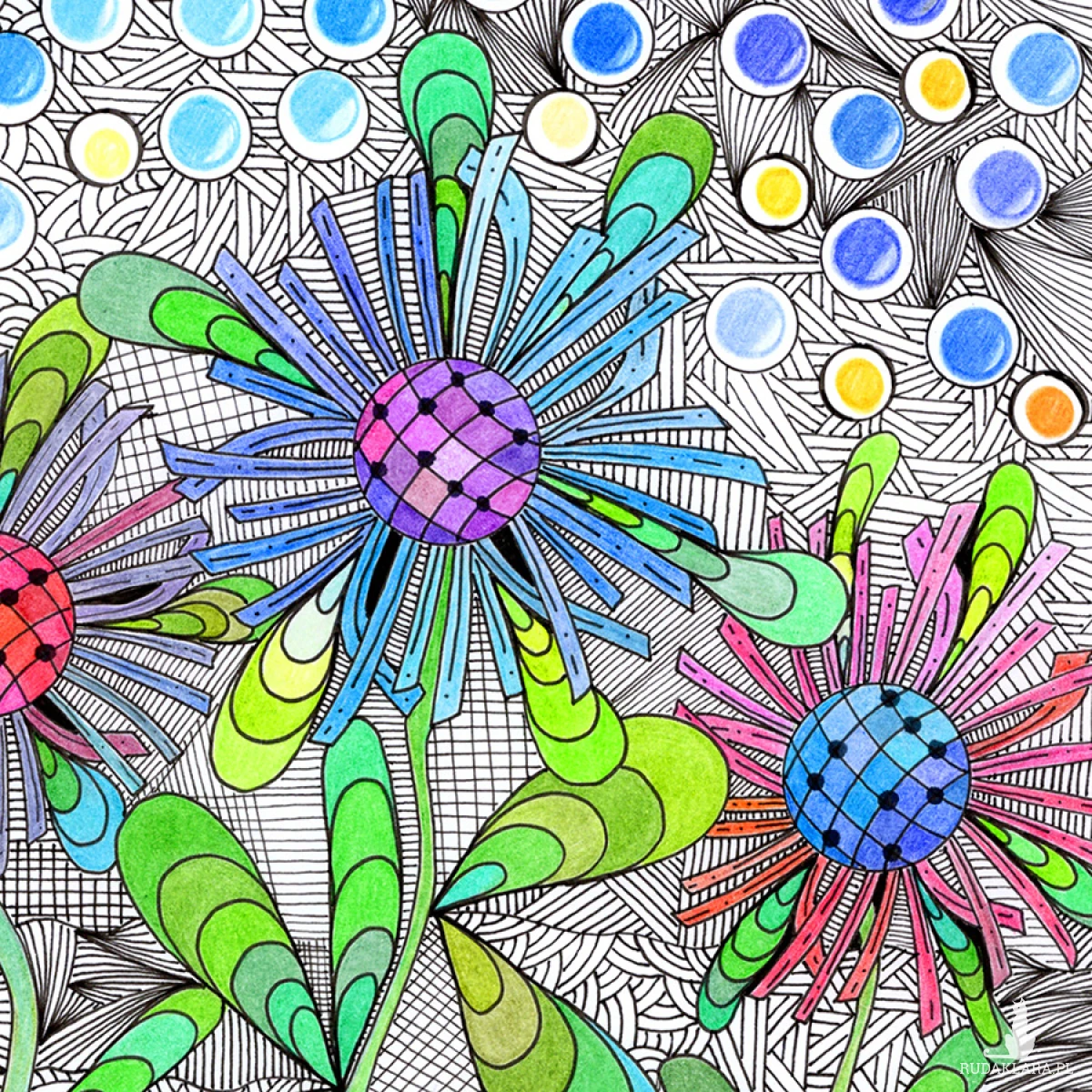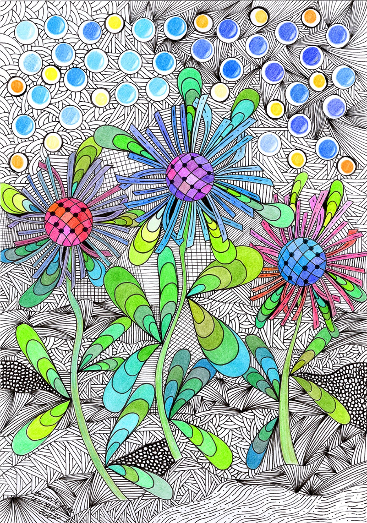 Rysunek przedstawia kwiaty, które rozkwitają w otoczeniu pełnym chaosu, gęstych linii i pozornego zamętu.