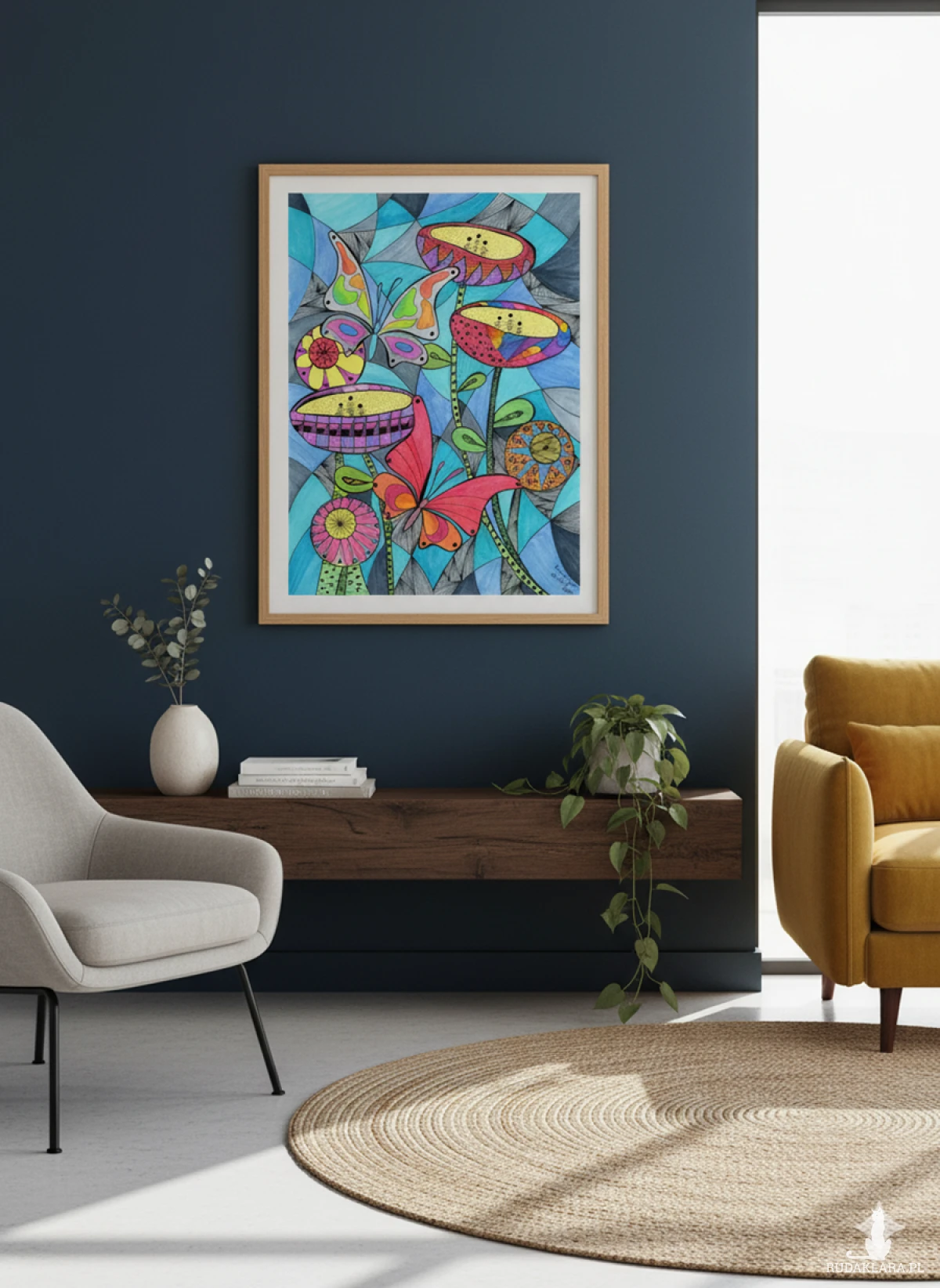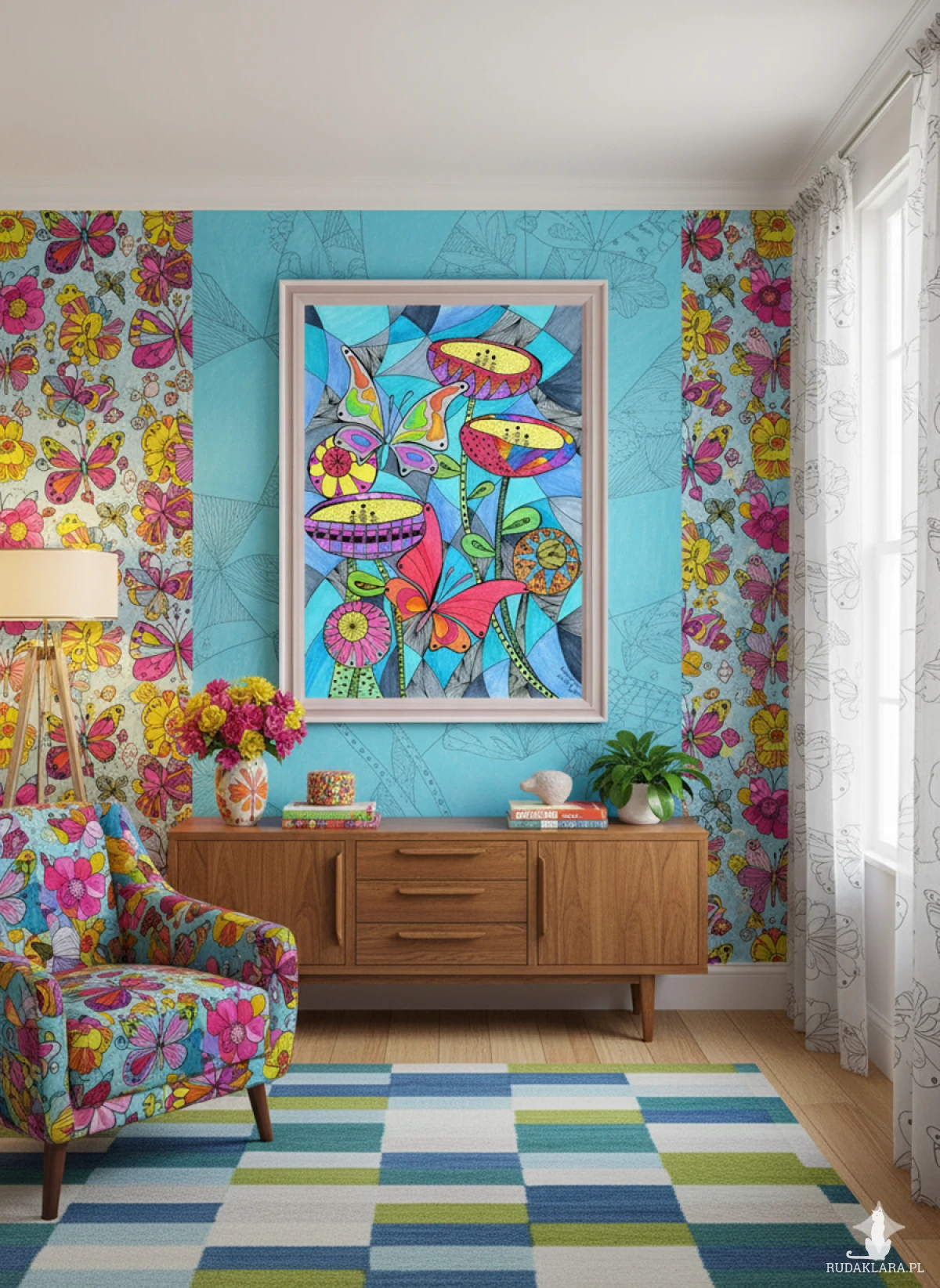 Harmonia w chaosie – geometryczne tło i fantazyjne kwiaty pokazują, że nawet w złożonym, nieuporządkowanym świecie można odnaleźć piękno i spokój.