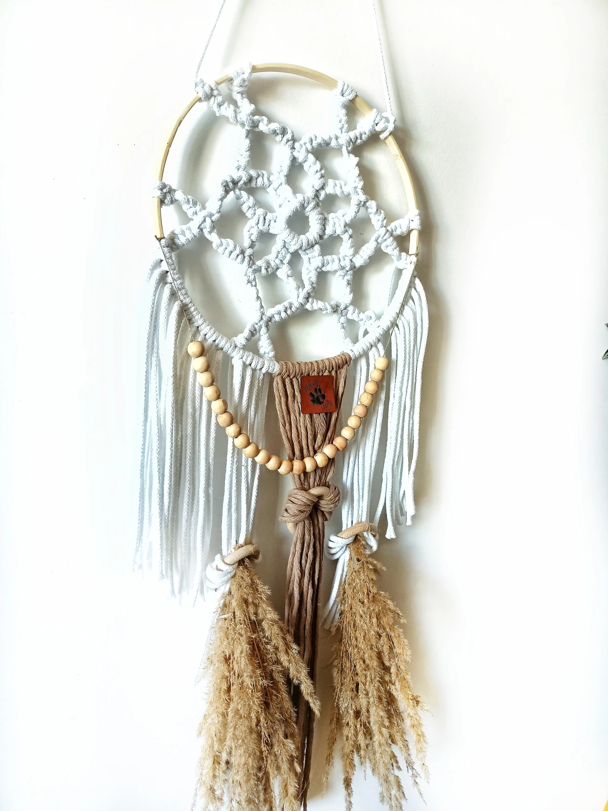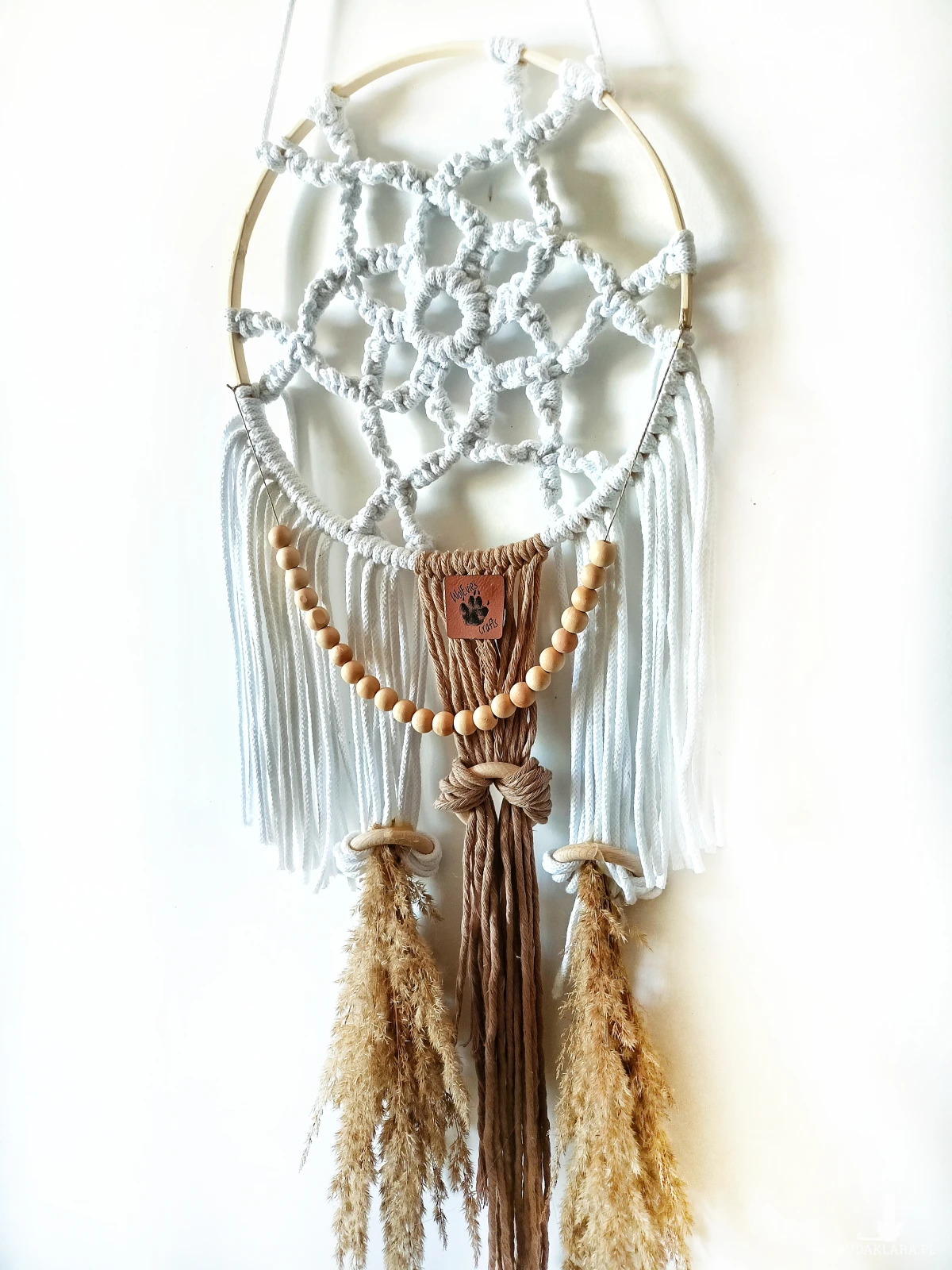 łapacz snów makrama • łapacz snów handmade • dekoracja boho na ścianę • biały łapacz snów • makrama na drewnianej obręczy • łapacz snów z koralikami • ozdoba boho do sypialni • łapacz snów dekoracja handmade • naturalny łapacz snów