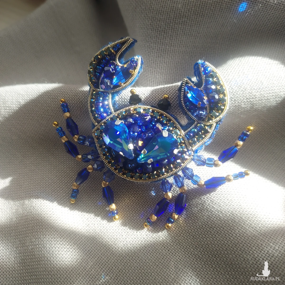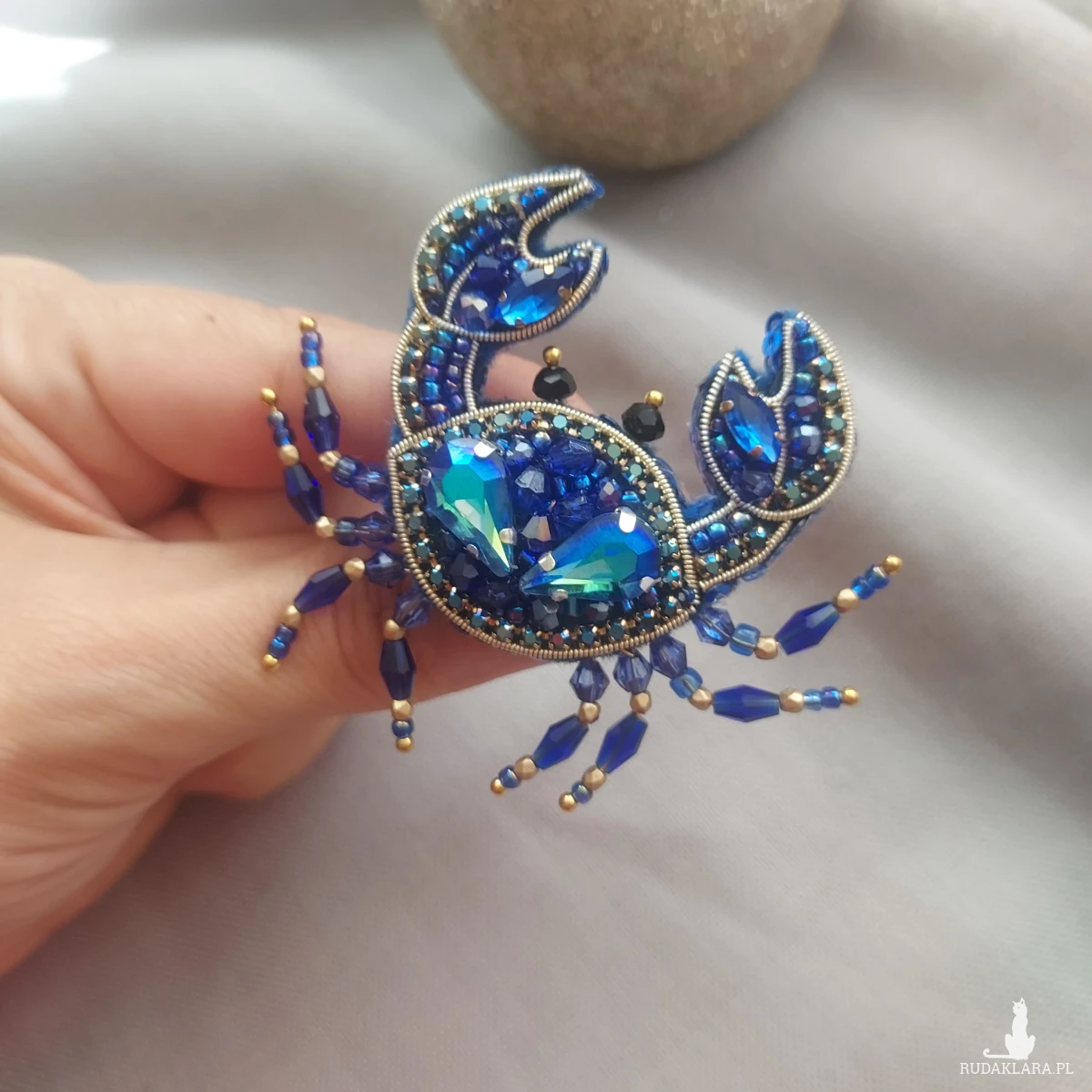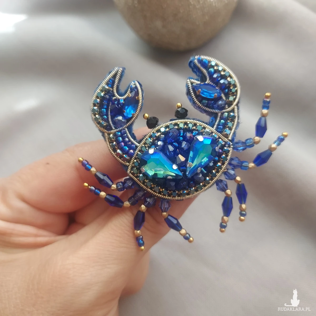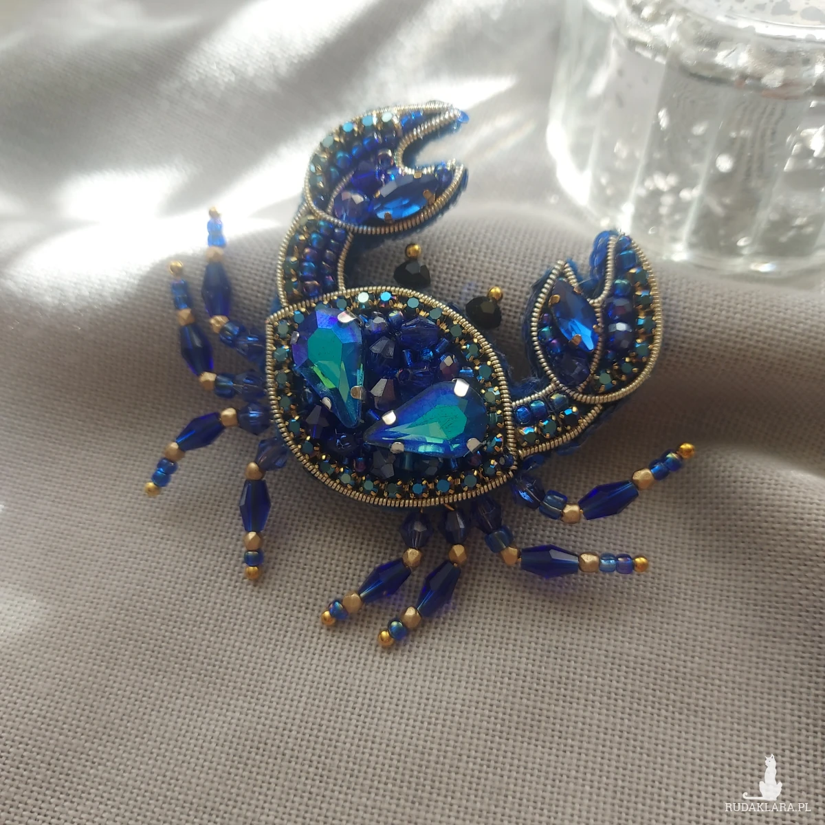 Zanurz się w świat morskich głębin z wyjątkową broszką KRABA w kolorze niebiesko-kobaltowym. Powstała techniką haftu koralikowego.