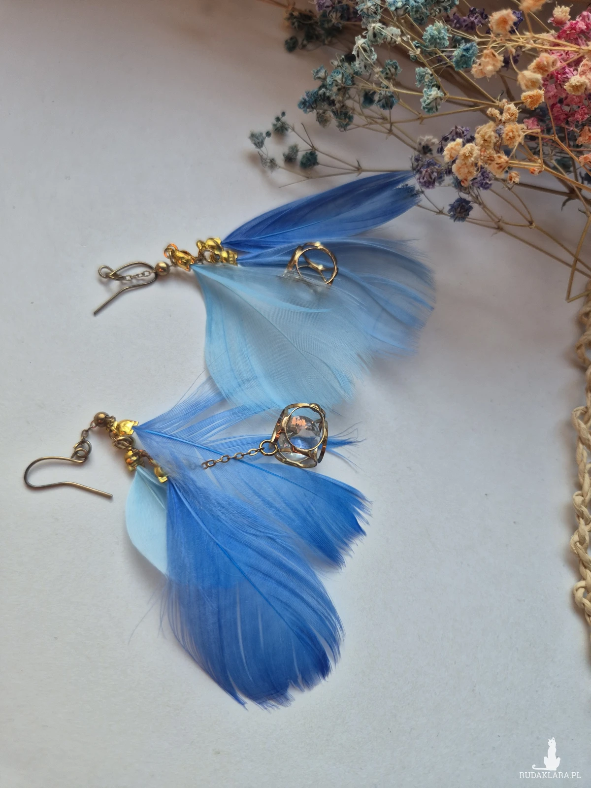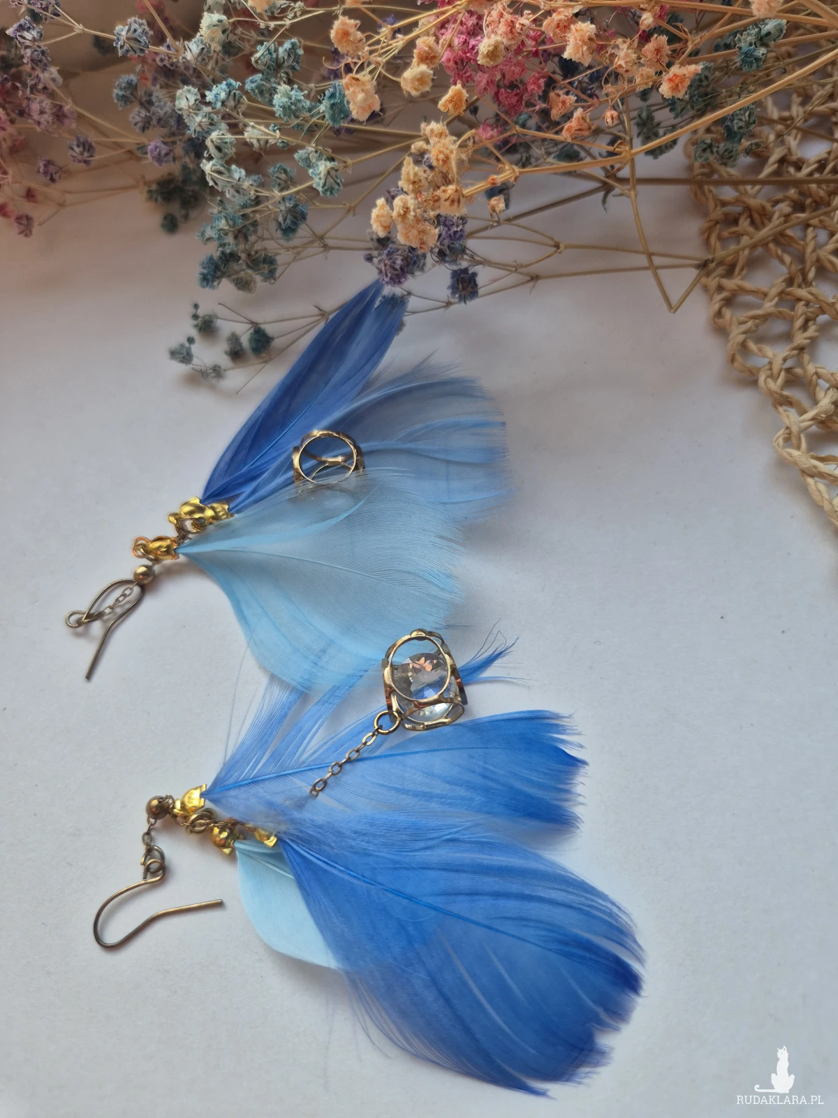 Kolczyki niebieskie pióra boho bardzo spektakularna niezwykle widoczne z serii tej biżuterii która zmienia twój strój jednym detalem polecam rękodzieło, Jeśli chcesz mogę je zmienić na klipsy