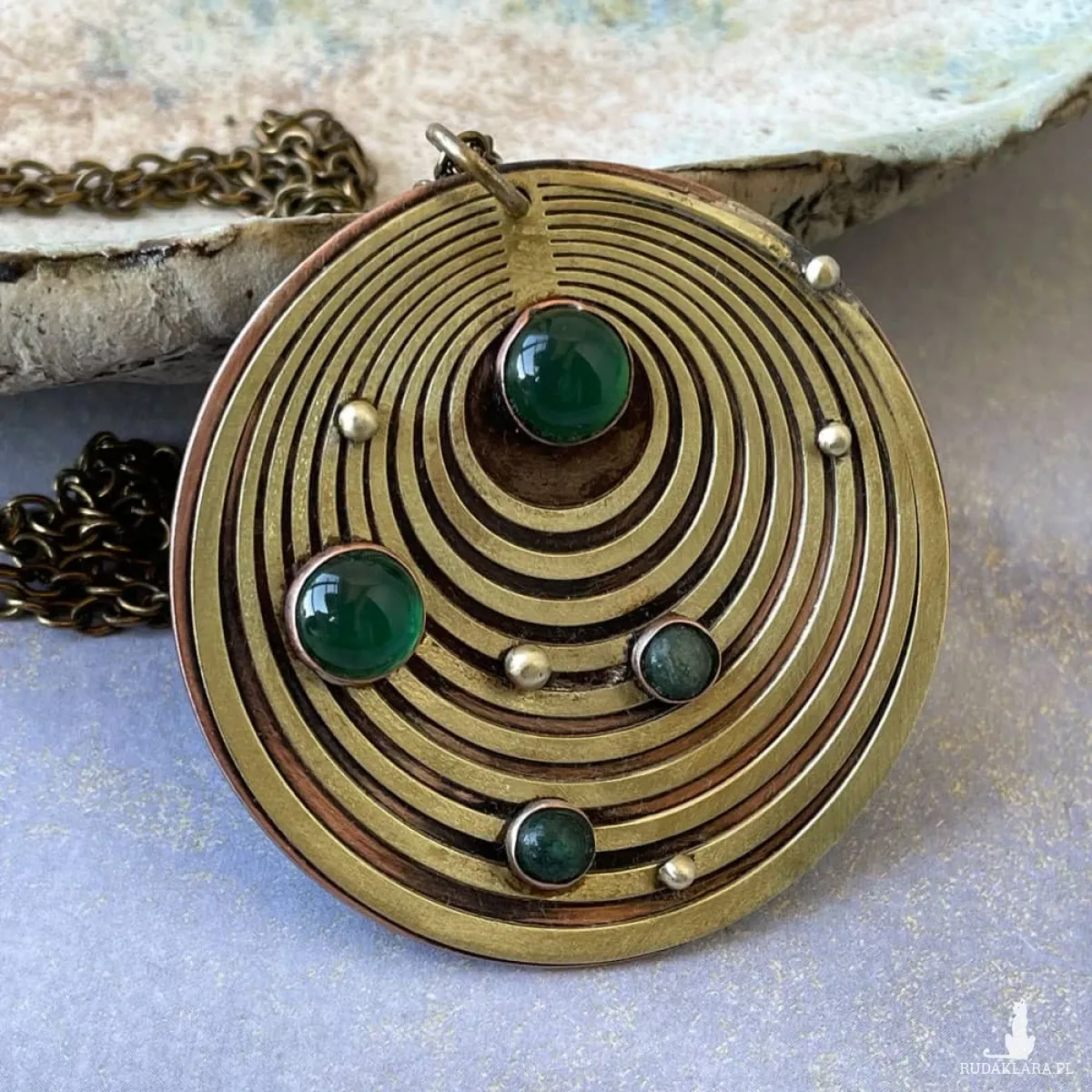 Zielono na orbitach to elegancki naszyjnik, który łączy minimalistyczną formę z retro estetyką. Mosiężne okręgi umieszczone na miedzianej podstawie przypominają orbity planet, po których krążą zielone kamienie - agat i awenturyn. Czerniona i przecierana powierzchnia dodaje kontrastu między brązem miedzi a złotym blaskiem mosiądzu. Ta prosta, a jednocześnie wyrazista kompozycja przyciąga uwagę swoją nietuzinkową formą.