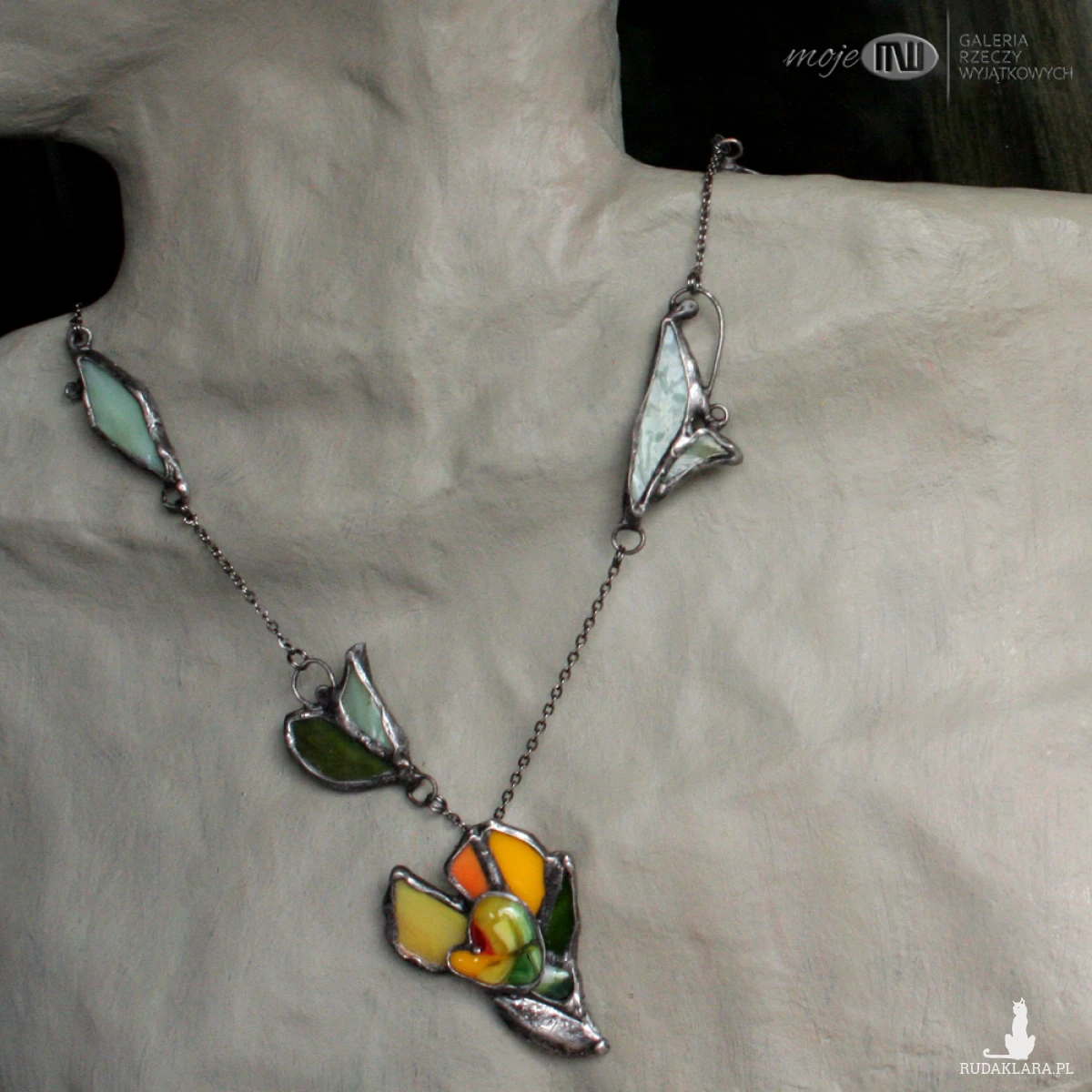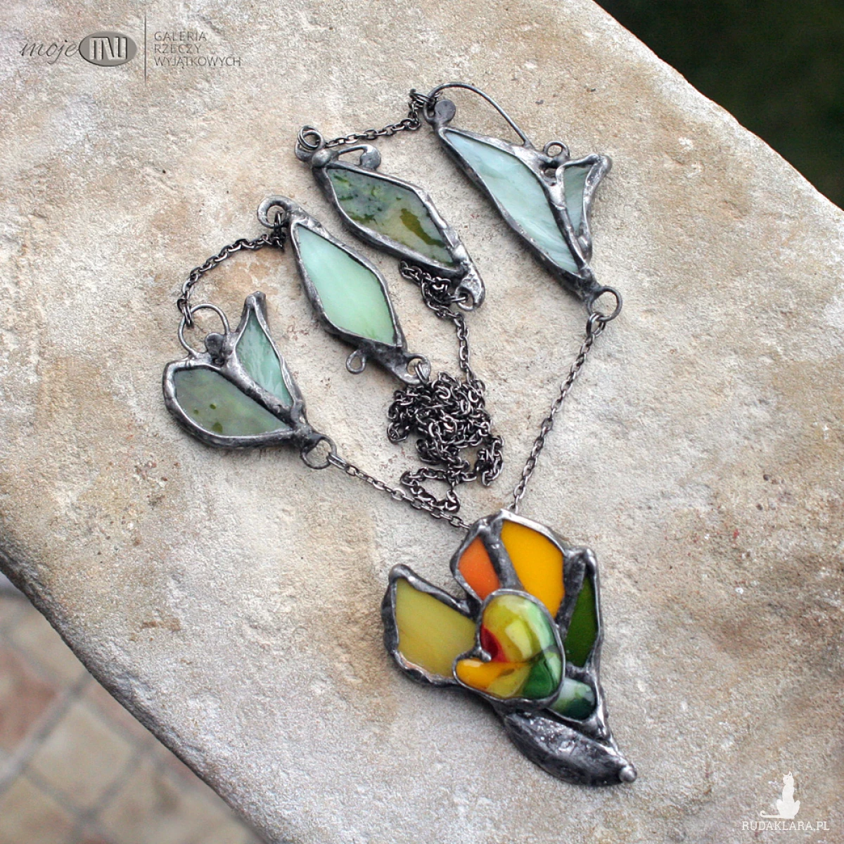 Kwiatowy wisior z żółtego i zielonego szkła, częściowo wytopiony metodą fusingu. Dostał kilka płatków z witrażowego szkła, całość oprawiłam w miedź - pokrytą cyną, patynowaną i przecieraną. Dodatkową ozdobą są listki ze szkła stanowiące część łańcuszka.
