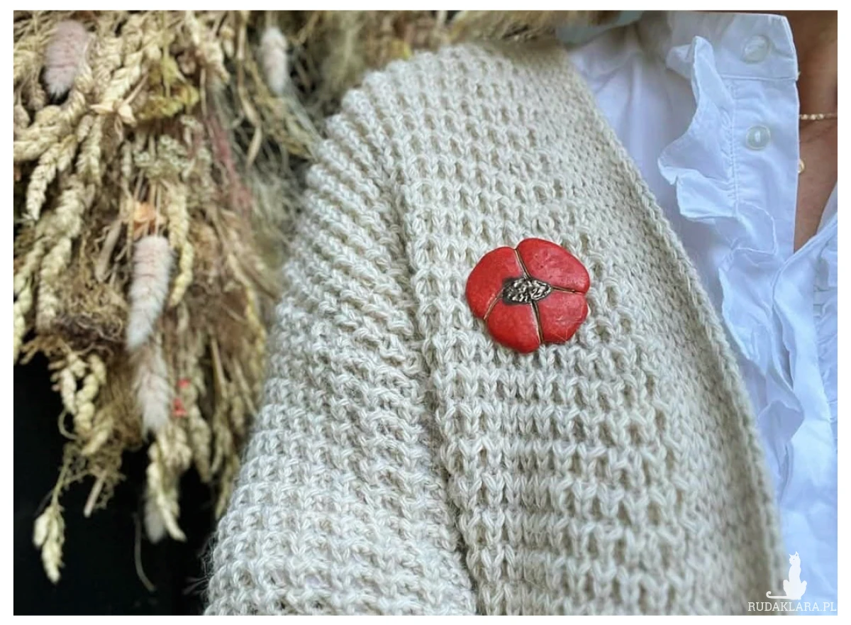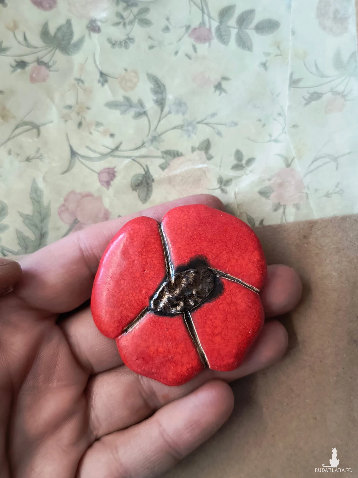 Broszka ceramiczna w postaci maku o wymiarach ok 5 cm x 4,5 cm, wykonana z gliny szamotowej wypalona na biskwit, a następnie szkliwiona w temp ok 1260 stopni C. polecam serdecznie.