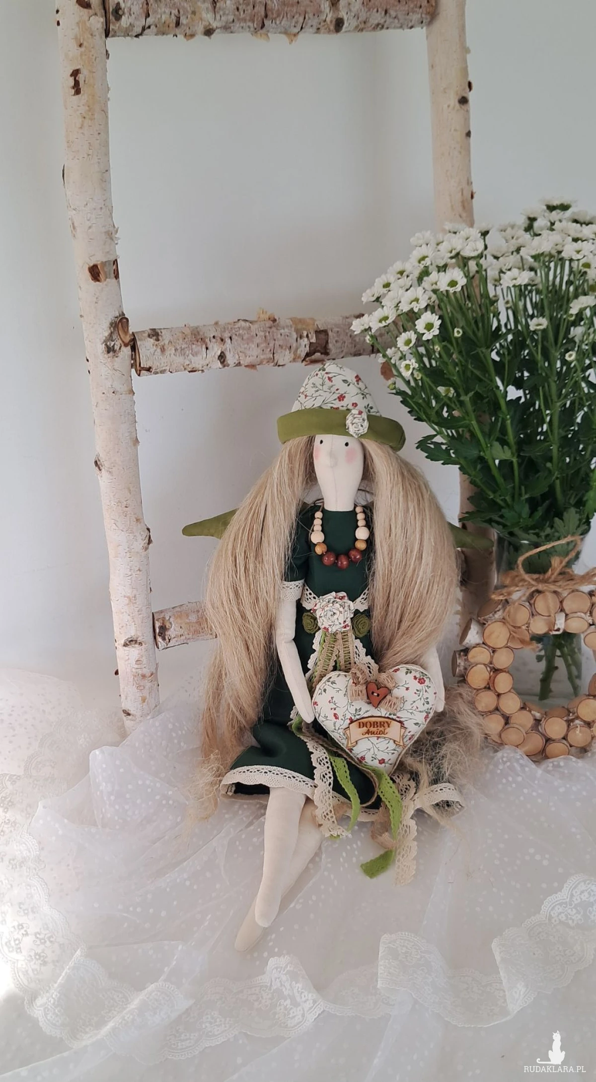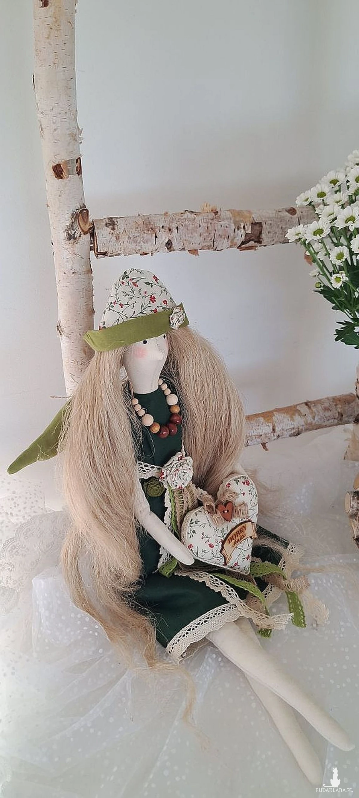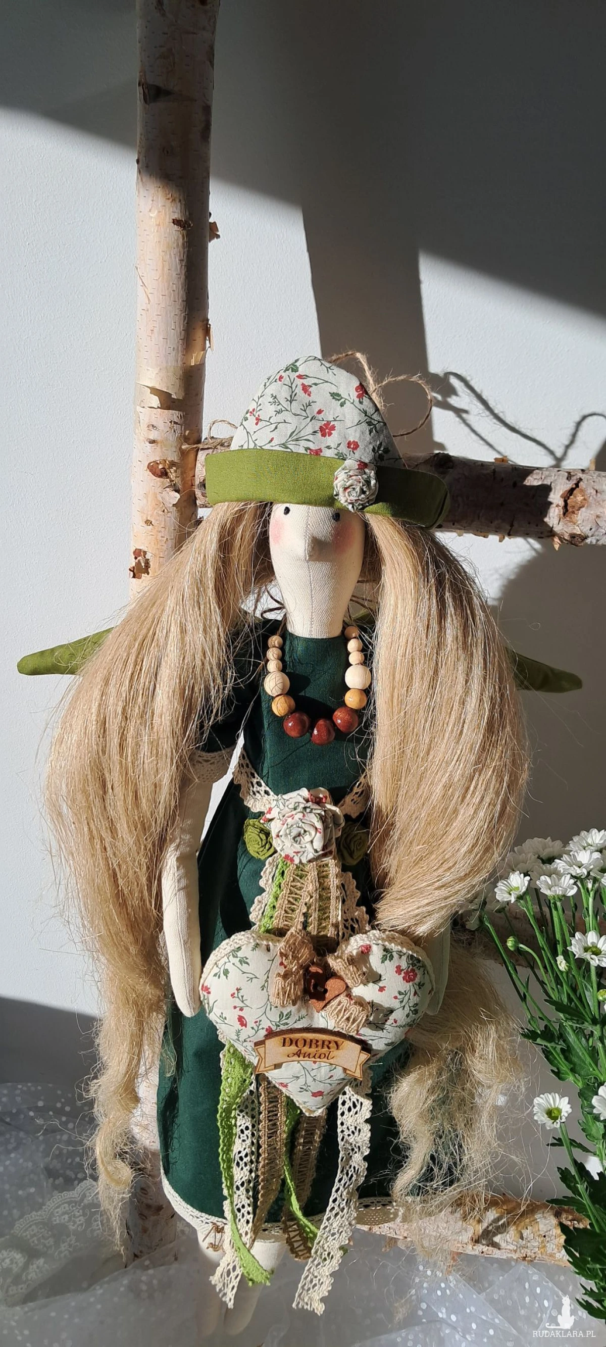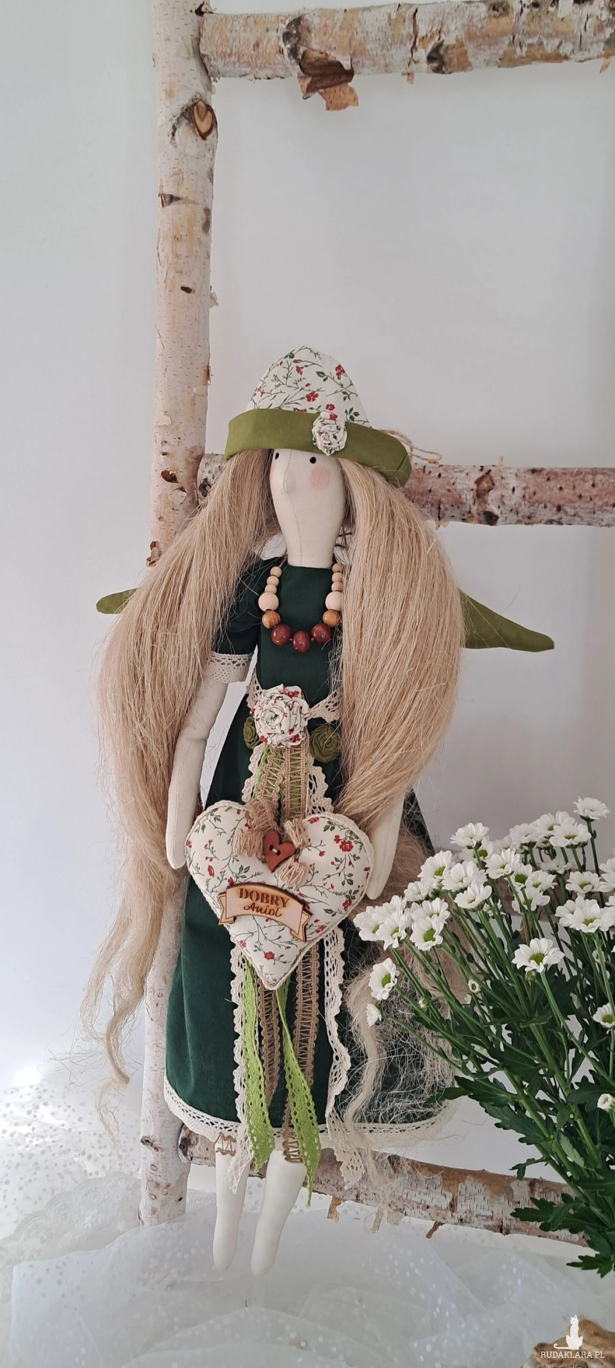 Mam do sprzedania własnoręcznie uszytego anioła stróża widocznego na dołączonych fotografiach. Ciałko uszyte z surówki bawełnianej, wypełnionej antyalergiczną kulką silikonową. Sukienka uszyta z wysokogatunkowej bawełny koloru butelkowej zieleni przyozdobiona bawełniana koronką koloru ecri a w pasie również zielonego i jutową. Na szyi drewniane korale. W pasie i na kapelusiku kwiaty materiałowe również wykonane przeze mnie. W rączce trzyma serduszko wykończone bawełnianą koronką w kolorze ecri oraz udekorowane drewnianym serduszkiem, jak też jutową wstążką w postaci kokardki oraz widniejącym na nim scrapkiem ze sklejki drewnianej z napisem "Dobry Anioł". Skrzydełka uszyte z bawełny barwy jasnej zieleni. Włosy wykonane z pakuły lnianej . Wysokość anioła 61 cm. Można go zawiesić, albo posadzić. Pomysł na prezent z różnych okazji, ale myślę, że i bez okazji też można nim obdarzyć kogoś na kim Ci bardzo zależy i wywołać radość w sercu:)