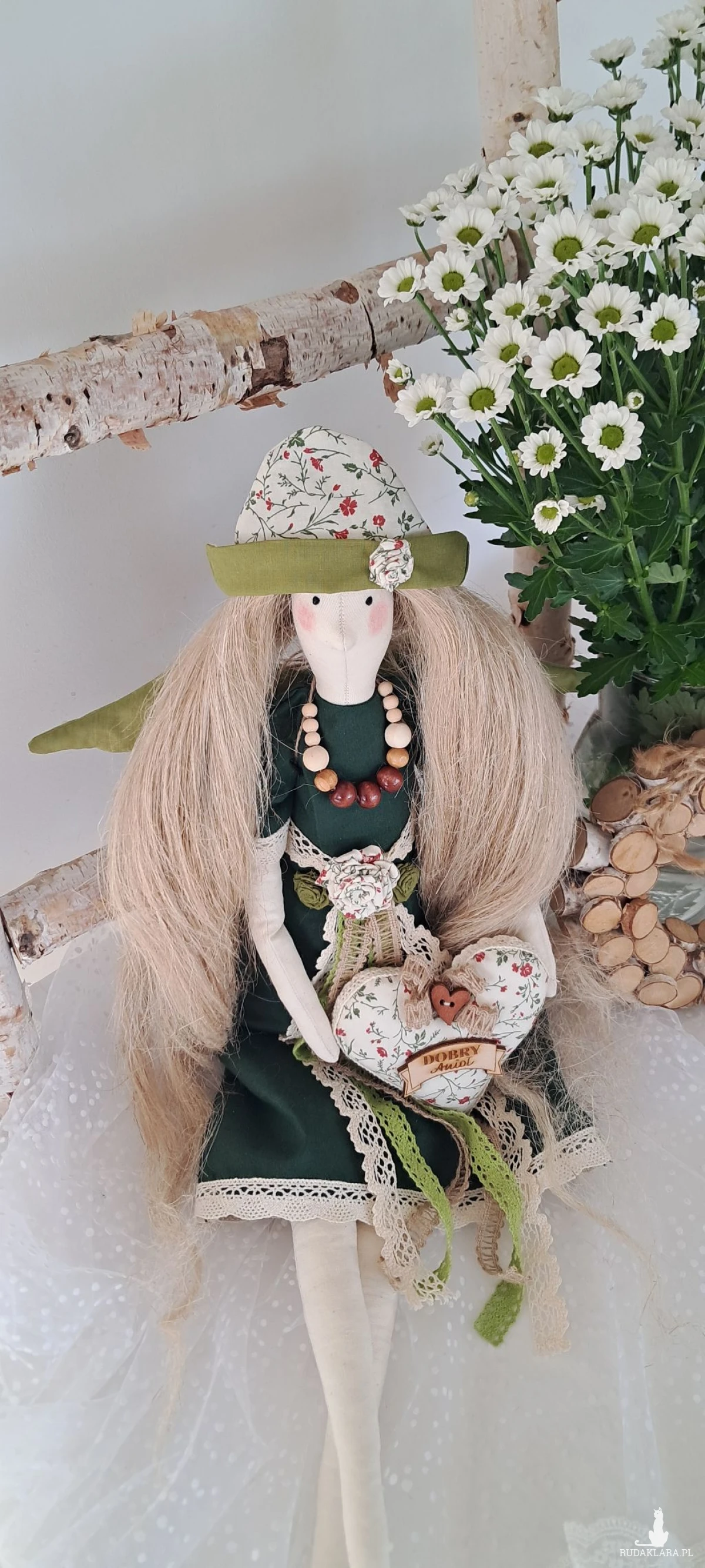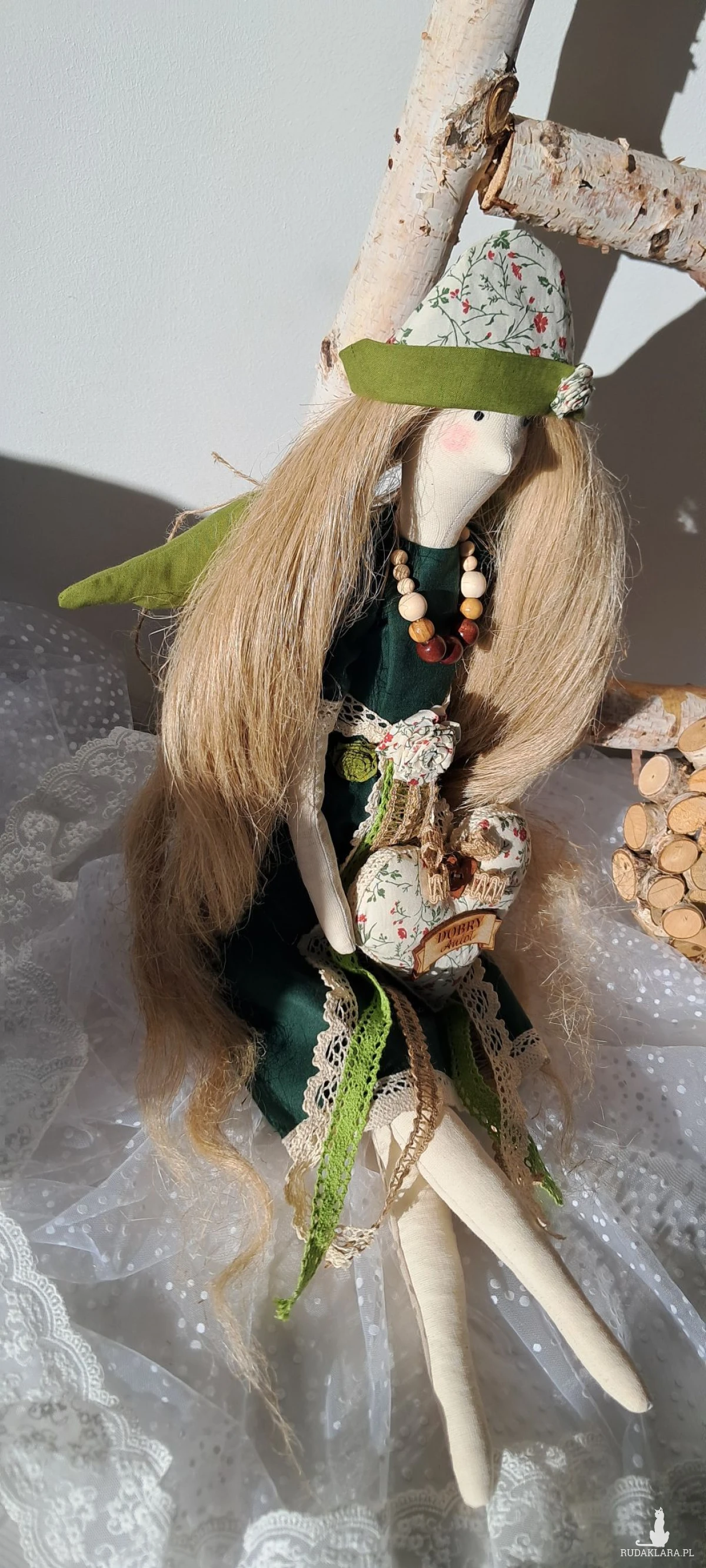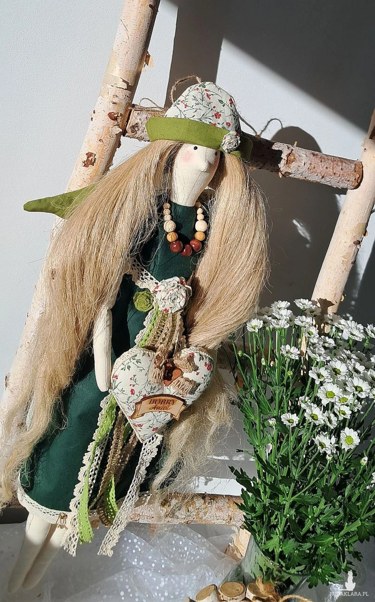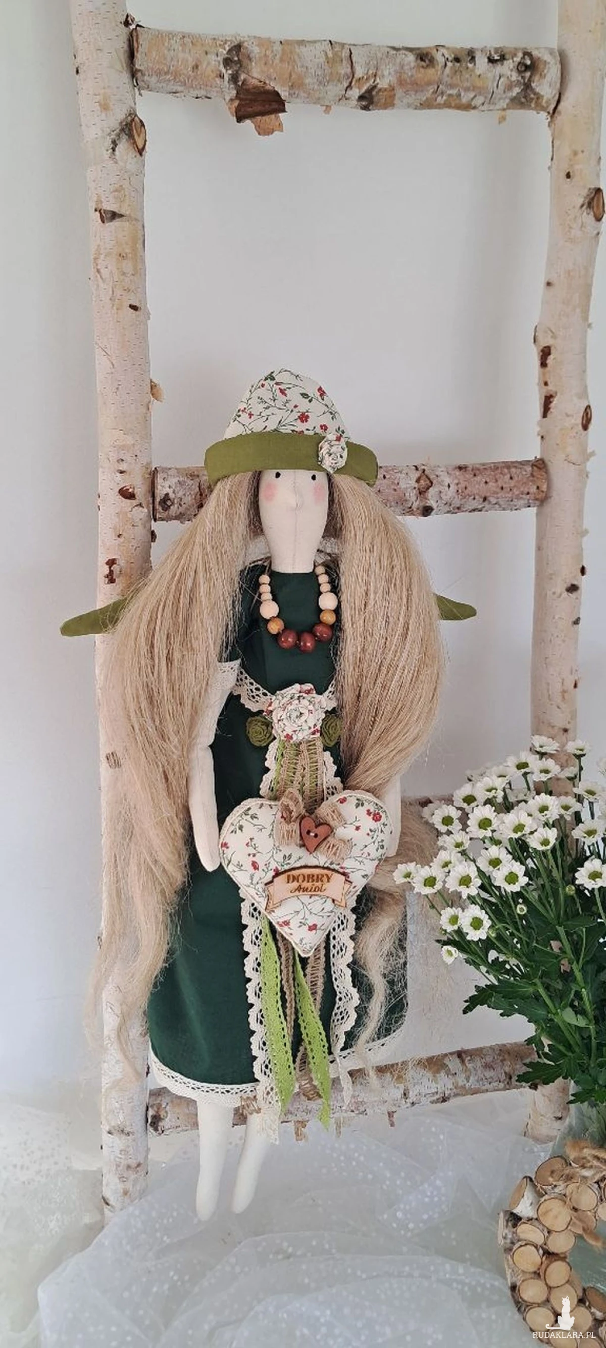 Mam do sprzedania własnoręcznie uszytego anioła stróża widocznego na dołączonych fotografiach. Ciałko uszyte z surówki bawełnianej, wypełnionej antyalergiczną kulką silikonową. Sukienka uszyta z wysokogatunkowej bawełny koloru butelkowej zieleni przyozdobiona bawełniana koronką koloru ecri a w pasie również zielonego i jutową. Na szyi drewniane korale. W pasie i na kapelusiku kwiaty materiałowe również wykonane przeze mnie. W rączce trzyma serduszko wykończone bawełnianą koronką w kolorze ecri oraz udekorowane drewnianym serduszkiem, jak też jutową wstążką w postaci kokardki oraz widniejącym na nim scrapkiem ze sklejki drewnianej z napisem "Dobry Anioł". Skrzydełka uszyte z bawełny barwy jasnej zieleni. Włosy wykonane z pakuły lnianej . Wysokość anioła 61 cm. Można go zawiesić, albo posadzić. Pomysł na prezent z różnych okazji, ale myślę, że i bez okazji też można nim obdarzyć kogoś na kim Ci bardzo zależy i wywołać radość w sercu:)