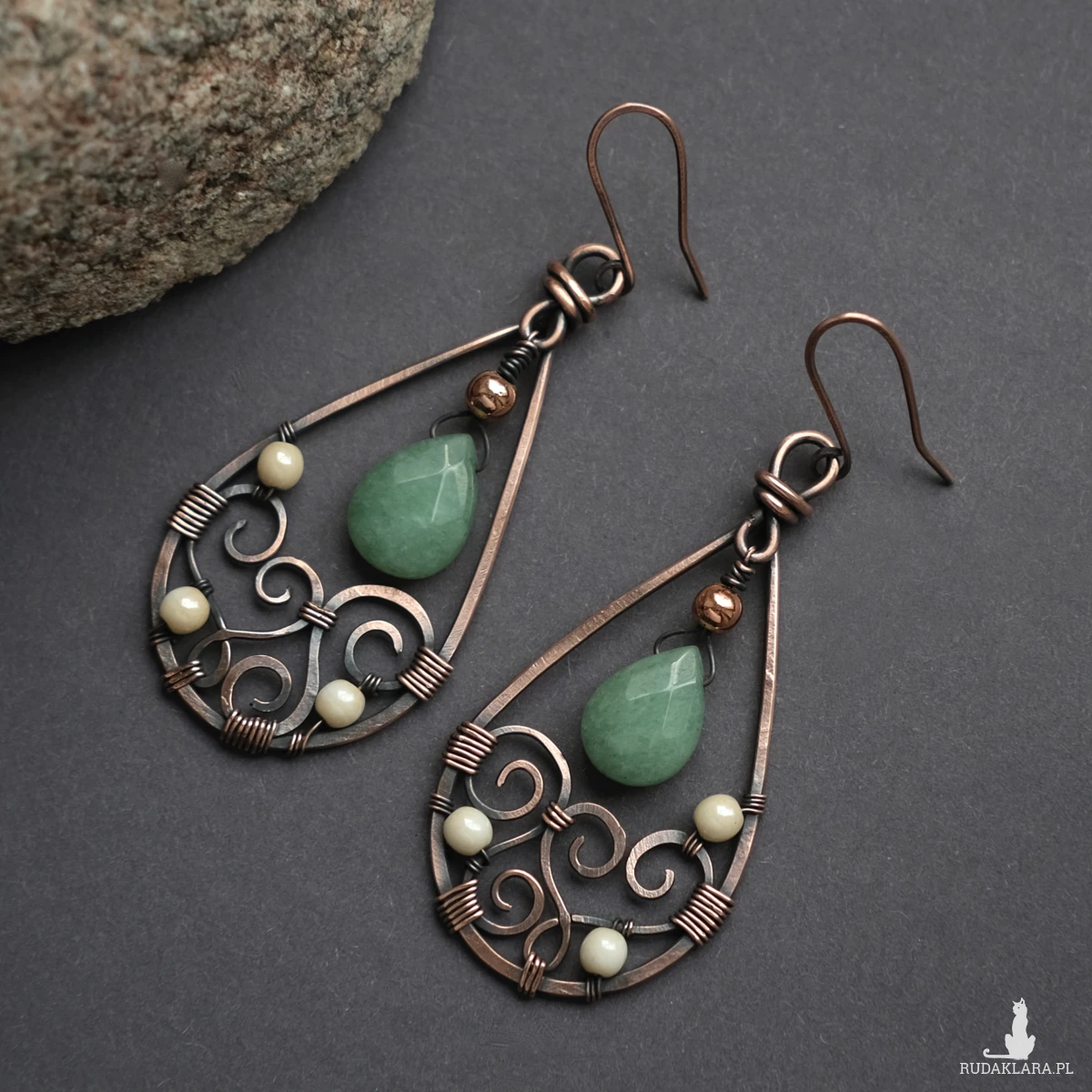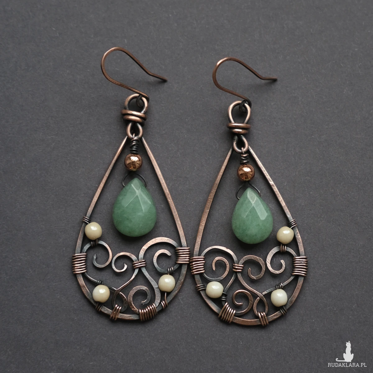 Wiszące miedziane kolczyki wykonane pracochłonną i efektowną metodą wire wrapping. Kolczyki mają kształt łezki, a w środku ozdobione są klimatycznymi oplotami, to wyjątkowy i unikatowy komplet, którego nie znajdziecie nigdzie indziej. Posiadają barwione kamienie jadeitu oraz koraliki hematytu. Wykonane w pełni ręcznie z oksydowanej miedzi, są efektowne ale jednocześnie lekkie.