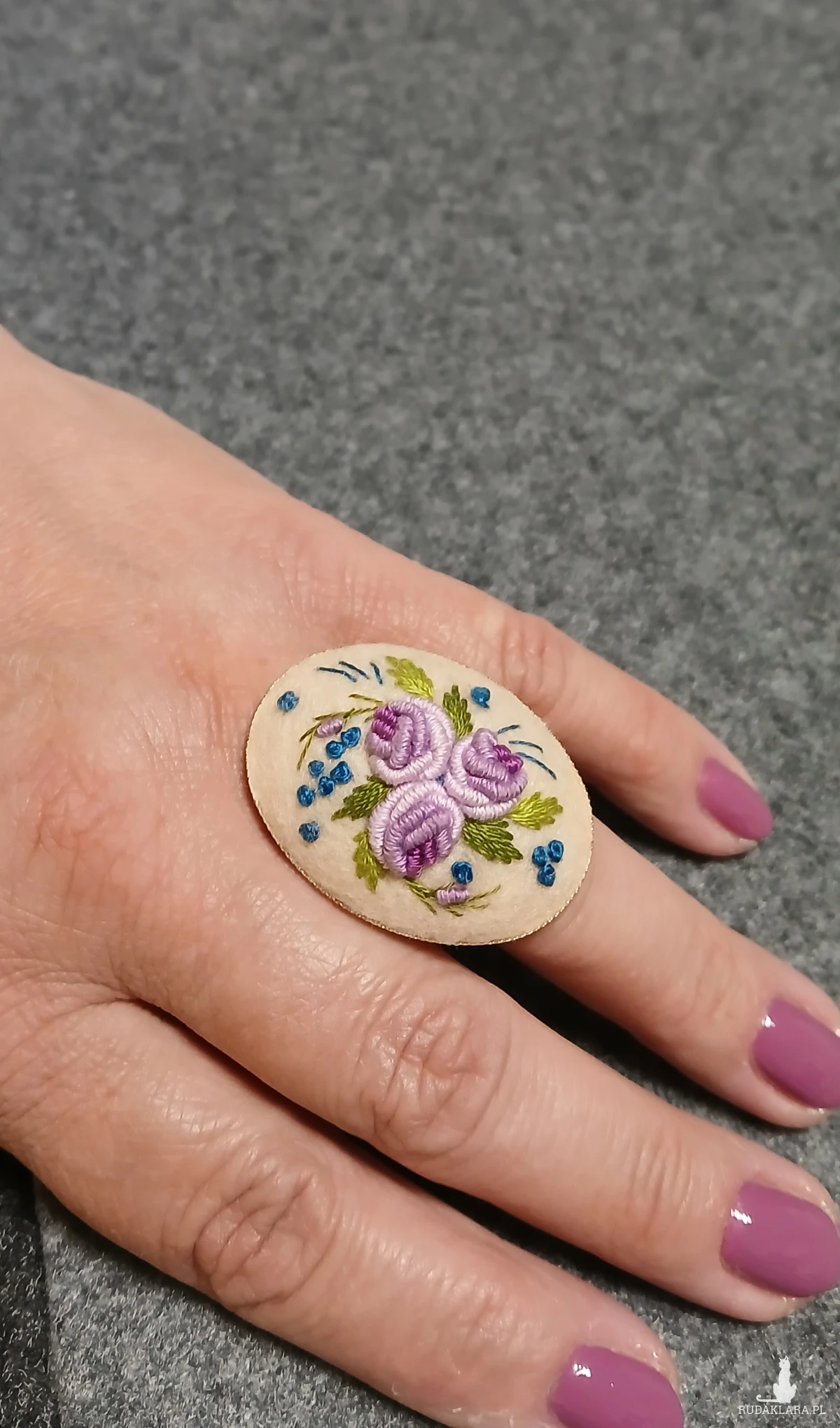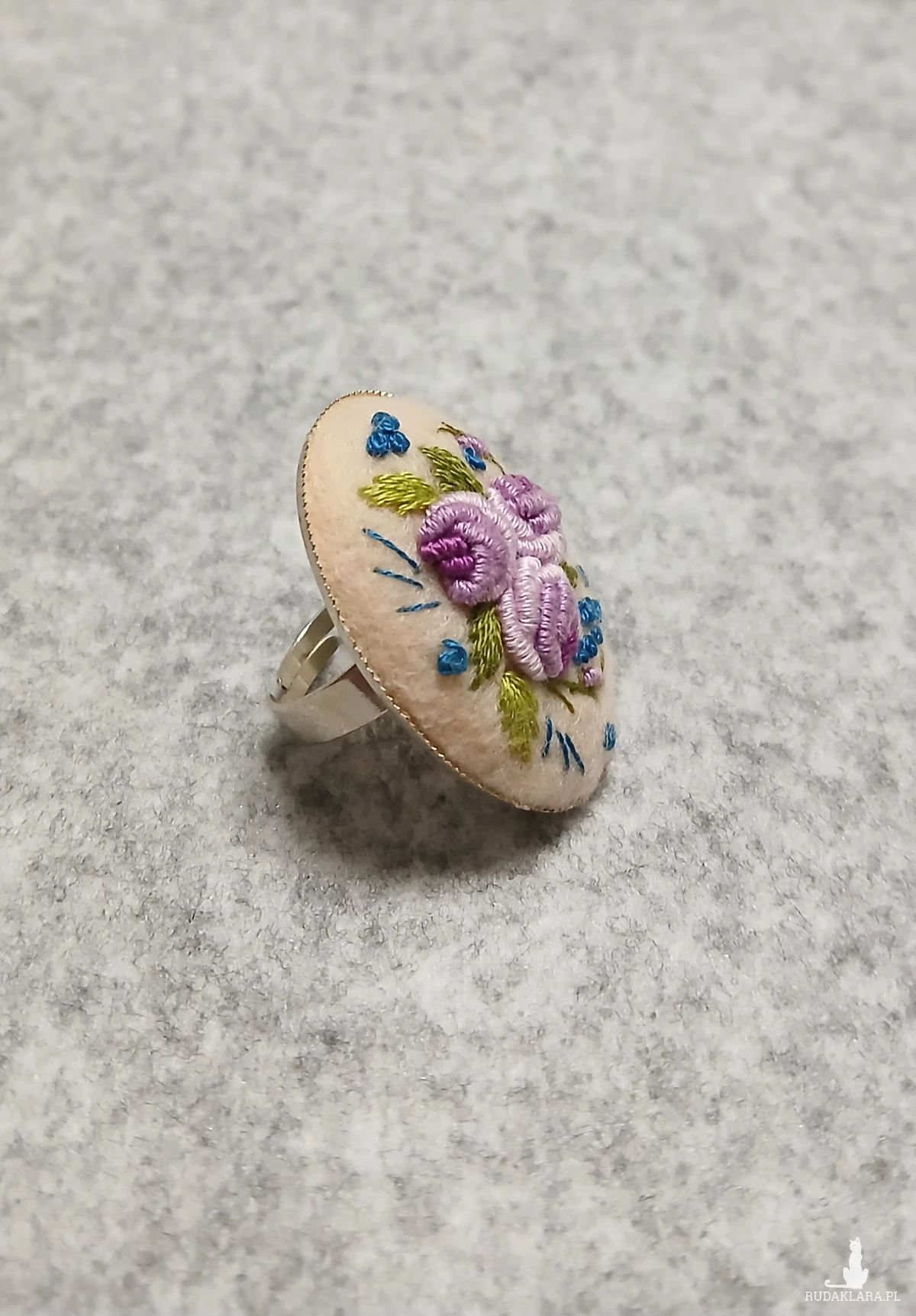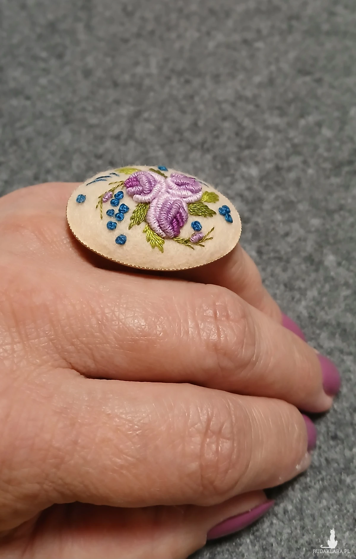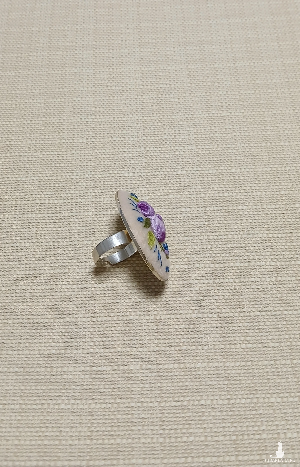 Zaskocz swoich bliskich unikatową biżuterią. Ten nieszablonowy pierścień to wyjątkowy sposób na wyrażenie siebie. Stonowana kolorystyka kilku odcieni fioletu na ecru dobitnie podkreśli Twoją wyjątkową osobowość.
