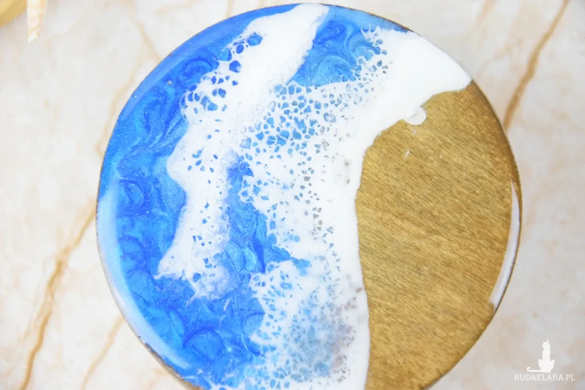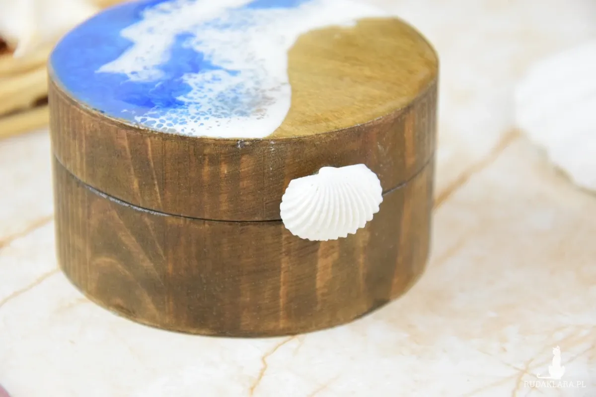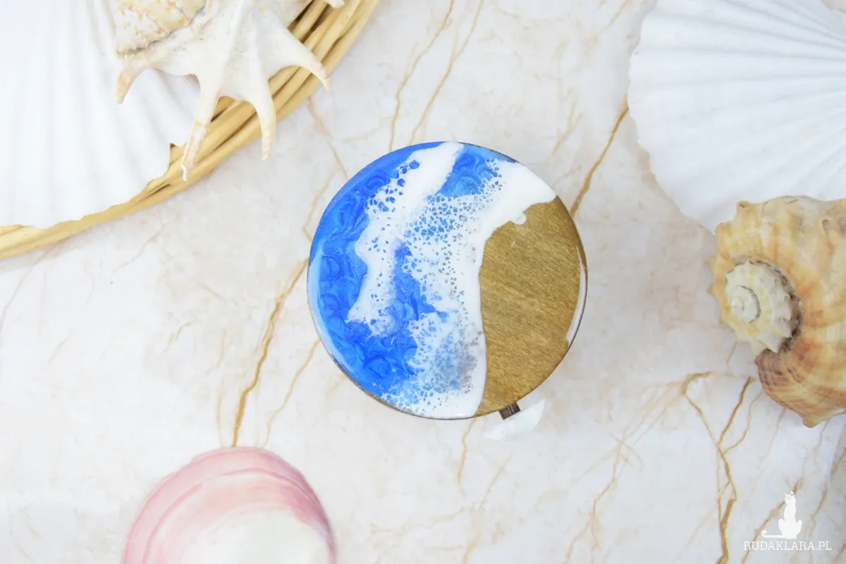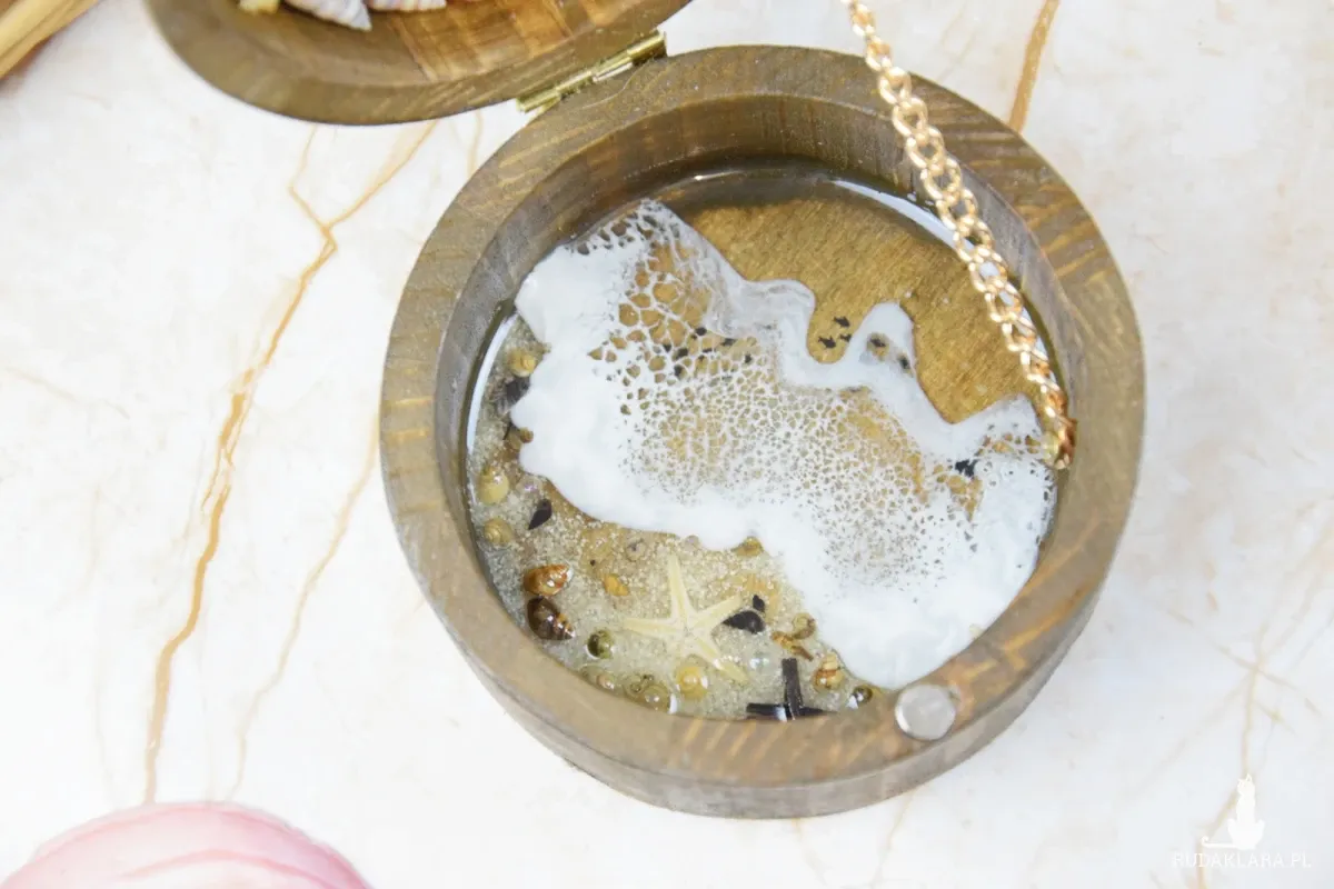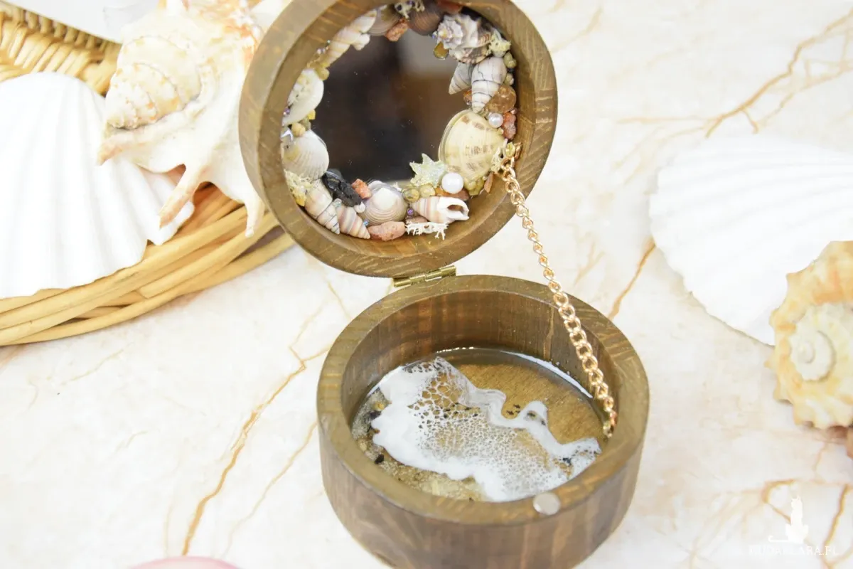 Wieczko i wnętrze zdobi wyjątkowy motyw morski wylany z żywicy – głęboki, niepowtarzalny wzór, który przywodzi na myśl fale, piasek i bezkres oceanu. Szkatułka otwierana jest za pomocą subtelnie osadzonej muszli, która pełni funkcję uchwytu – naturalny, delikatny detal, idealnie wpisujący się w morski klimat.