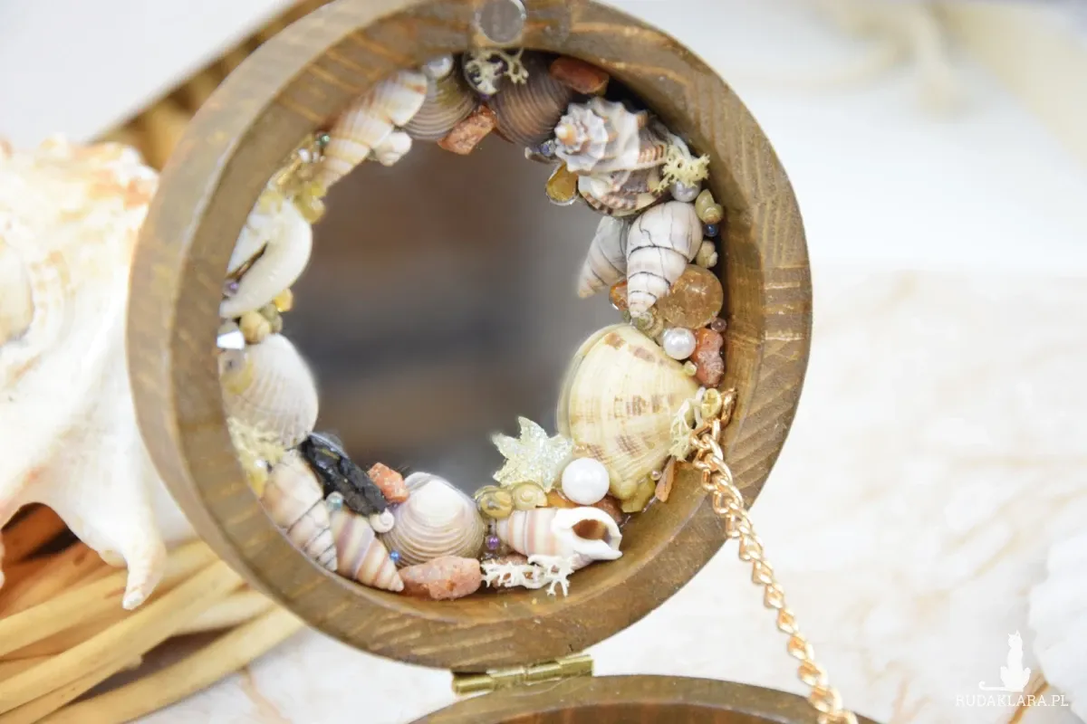 Wewnątrz znajdziesz lusterko otulone wieńcem z morskich skarbów: polskich bursztynów, muszli, pereł, błyszczących diamentów oraz rozgwiazd – jakby zatrzymanych w czasie wspomnień z wakacji nad Bałtykiem.