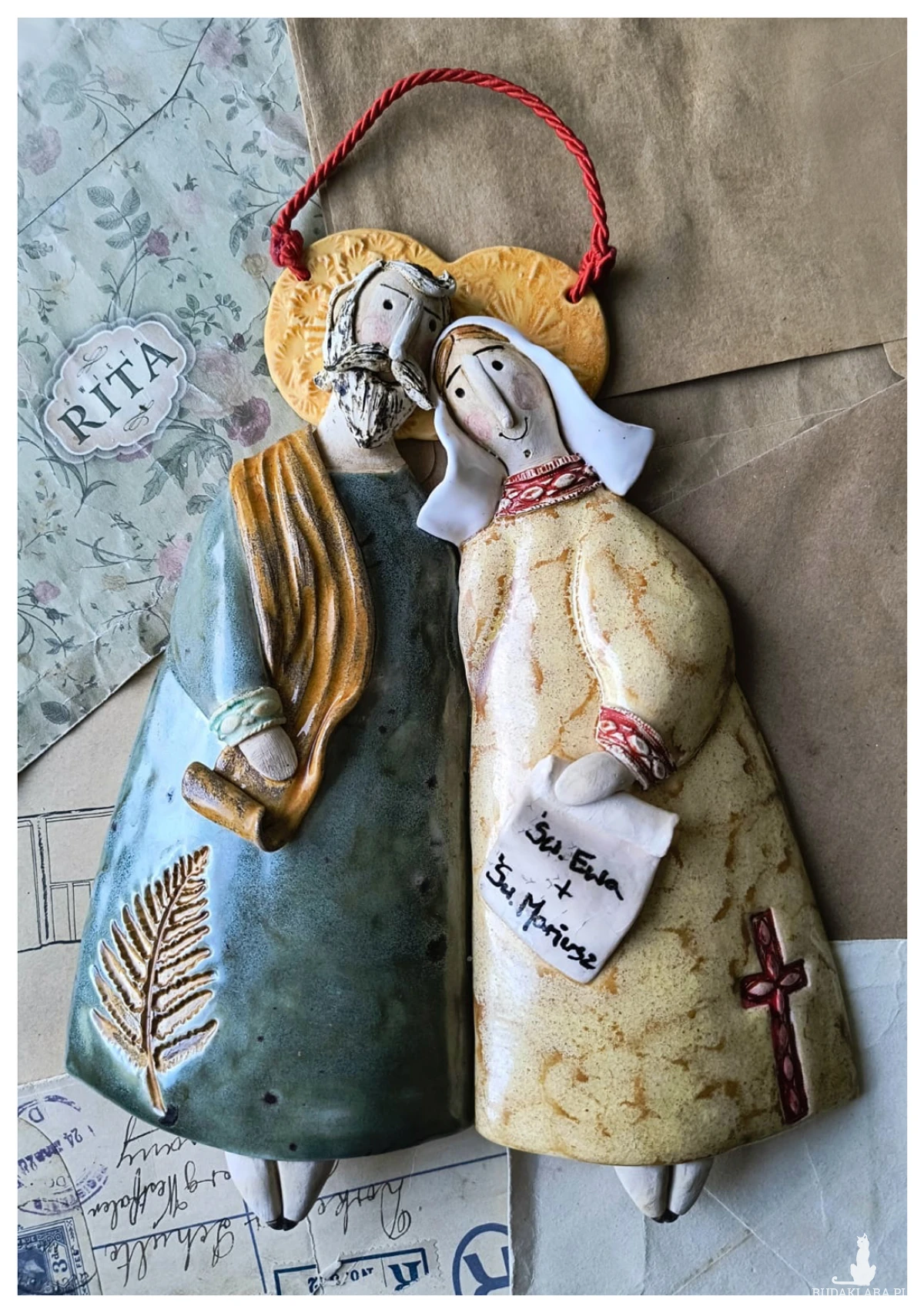 Zawieszka z wizerunkiem Św. Ewy oraz Św. Mariusza, wykonana z gliny szamotowej, wypalona na biskwit, a następnie szkliwiona w temperaturze 1260 stopni C. Wymiary ok 25 cm x 22 cm. Do powieszenia na ścianie na ozdobnym sznureczku. Idealna jako prezent okolicznościowy lub do ozdoby domu. Czas oczekiwania na realizację ok 2-3 tygodni, a w czasie wzmożonej sprzedaży lub przy większych zamówieniach do 30 dni roboczych.