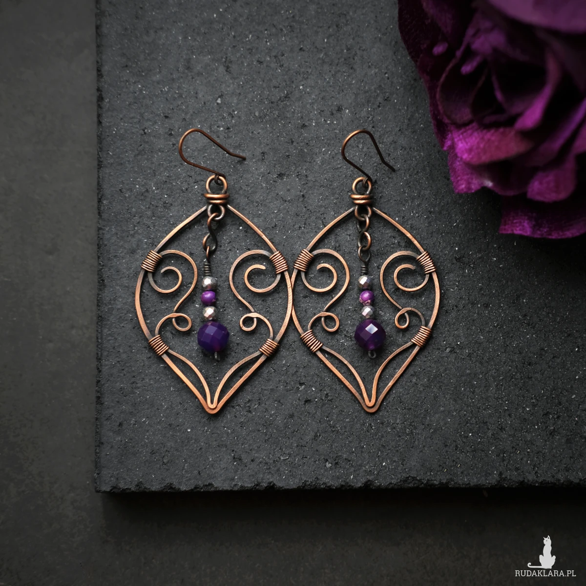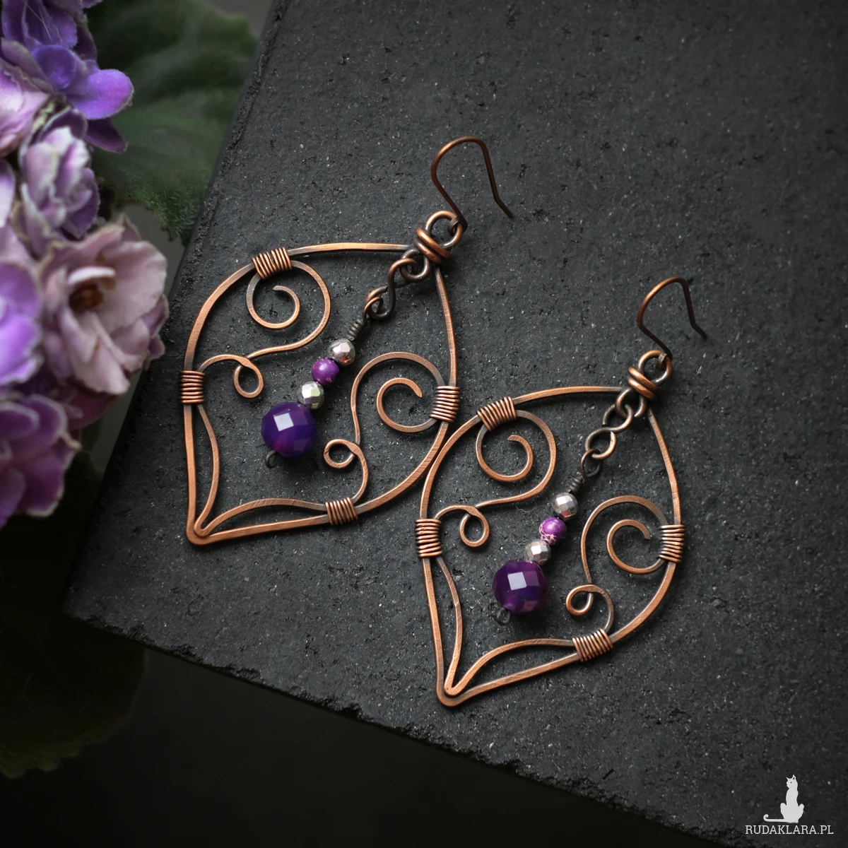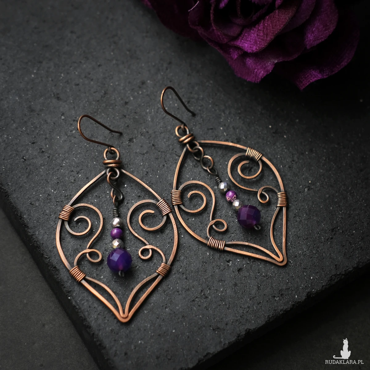Wiszące miedziane kolczyki wykonane pracochłonną metodą wire wrapping. Kolczyki mają kształt liści, a w środku ozdobione są klimatycznymi oplotami. Posiadają barwione kamienie agatu brazylijskiego, jaspis cesarski oraz koraliki hematytu. Kolczyki są duże i efektowne ale jednocześnie lekkie, co wpływa na wysoki komfort noszenia. To idealna propozycja na co dzień jak i na większe wyjścia.