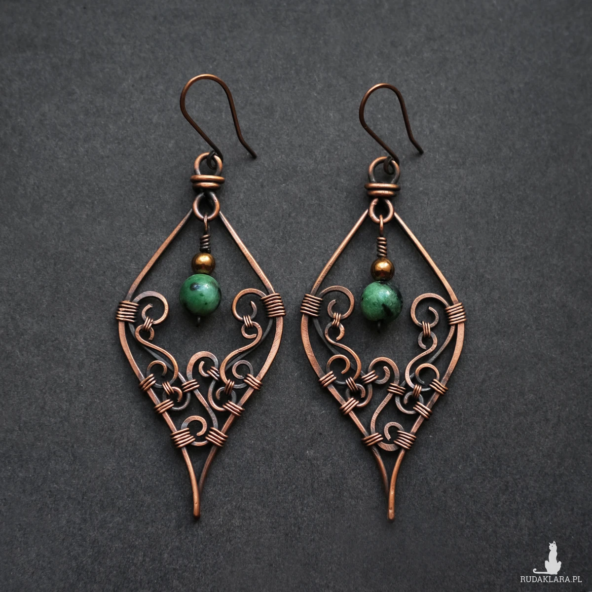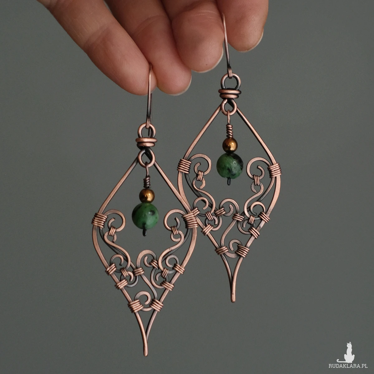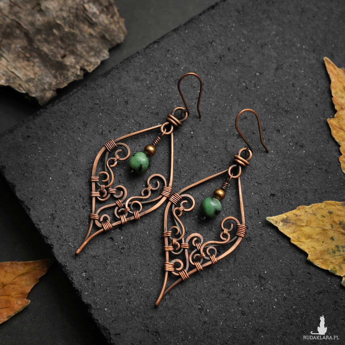 Efektowne miedziane kolczyki wykonane metodą wire wrapping. Kolczyki mają kształt wysmukłych liści, a w środku ozdobione są klimatycznymi oplotami. Posiadają kamienie zoisytu oraz koraliki hematytu. Kolczyki są lekkie, co wpływa na wysoki komfort noszenia. To idealna propozycja na co dzień jak i na większe wyjścia.
