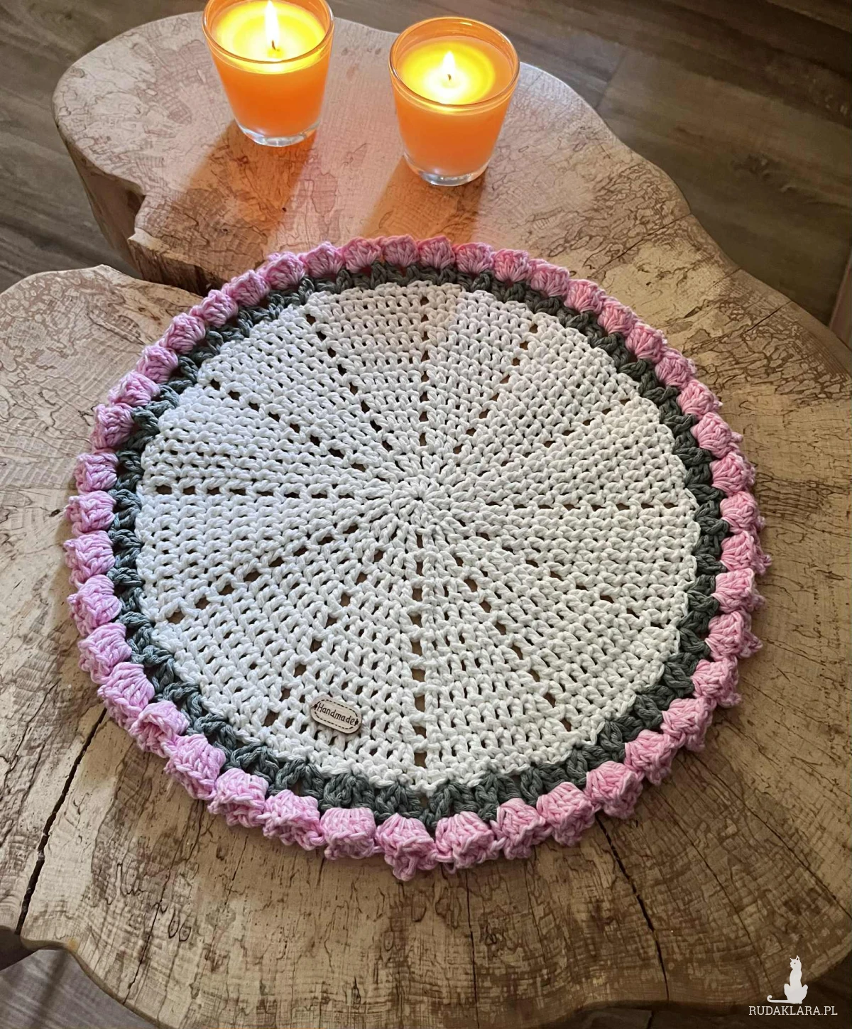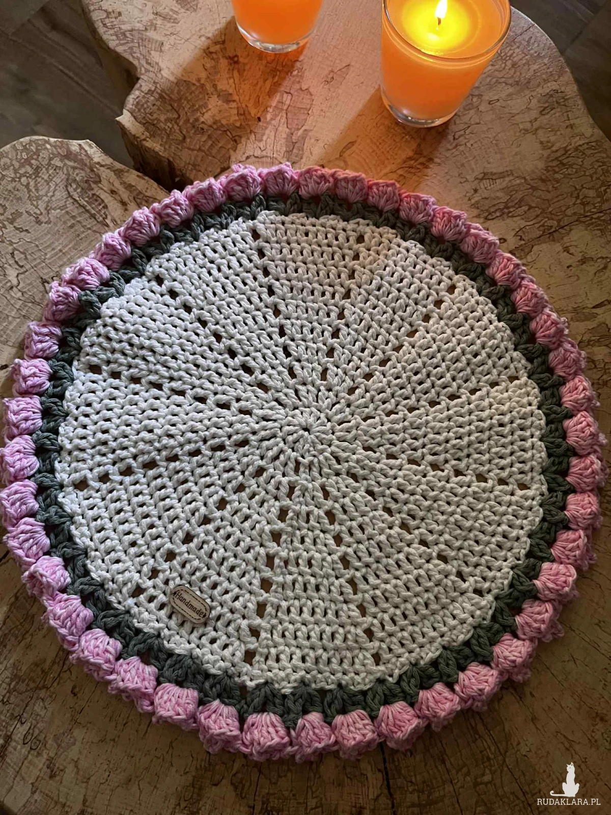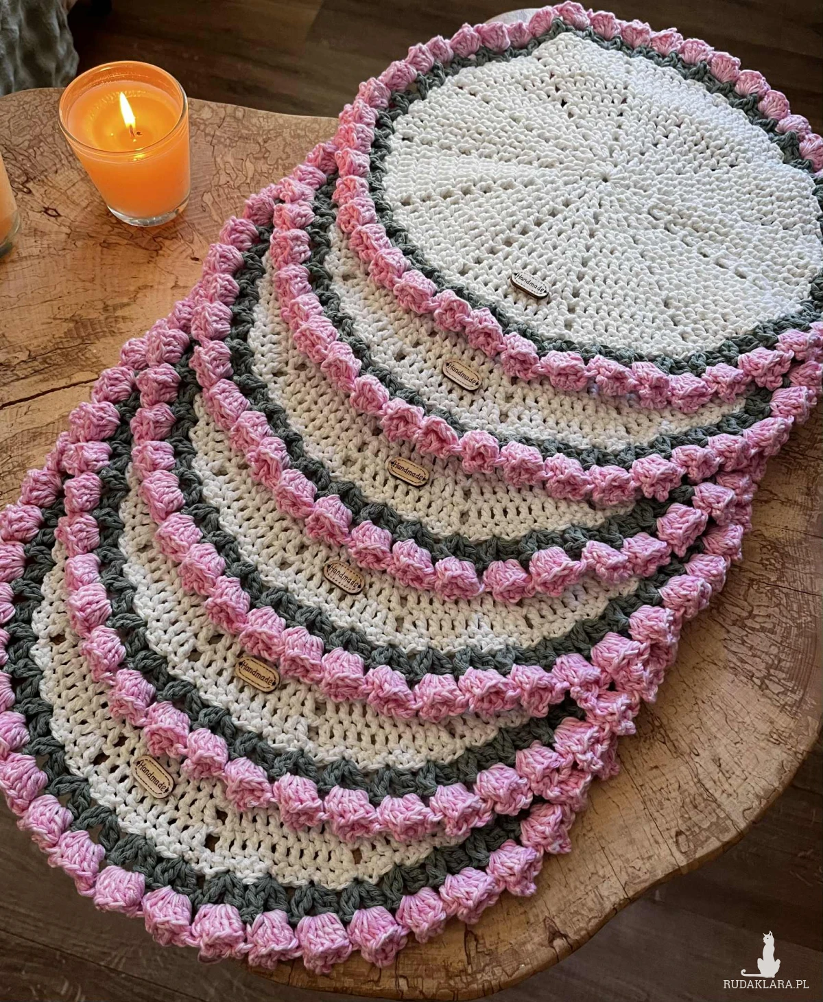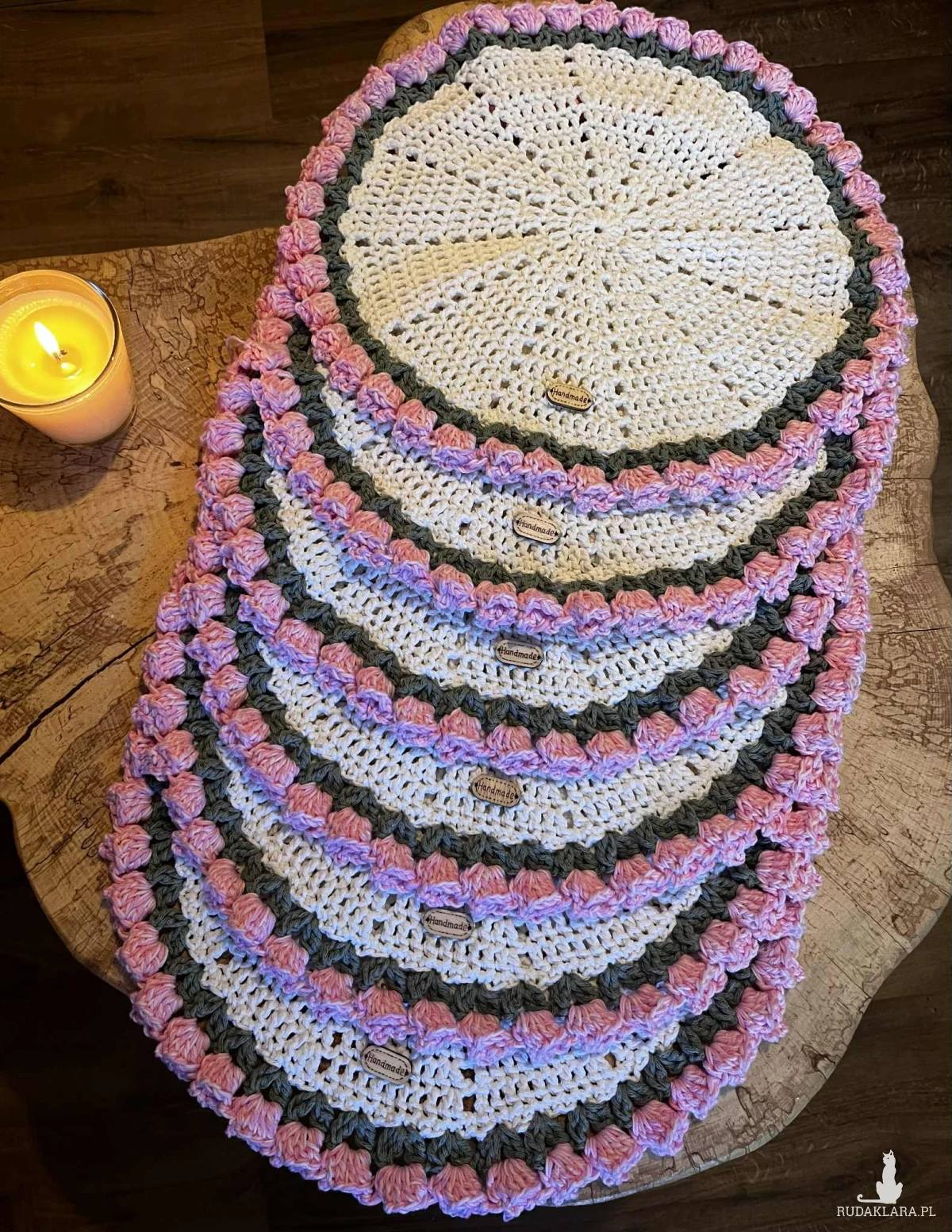6 szydełkowych podkładek na stół zrobione z bawełnianego sznurka 2mm.Średnica podkładki 35cm.100%rękodzielo. Polecam serdecznie.
