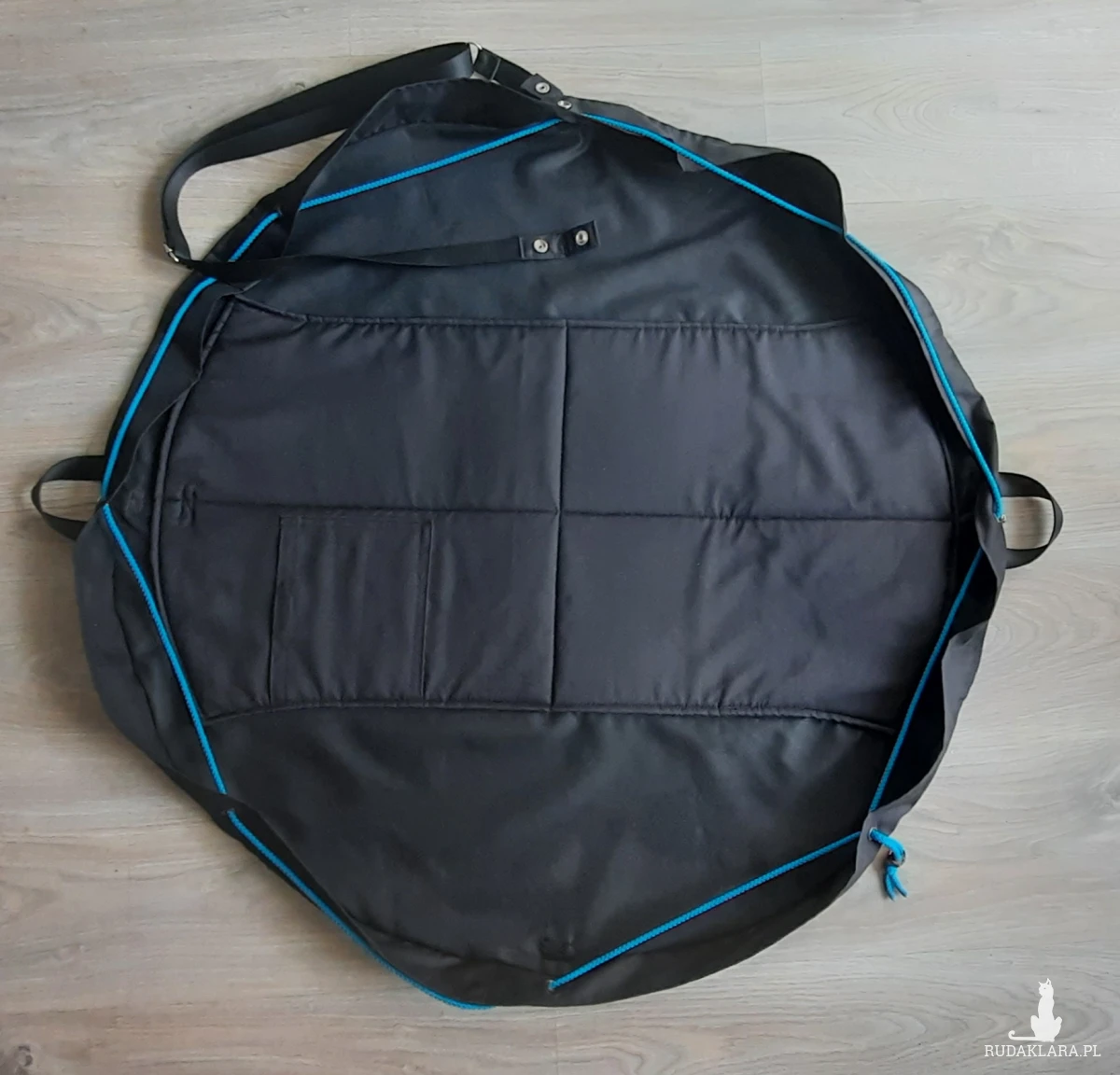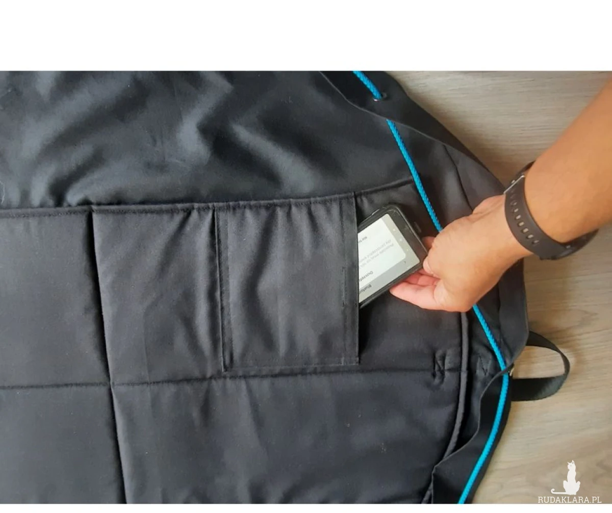 Matę możesz zamienić na torbę lub plecak, dzięki odpinanemu paskowi. Z łatwością pomieścisz w niej swoje mokre rzeczy ( buty, spodnie, ręcznik i inne akcesoria). Mata posiada Wewnętrzna kieszonke w którą możesz schować telefon lub klucze.