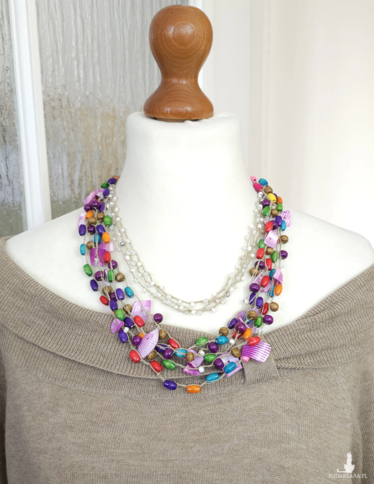 Ożyw swój styl z tym ręcznie robionym, wielowarstwowym naszyjnikiem! To idealny dodatek dla każdej kobiety, która ceni sobie unikatowe i pełne życia akcesoria. Naszyjnik składa się z misternie splecionych sznurów lnianych, zdobionych barwnymi, błyszczącymi szklanymi koralikami oraz naturalnymi, drewnianymi koralikami o różnych rozmiarach (4-10 mm). Całość dopełniają urocze, cięte muszelki w intensywnym, fioletowym odcieniu, które dodają biżuterii letniego, wakacyjnego klimatu. Doskonały do letnich sukienek, topów i casualowych stylizacji. Materiały: len, szklane i drewniane koraliki (4-10 mm), muszelki cięte. 8 sznurków. Obwód: 53 cm plus 5 cm regulacji. Zapięcie antyalergiczne (bez niklu, kadmu i ołowiu). Ostatnie zdjęcie to symulacja Ai.