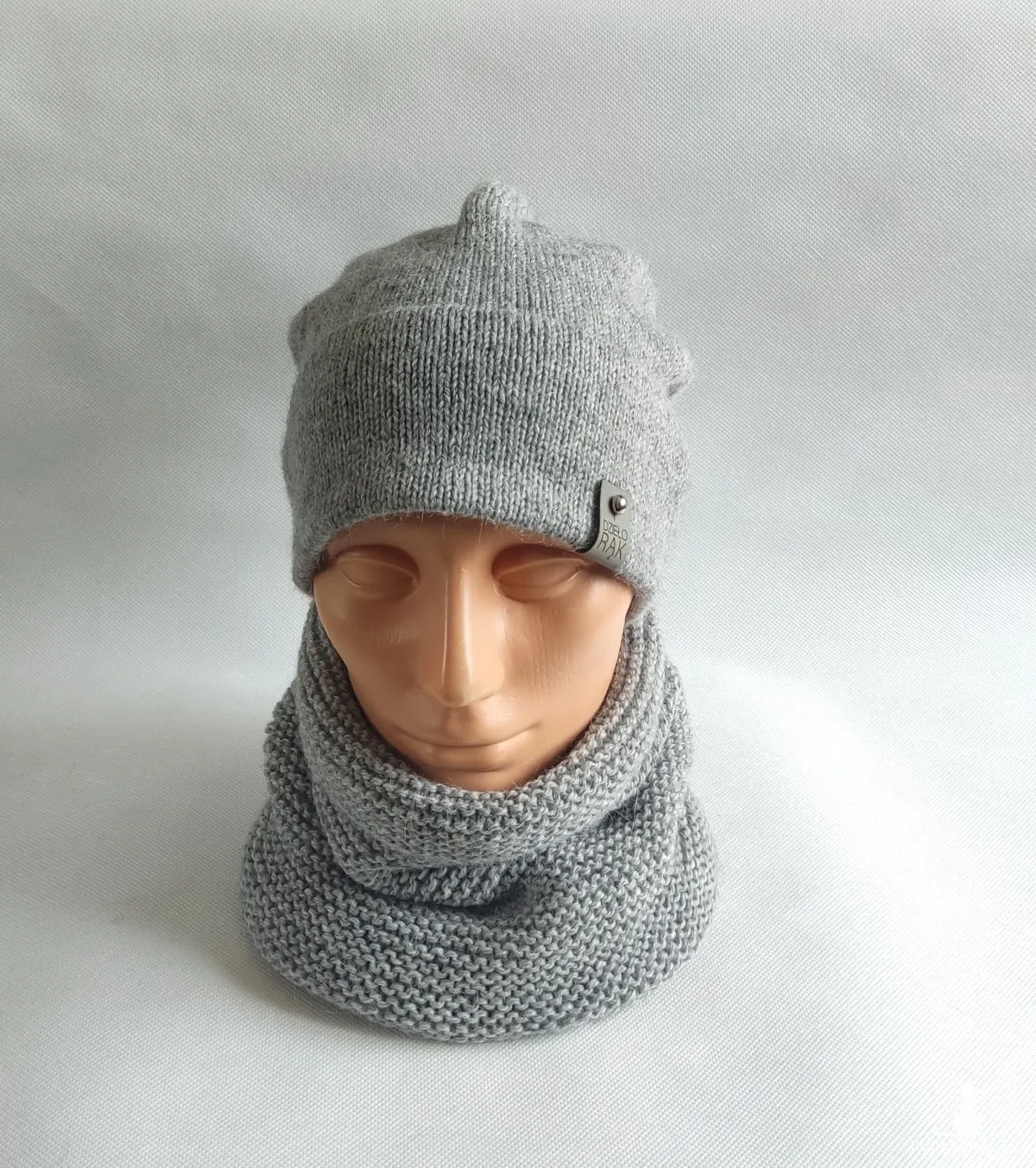 W skład zestawu wchodzi komin tuba i czapka o klasycznym fasonie, na szerokim podwójnym podwinięciu, dopasowującym się do kształtu głowy.