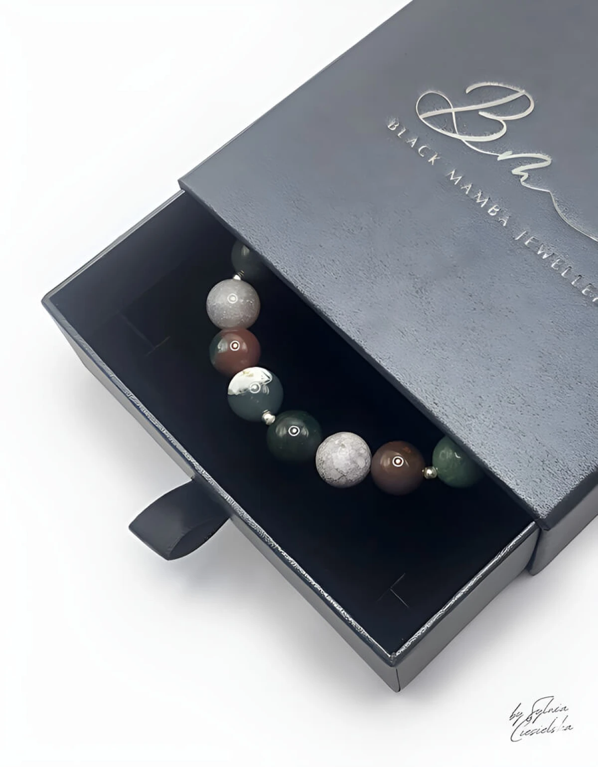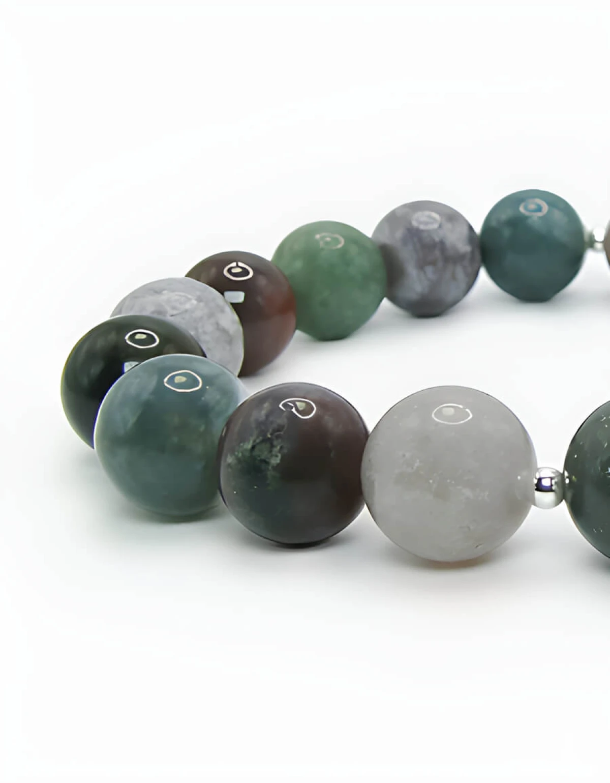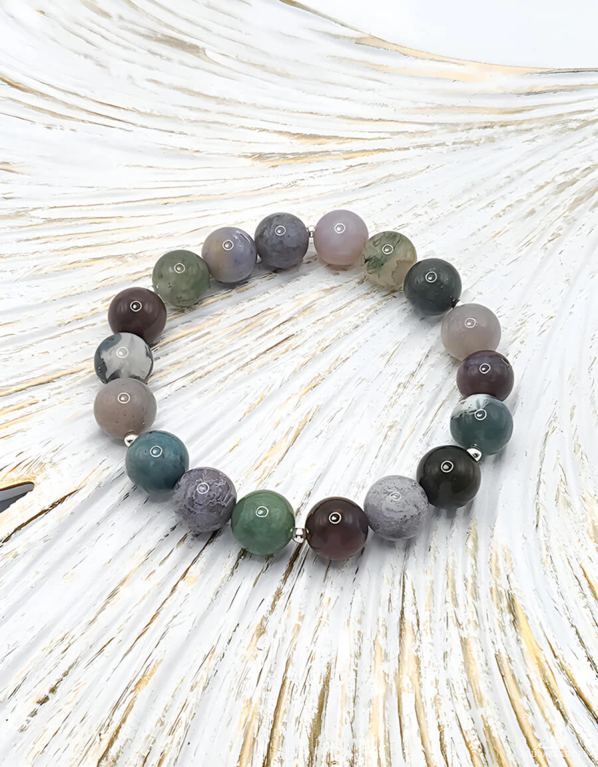 Agat indyjski, znany ze swoich subtelnych, ziemistych barw i delikatnych wzorów, jest kamieniem, który od wieków ceniono za jego właściwości ochronne i uzdrawiające. Jego naturalne piękno sprawia, że każda bransoletka jest niepowtarzalna, co dodaje jej jeszcze większej wartości.