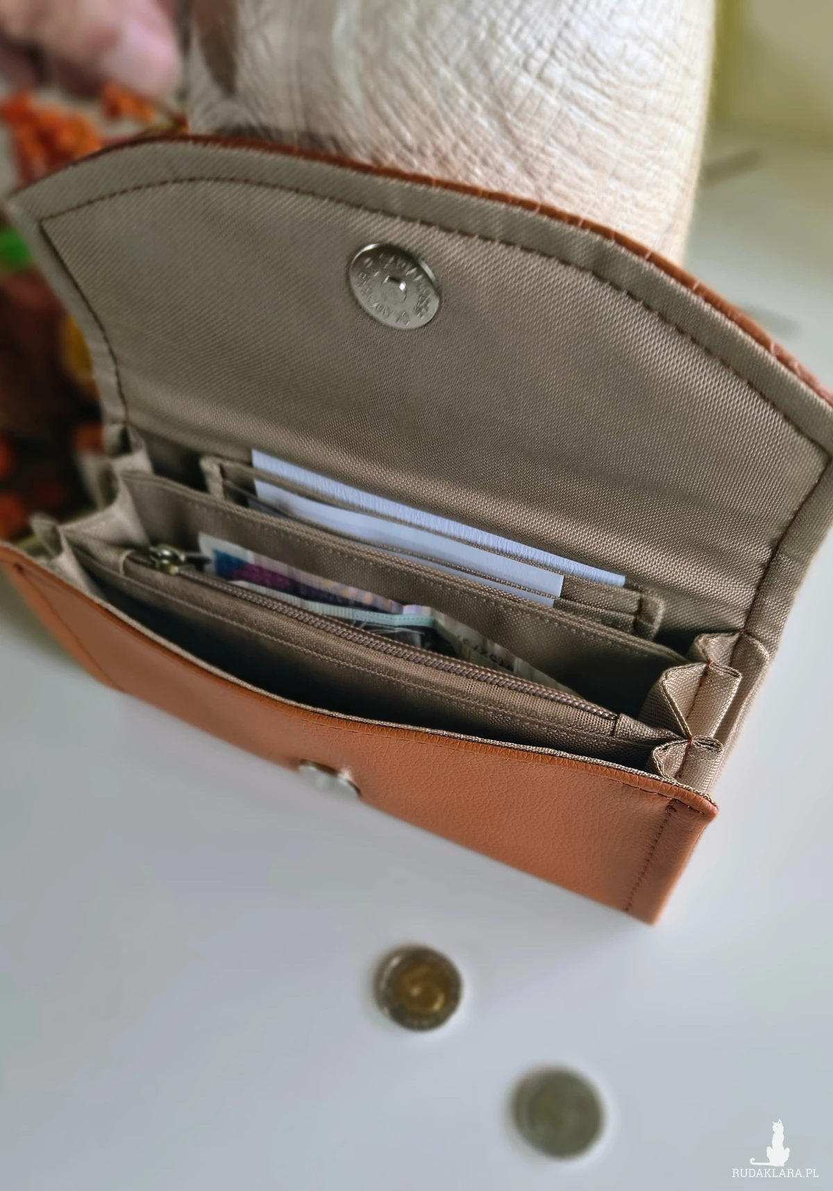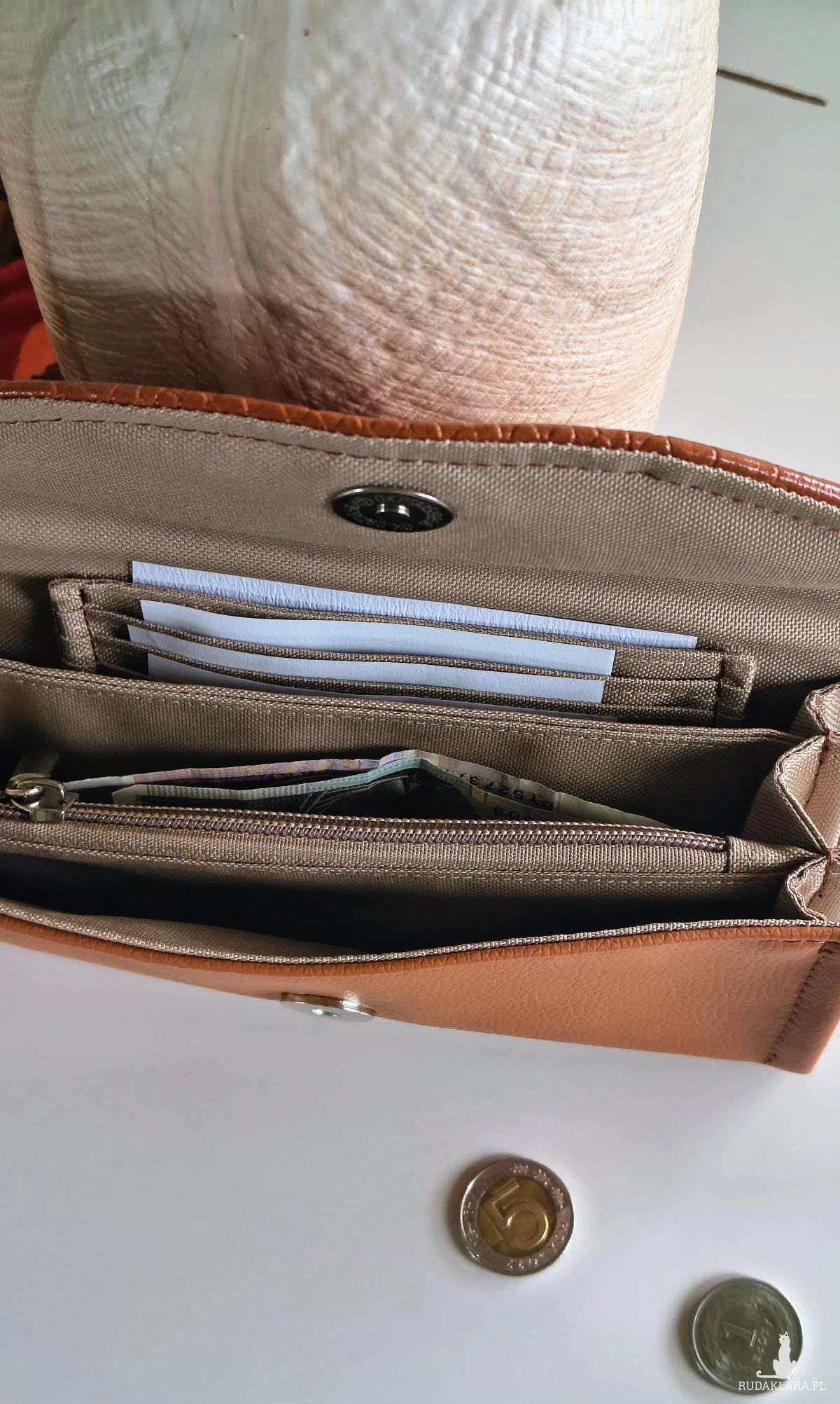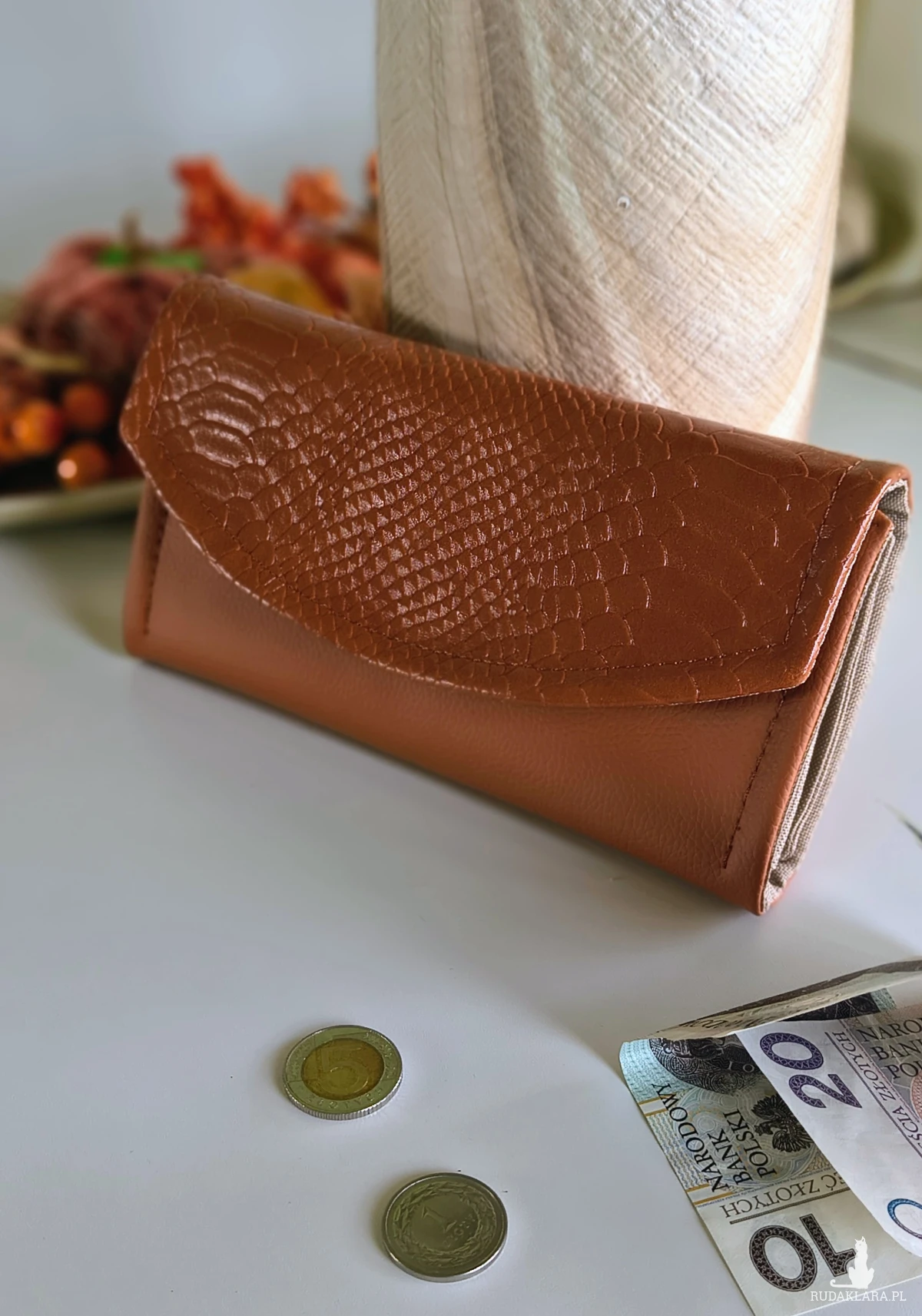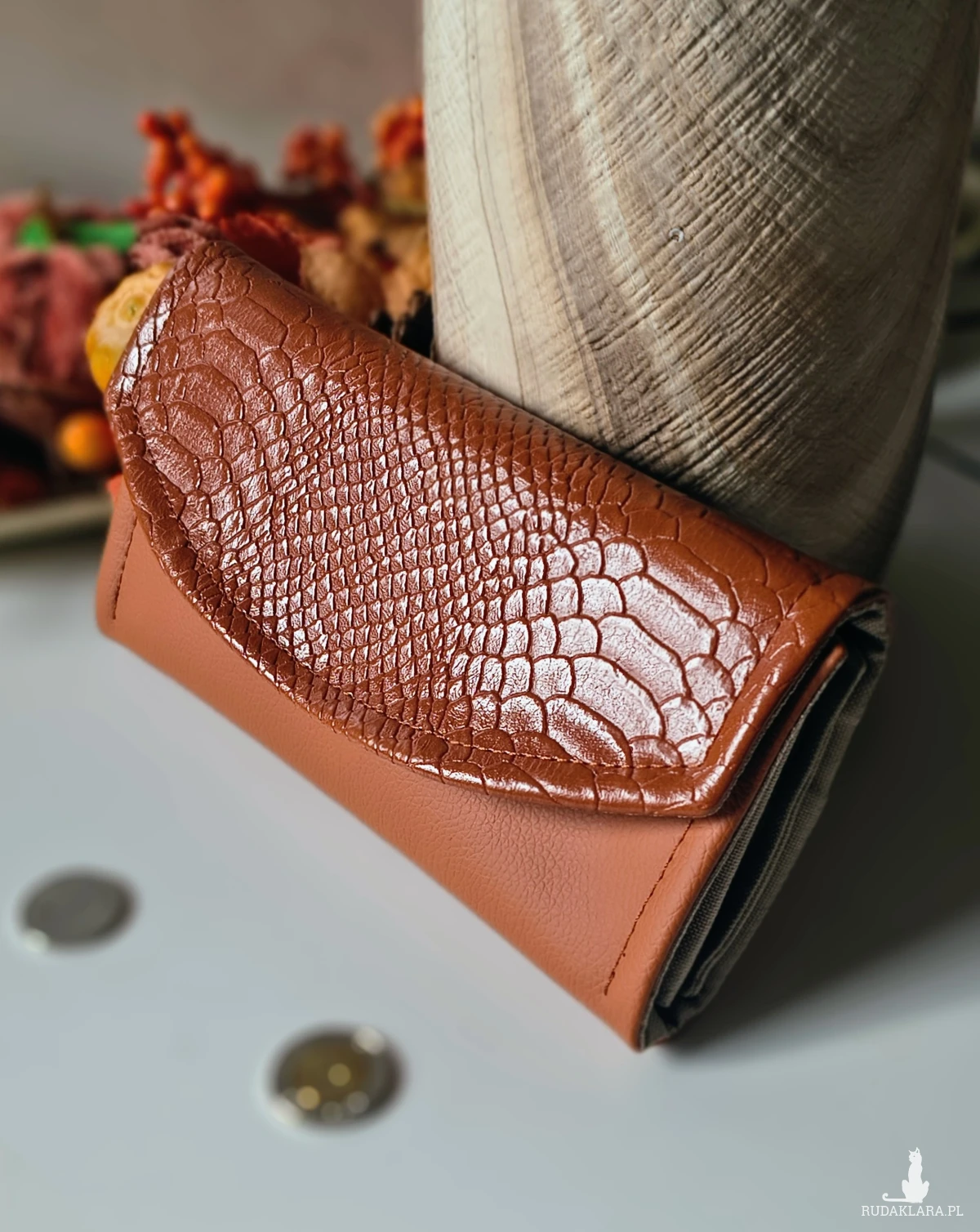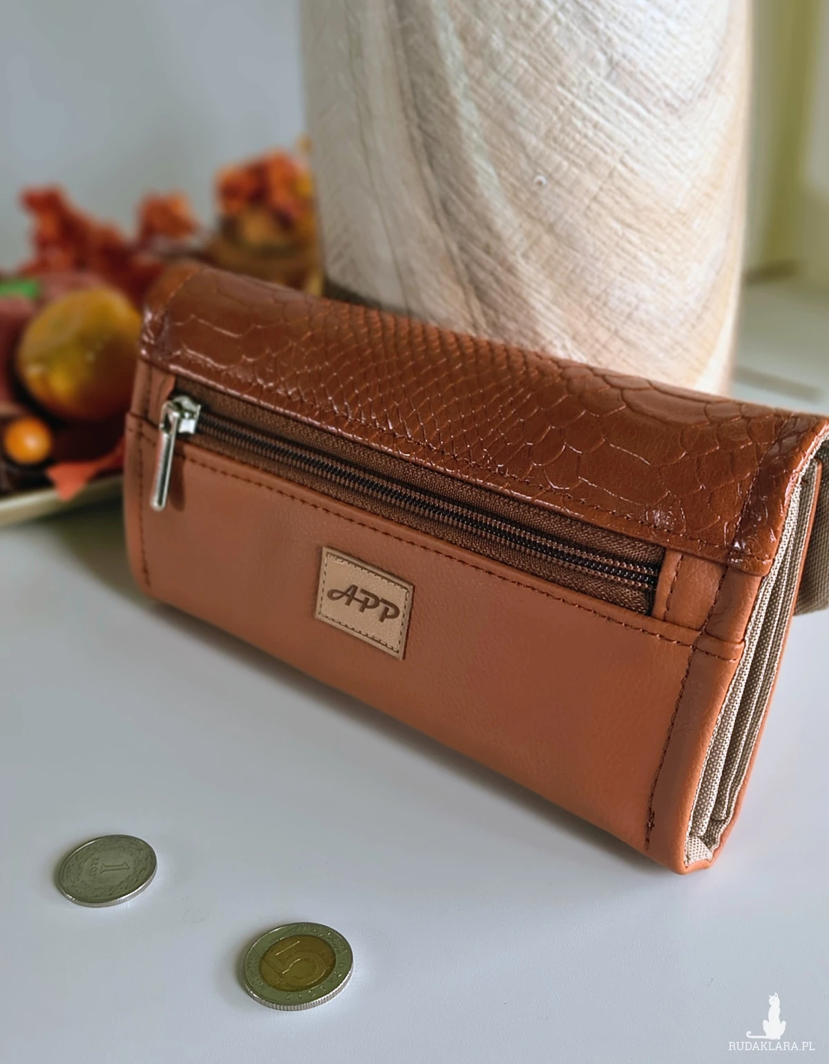 Przedstawiam duży portfel w kolorze rudym, wykonany z dwóch rodzajów ekoskóry..