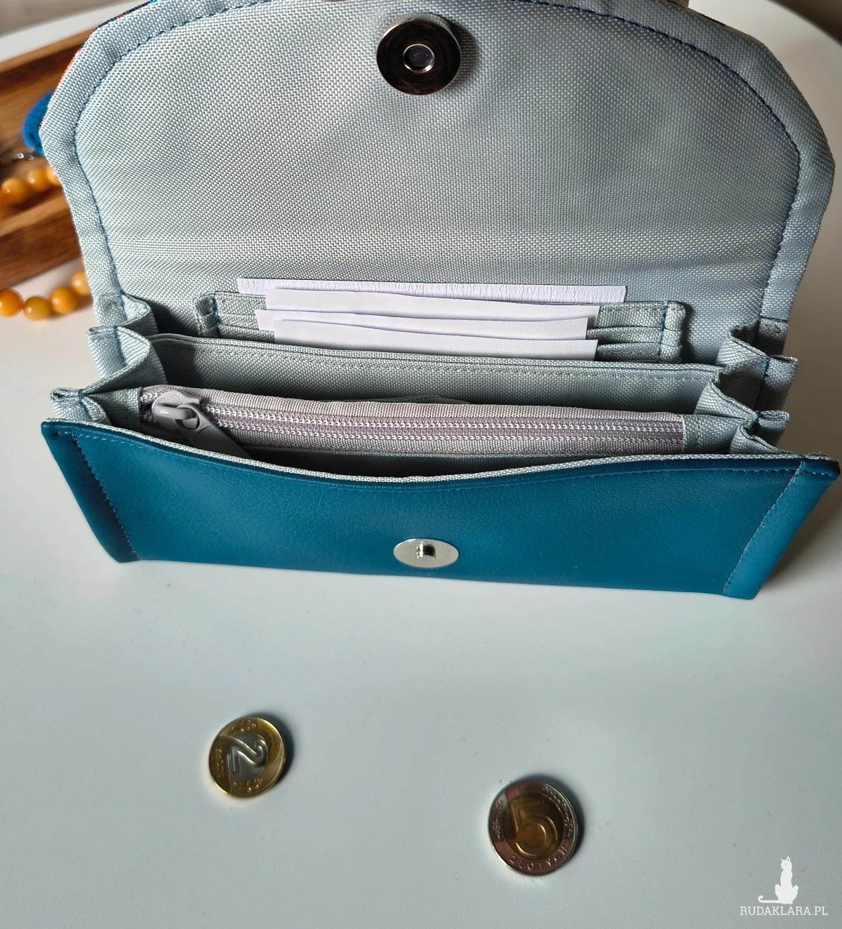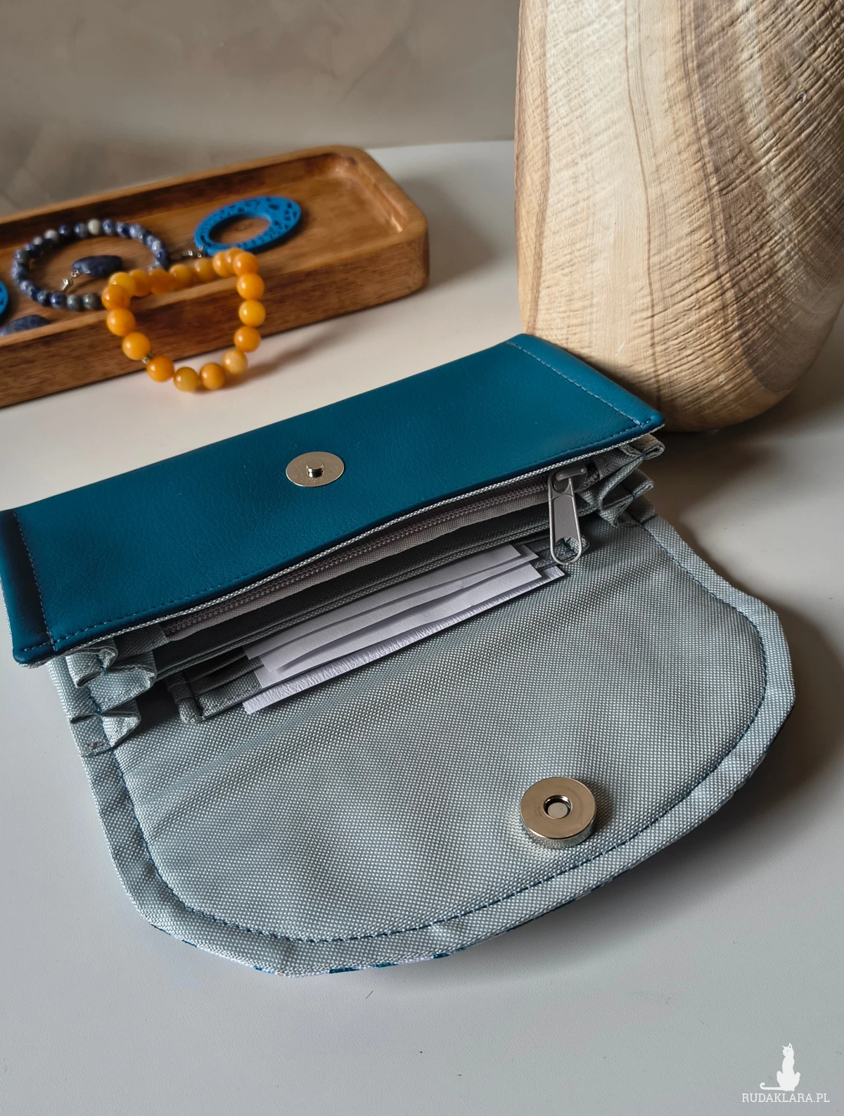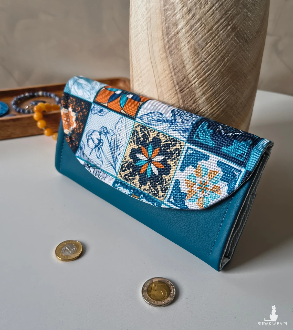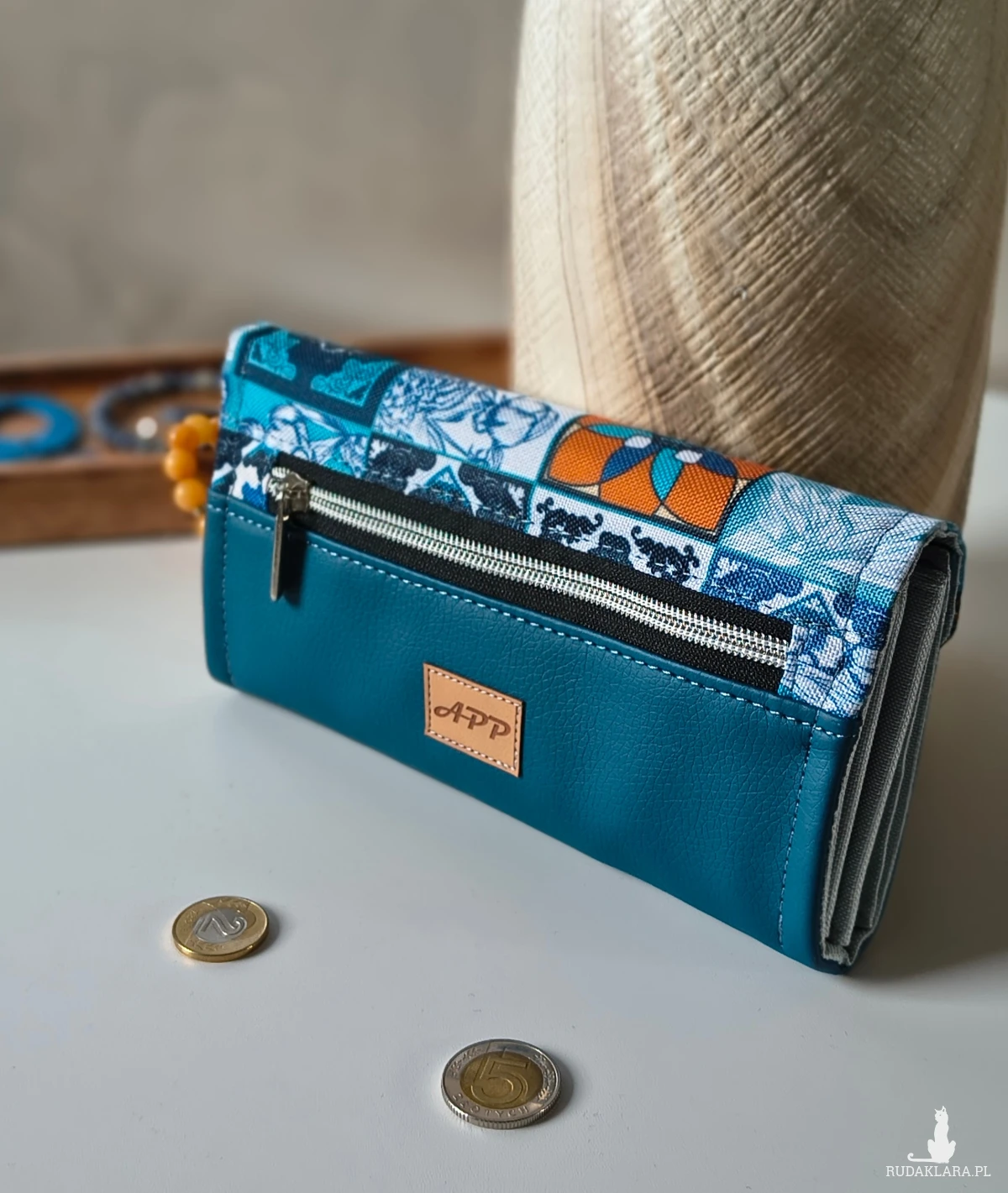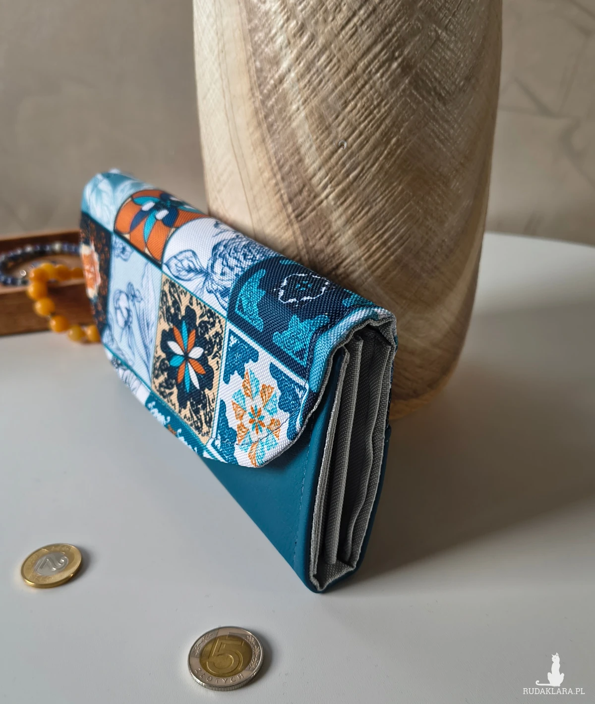 Przedstawiam duży, praktyczny i oryginalny portfel. Wykonany został z ekoskóry w kolorze turkusowym, a klapka z materiału wodoodpornego w geometryczny wzór. Środek portfela wykonany z materiału wodoodpornego.