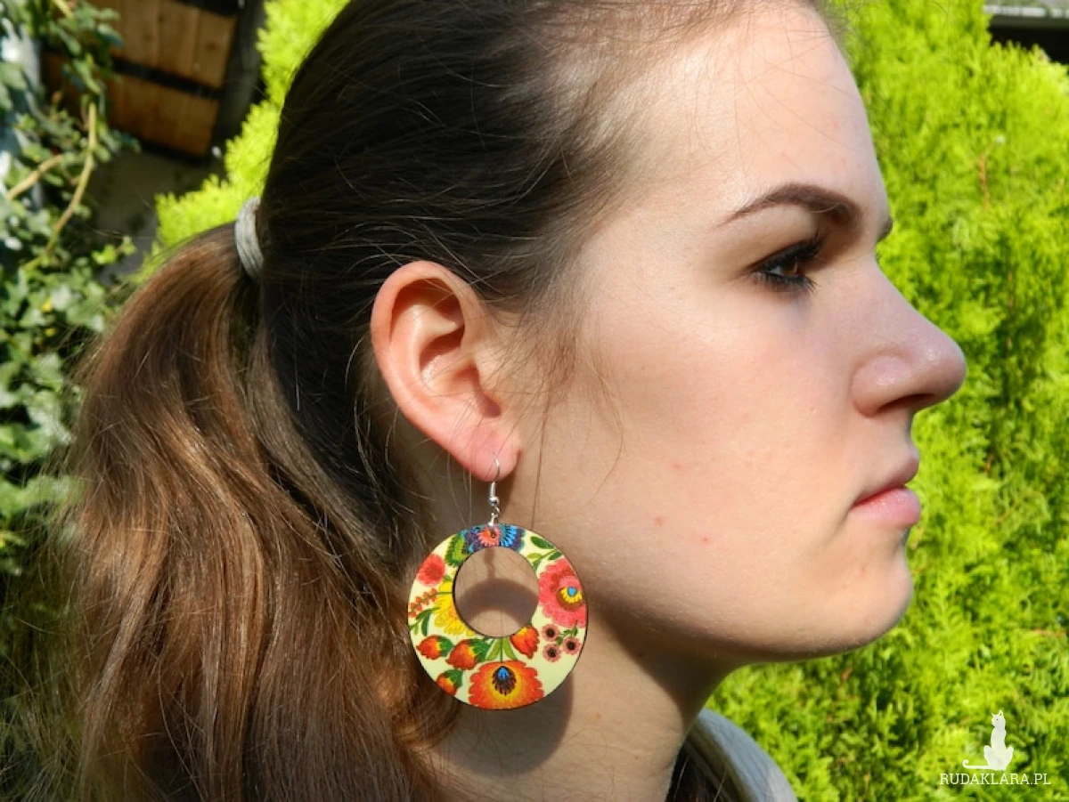 Lekkie, drewniane kolczyki, zdobione dwustronnie metodą decoupage’u. Wielokrotnie pokryte lakierem akrylowym w celu zabezpieczenia i zapewnienia trwałości. Kilkakrotnie szlifowane, dzięki czemu mają jedwabistą, miłą w dotyku fakturę. Bigle antyalergiczne. Średnica: 5 cm.