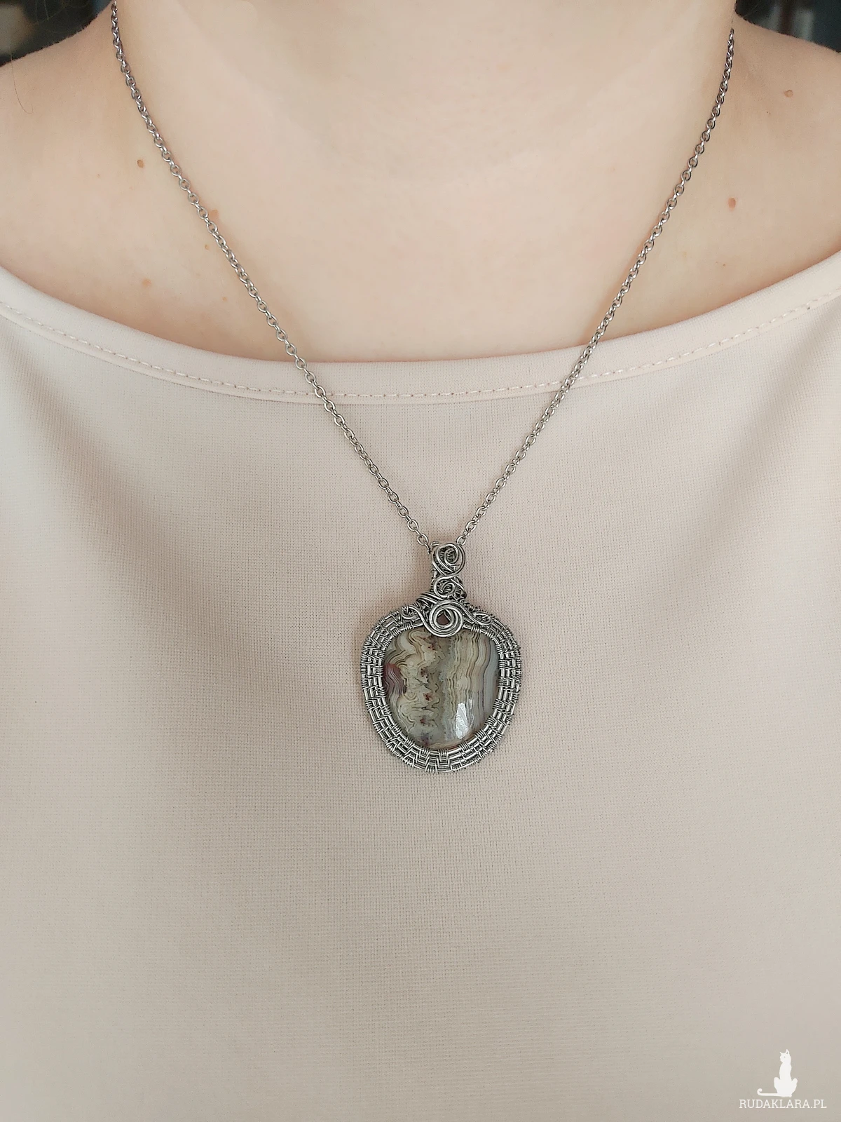 Naszyjnik Agat Crazy Lace ręcznie robiony. Wykonany techniką wire wrapping z drutów ze stali chirurgicznej.