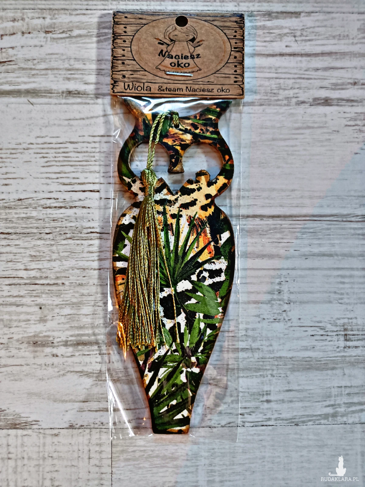 Drewniana zakładka do książki w kształcie sowy, zdobiona dwustronnie techniką decoupage.