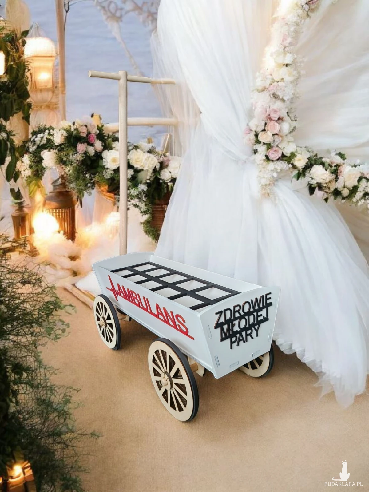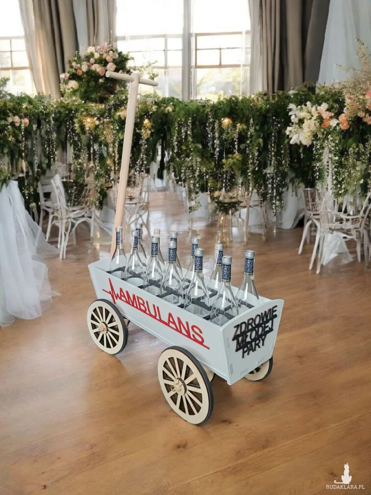Wózek na alkohol i inne trunki / WÓDKOWÓZ WESELNY na alkohol  mieści w sobie 12 butelek,  a dzięki zamieszonym w środku komorom każda  z wstawianych butelek  jest zabezpieczona przed ewentualnym obijaniem się i stłuczeniem.