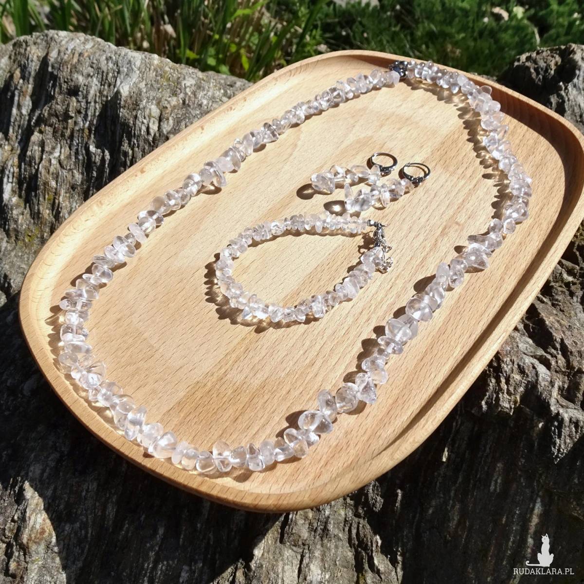 Komplet z sieczki z kryształu górskiego wielkości 4-8mm i elementów ze stali szlachetnej. W komplecie długi naszyjnik, bransoletka z zapięciem i kolczyki. Długość naszyjnika – 61cm, bransoletki – 17cm + przedłużka 3cm, kolczyków – ok. 5,1cm.