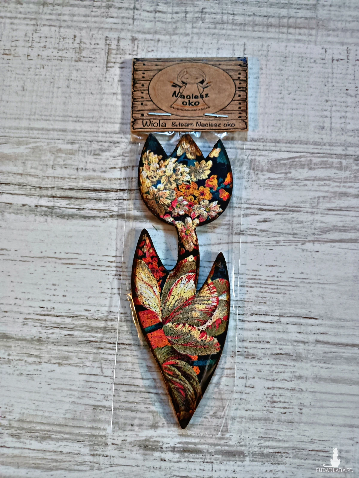 Drewniana zakładka do książki, zdobiona dwustronnie techniką decoupage.