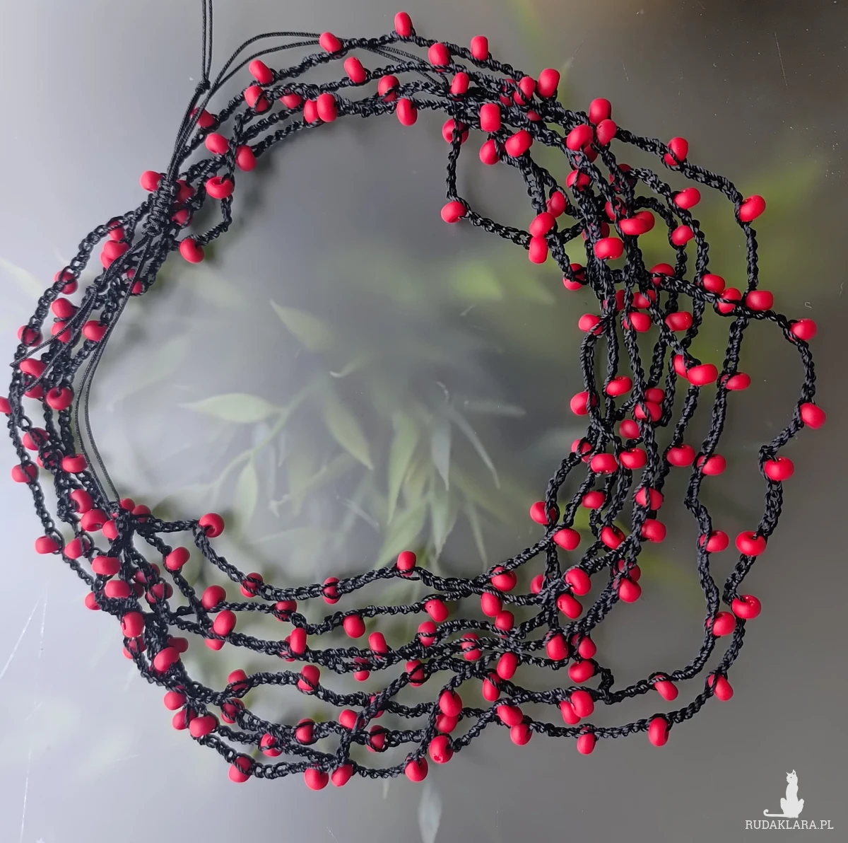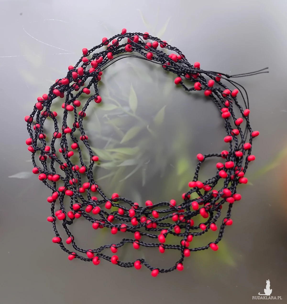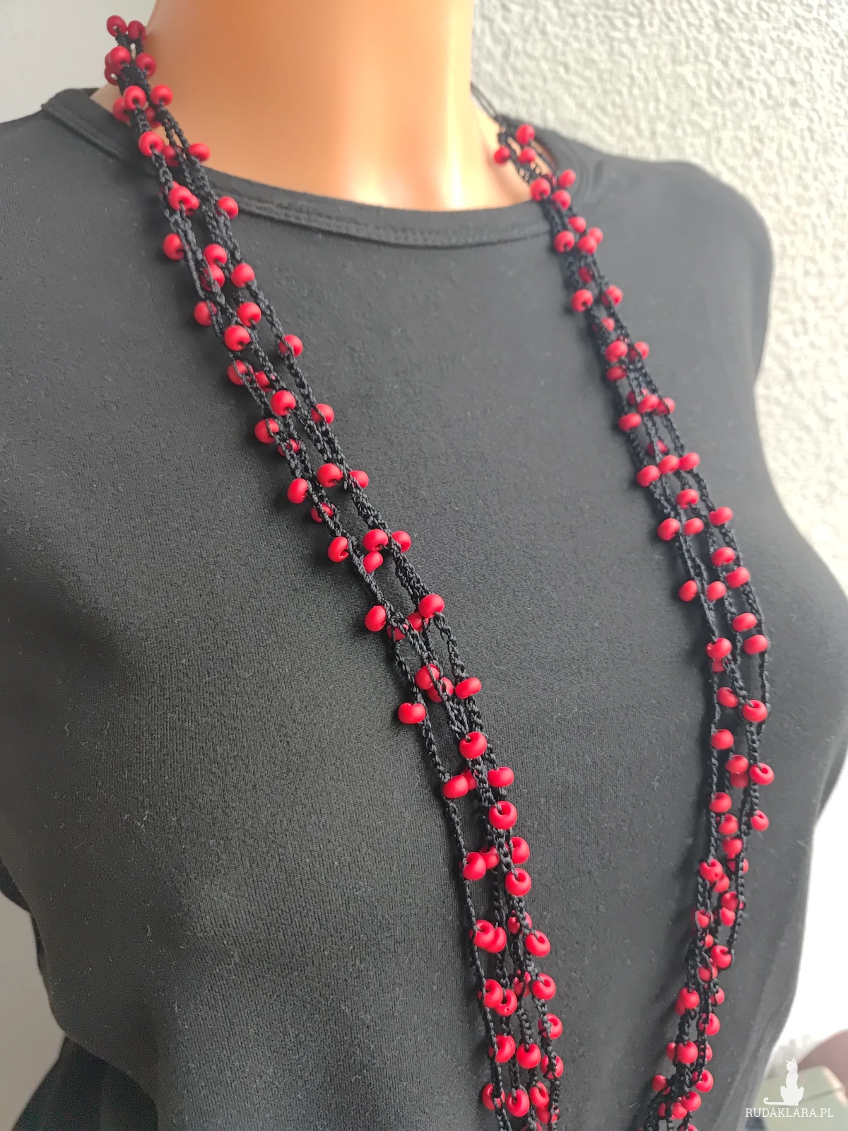Naszyjnik dlugi wypleciony na czarnym cienkim sznureczku. Korale czerwone matowe. Naszyjnik długi 50 cm,